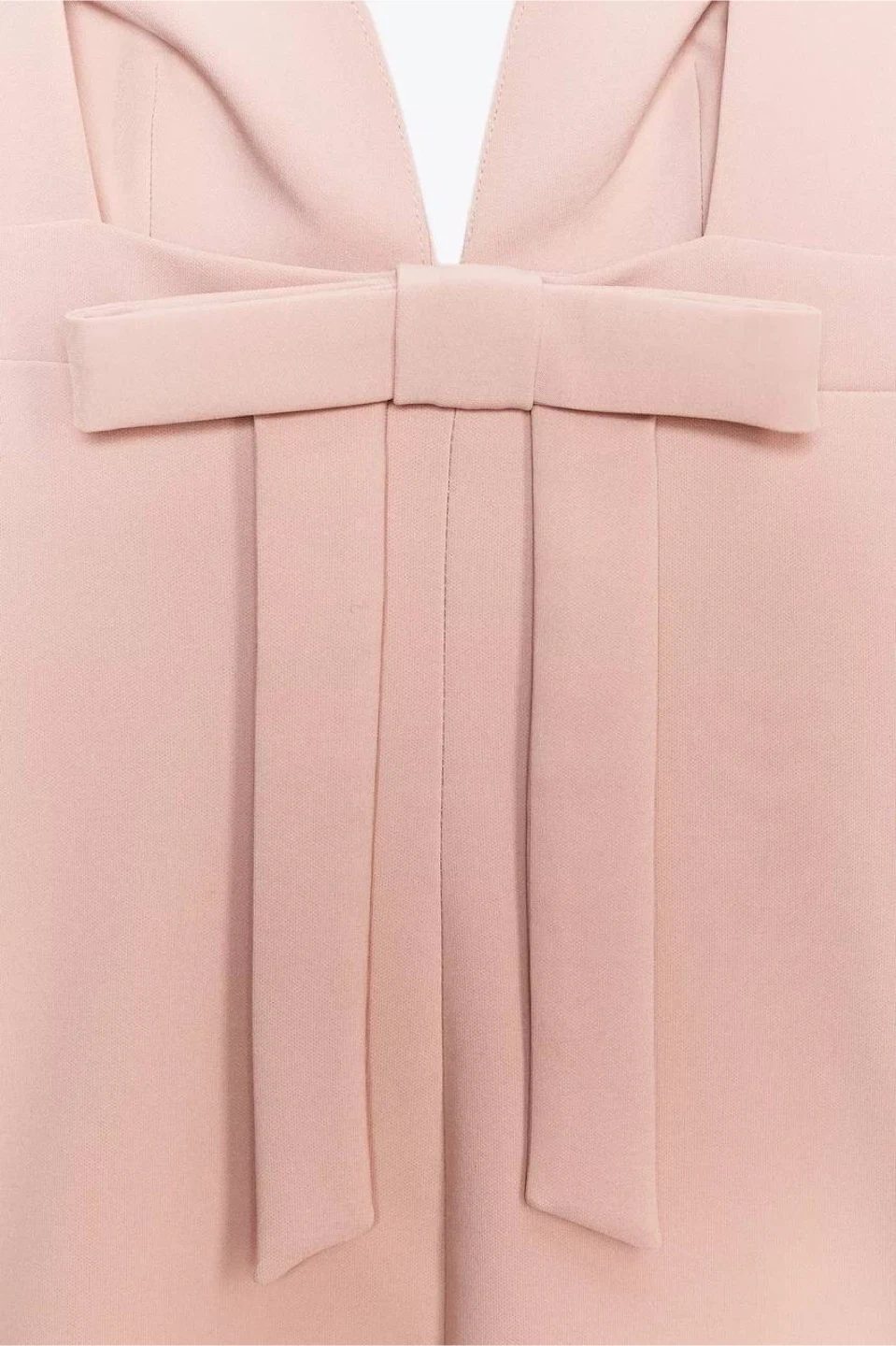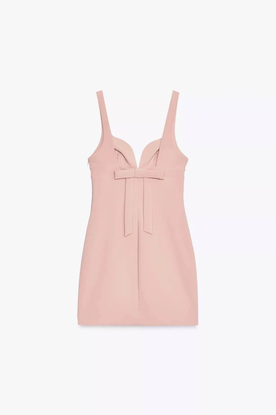 Elegant short dress with a sweetheart neckline and straps. Features a tonal inner lining and a matching fabric bow detail at the back. Hidden in-seam side zip closure for a clean, flattering fit.