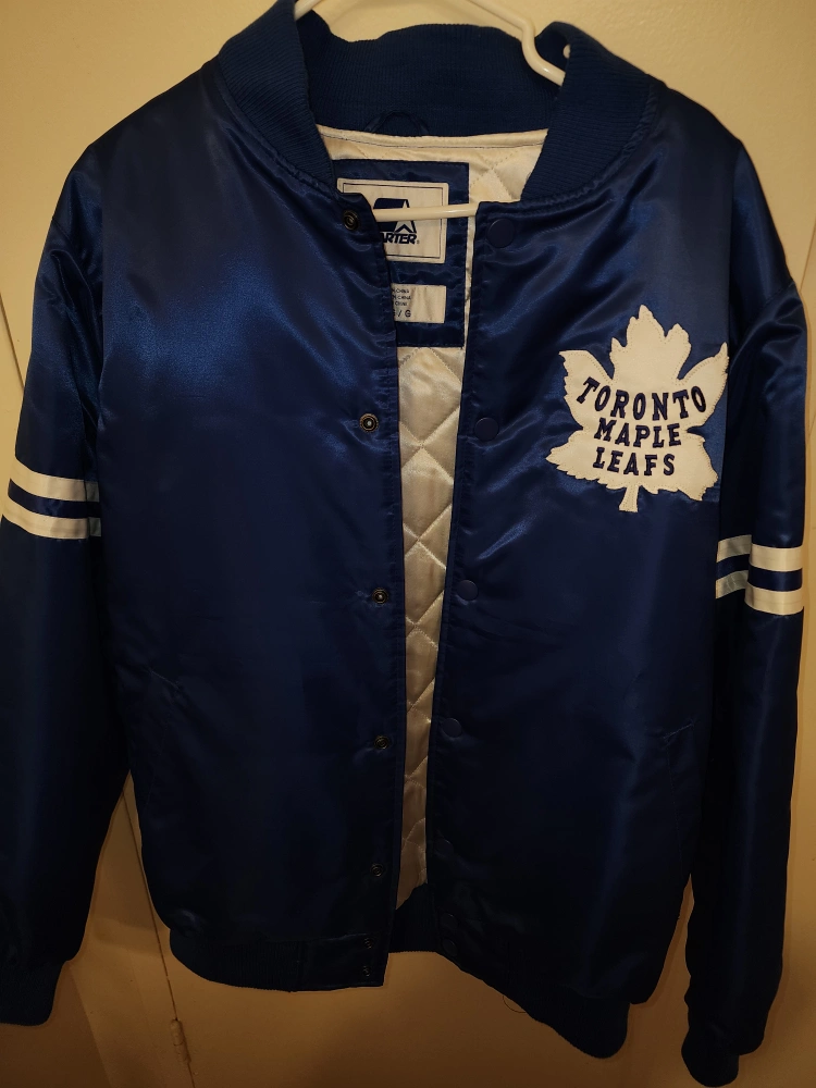 Used Size Large, blue satin bomber jacket with the Toronto Maple Leafs logo on the front and back. White stripes on the sleeves. Fully lined.