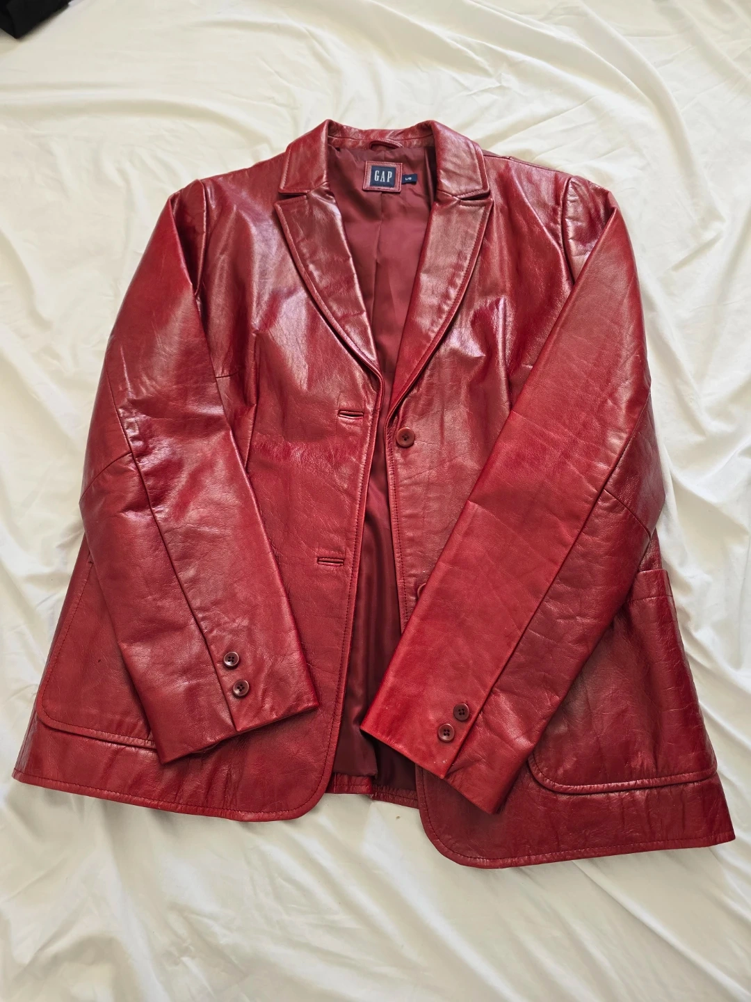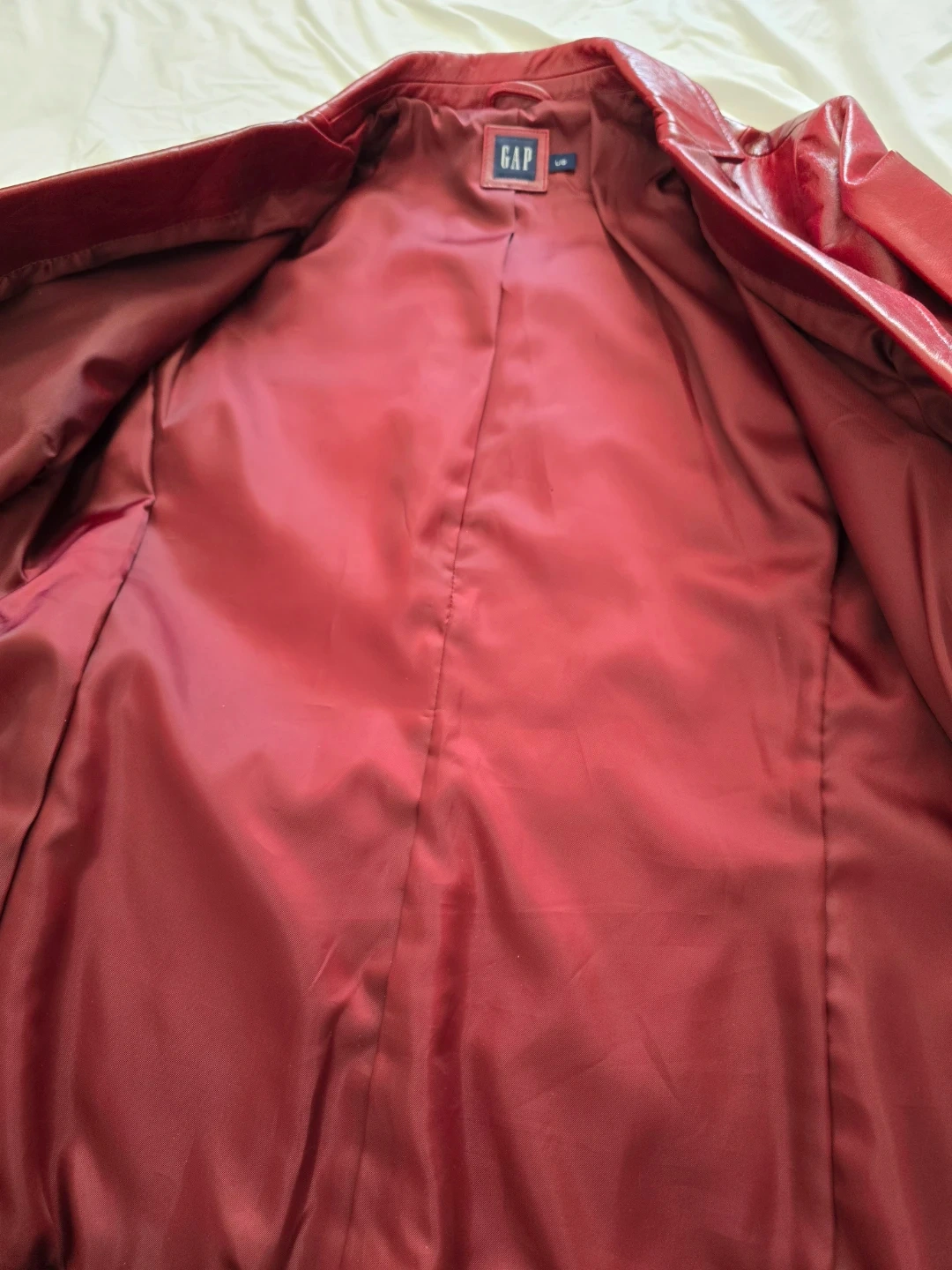 This GAP blazer is a vibrant red colour. It features a 100% leather and a silky red lining. The jacket has button closures on the front and cuffs.
