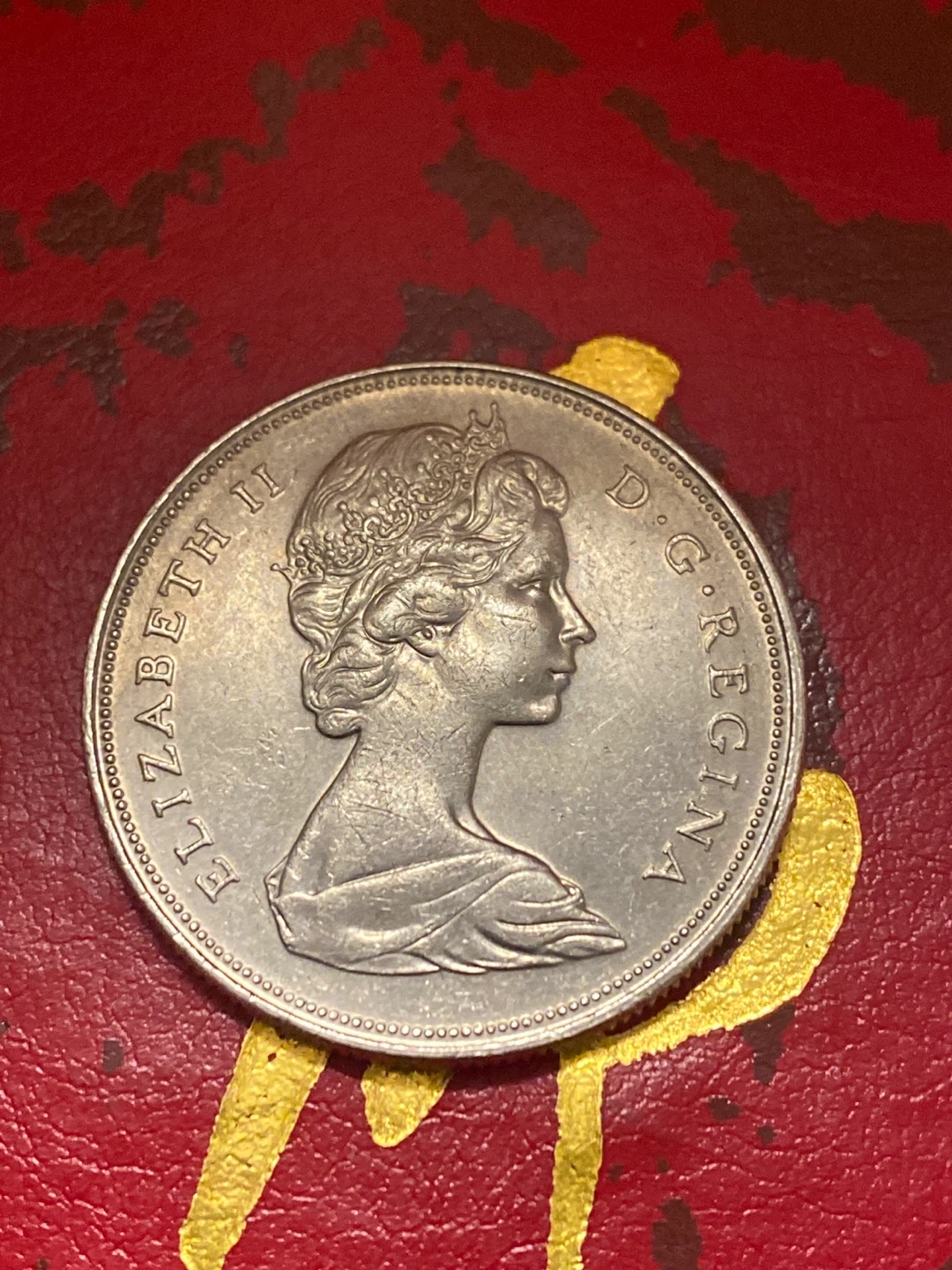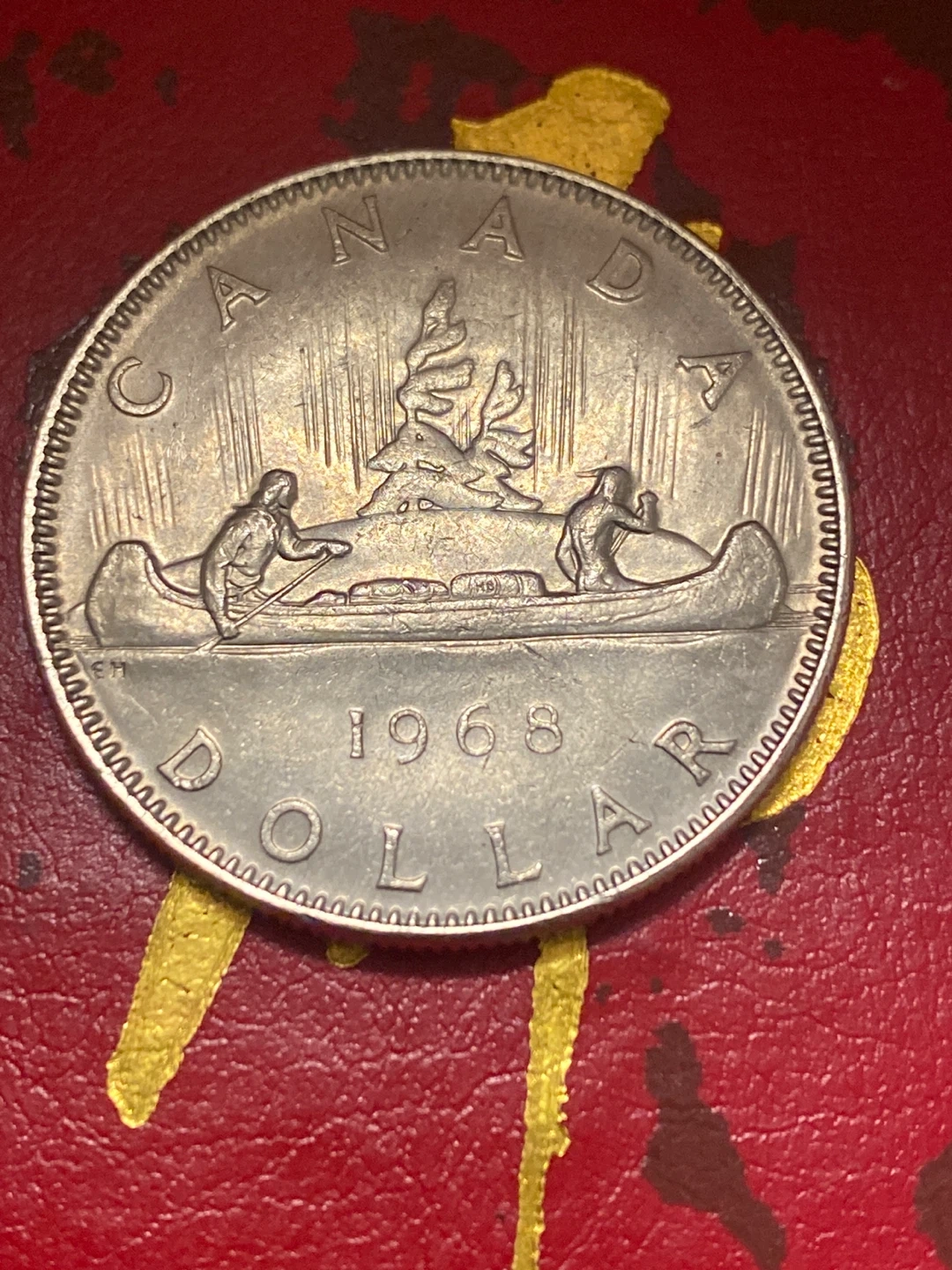 This is a 1968 Canadian dollar coin featuring Indigenous people in a canoe on one side and Queen Elizabeth II on the other. It's a collectible piece of Canadian currency.
