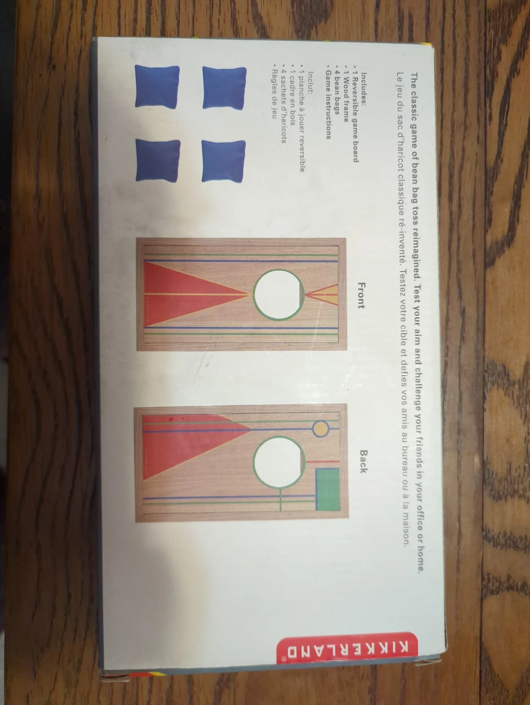 This classic game of bean bag toss is reimagined for your office or home! It includes a reversible game board, a wood frame, and four bean bags. Game instructions are also included. This compact set is perfect for a quick break or some fun indoors!