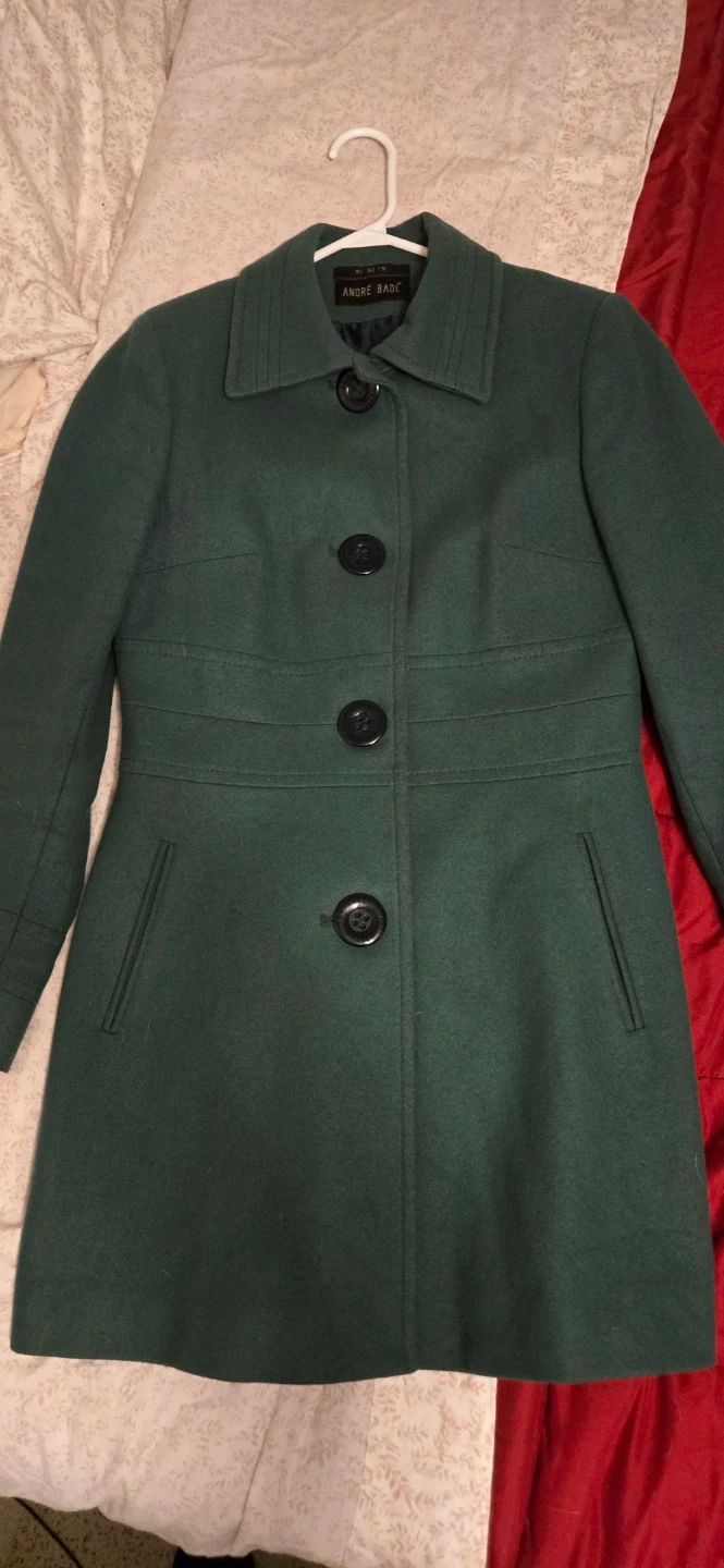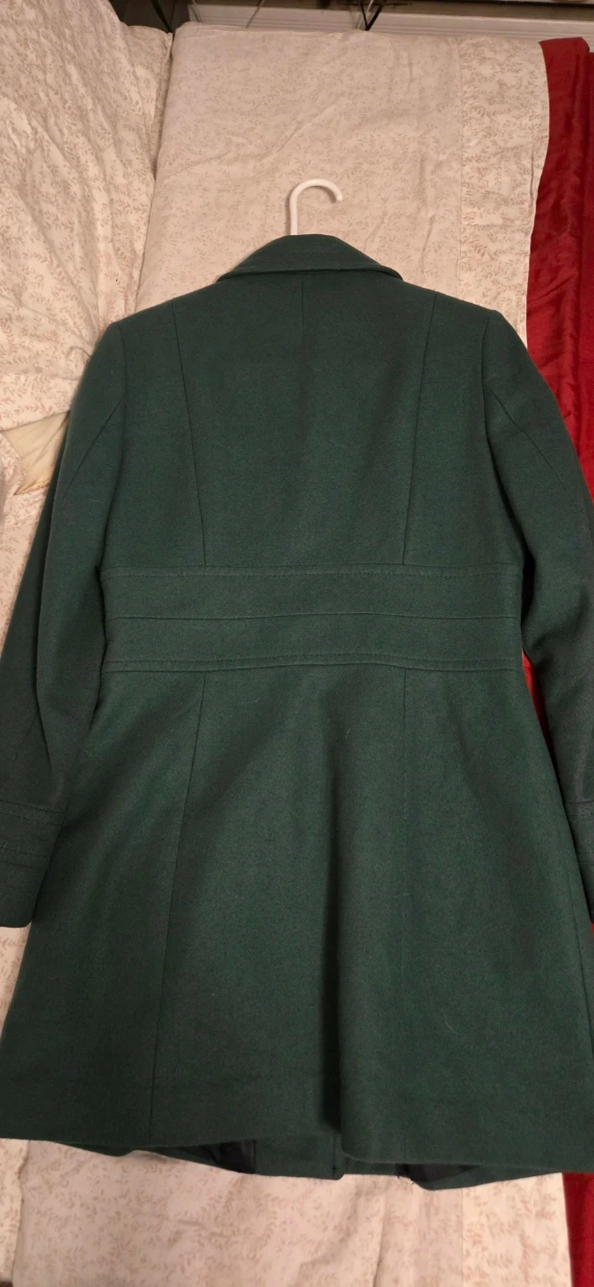 Used twice. It's a beautiful dark green colour and made from a wool blend fabric. The coat features a button-up front and a flattering cut.