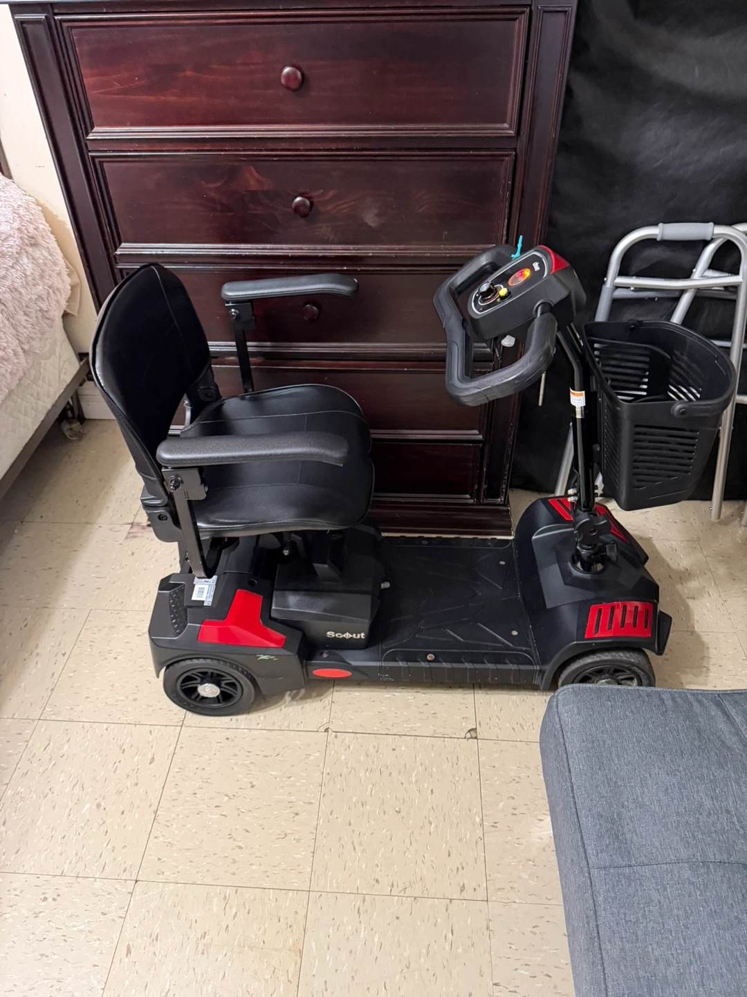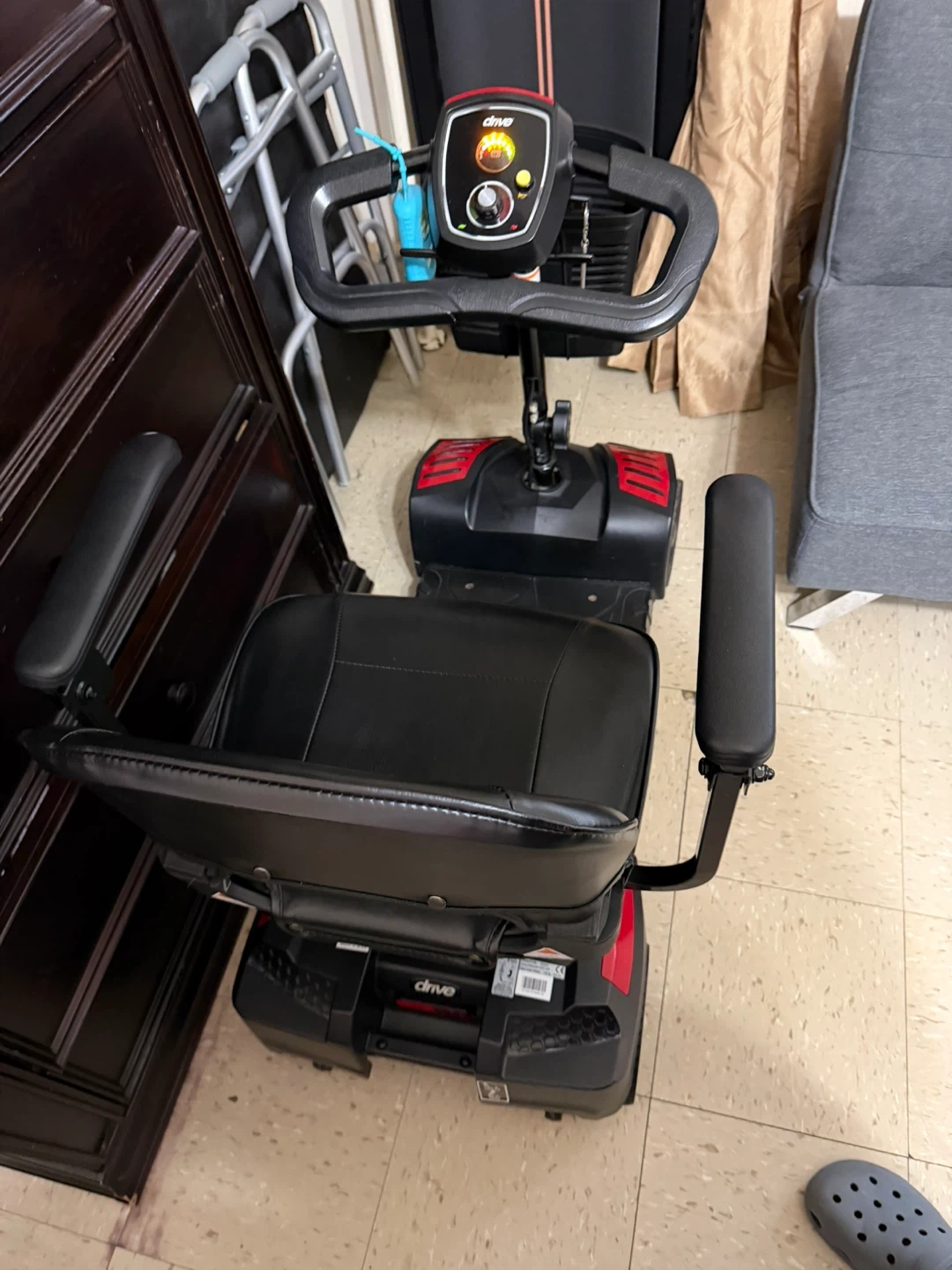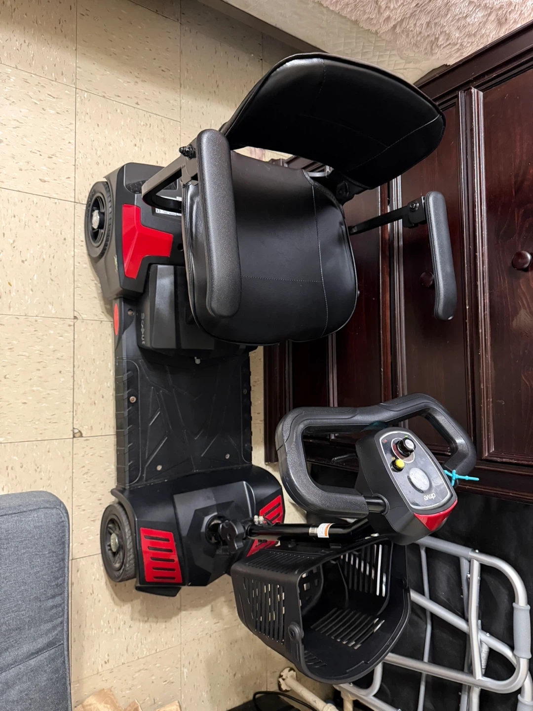 This is a Drive Medical Scout mobility scooter. It's black with red accents. Includes a front basket for storage. It's designed for ease of use and transport. It has a new lithium battery po4 12.8v 15ah