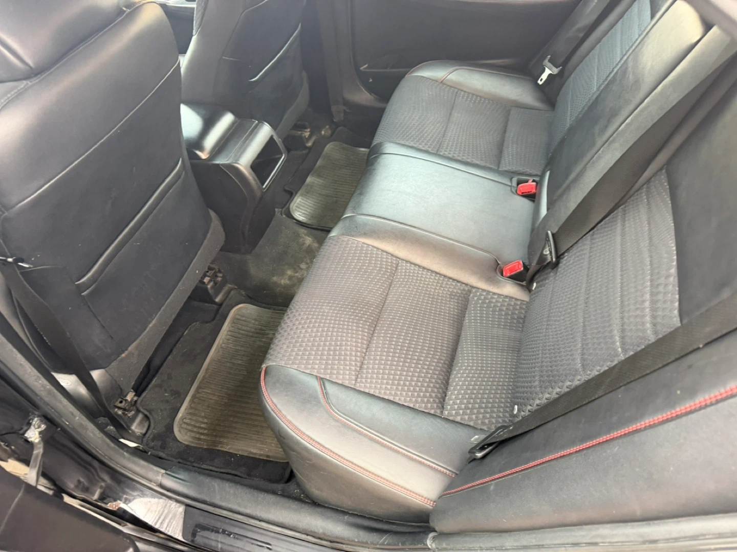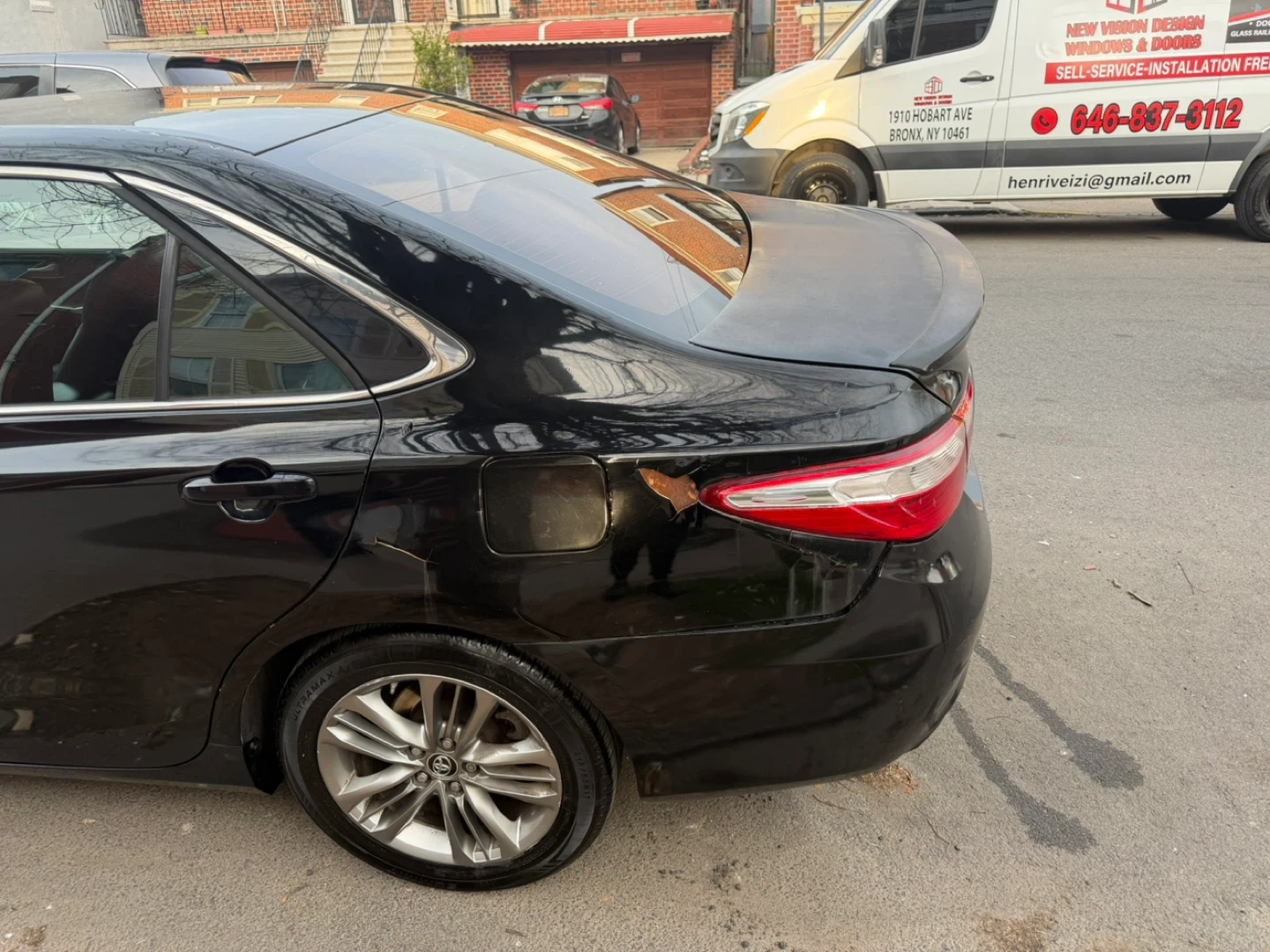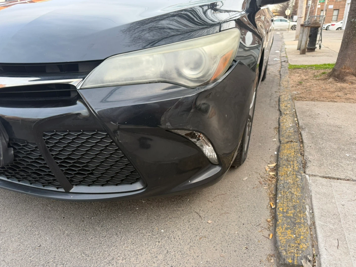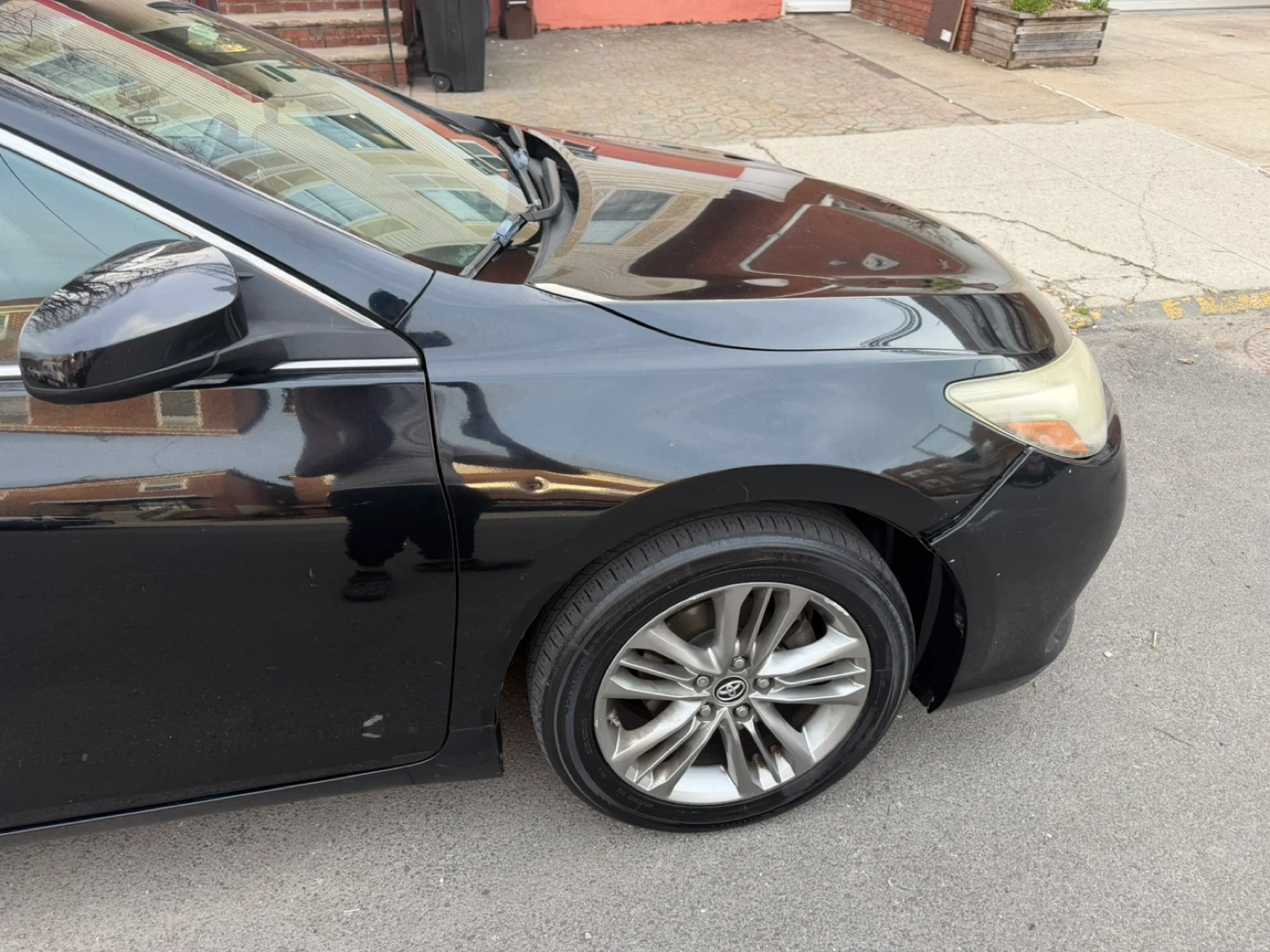 Black Toyota Camry sedan. Interior features black leather seats with red stitching. Exterior has some cosmetic damage on the front bumper and passenger side door.