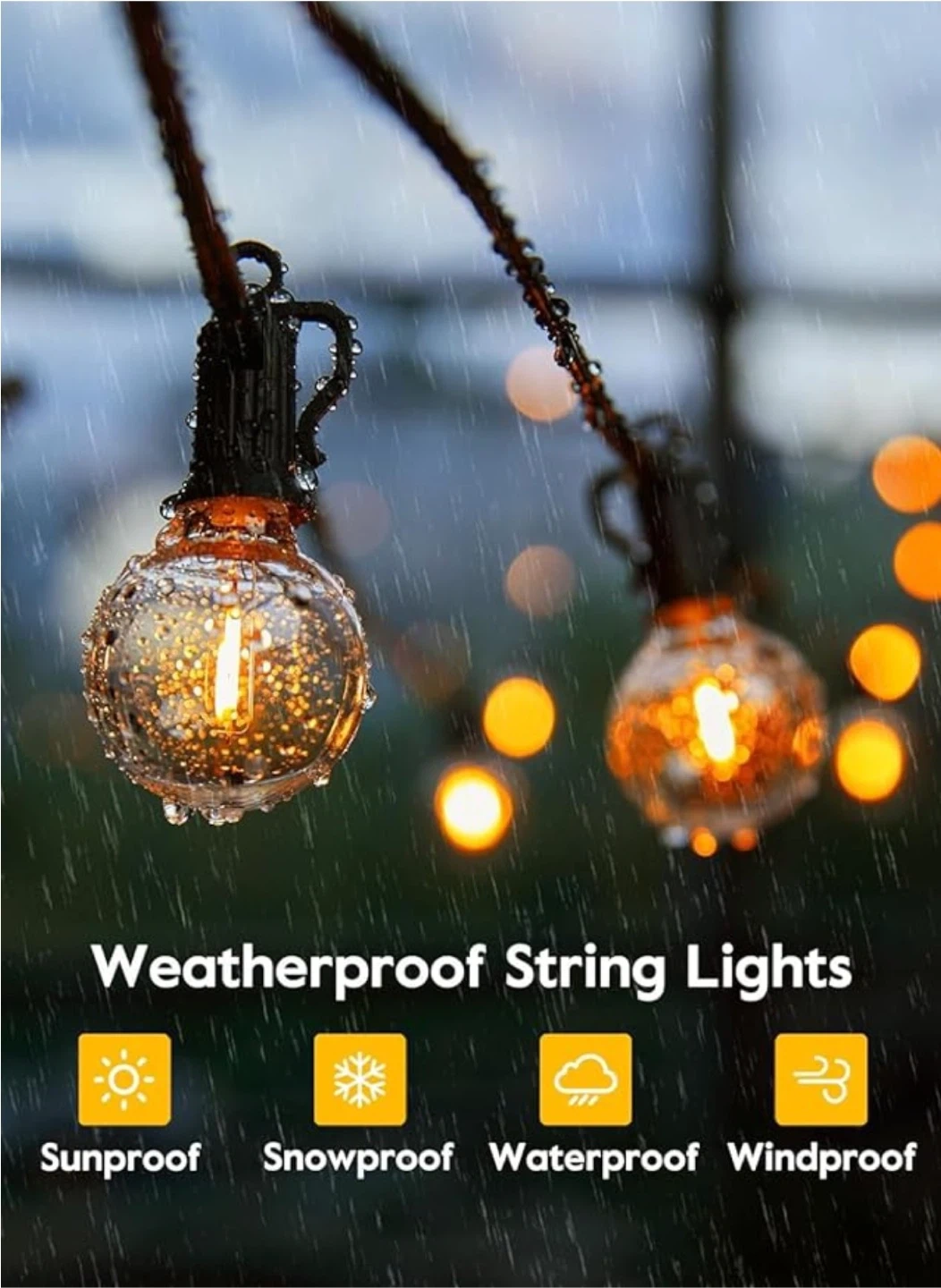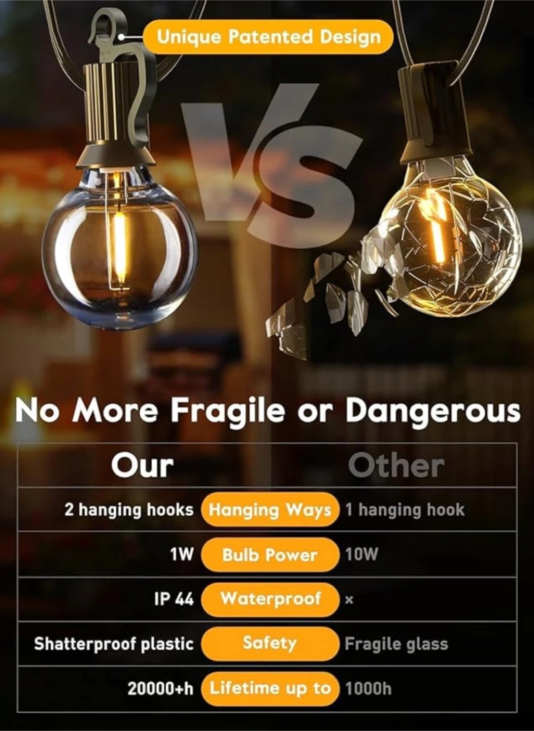 Shatterproof: The bulbs are plastic, not glass, so they won't break if dropped or hit by wind.