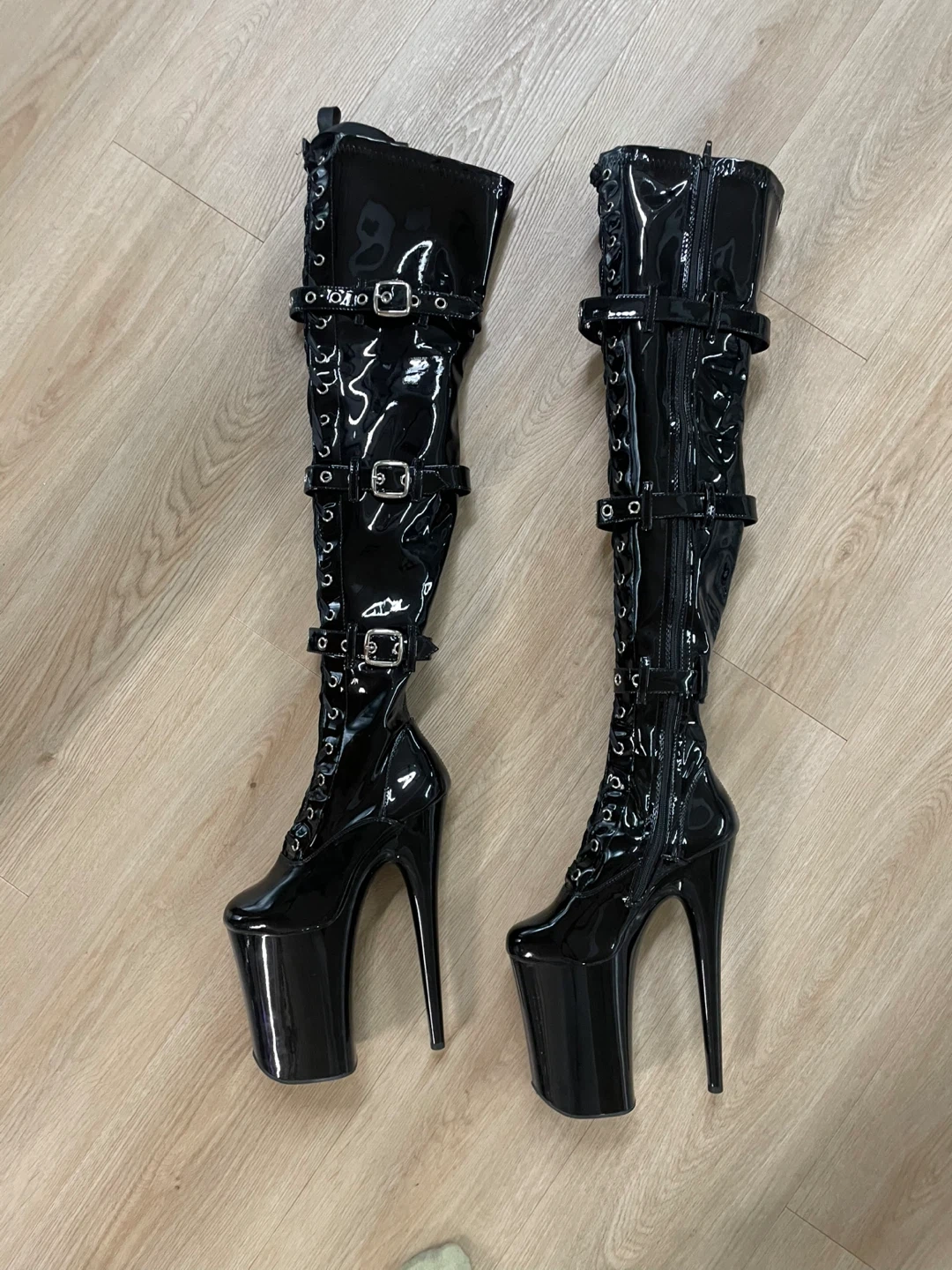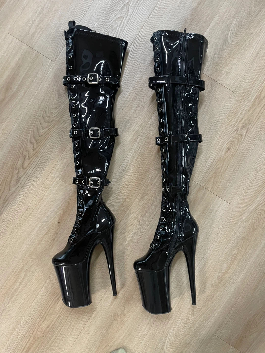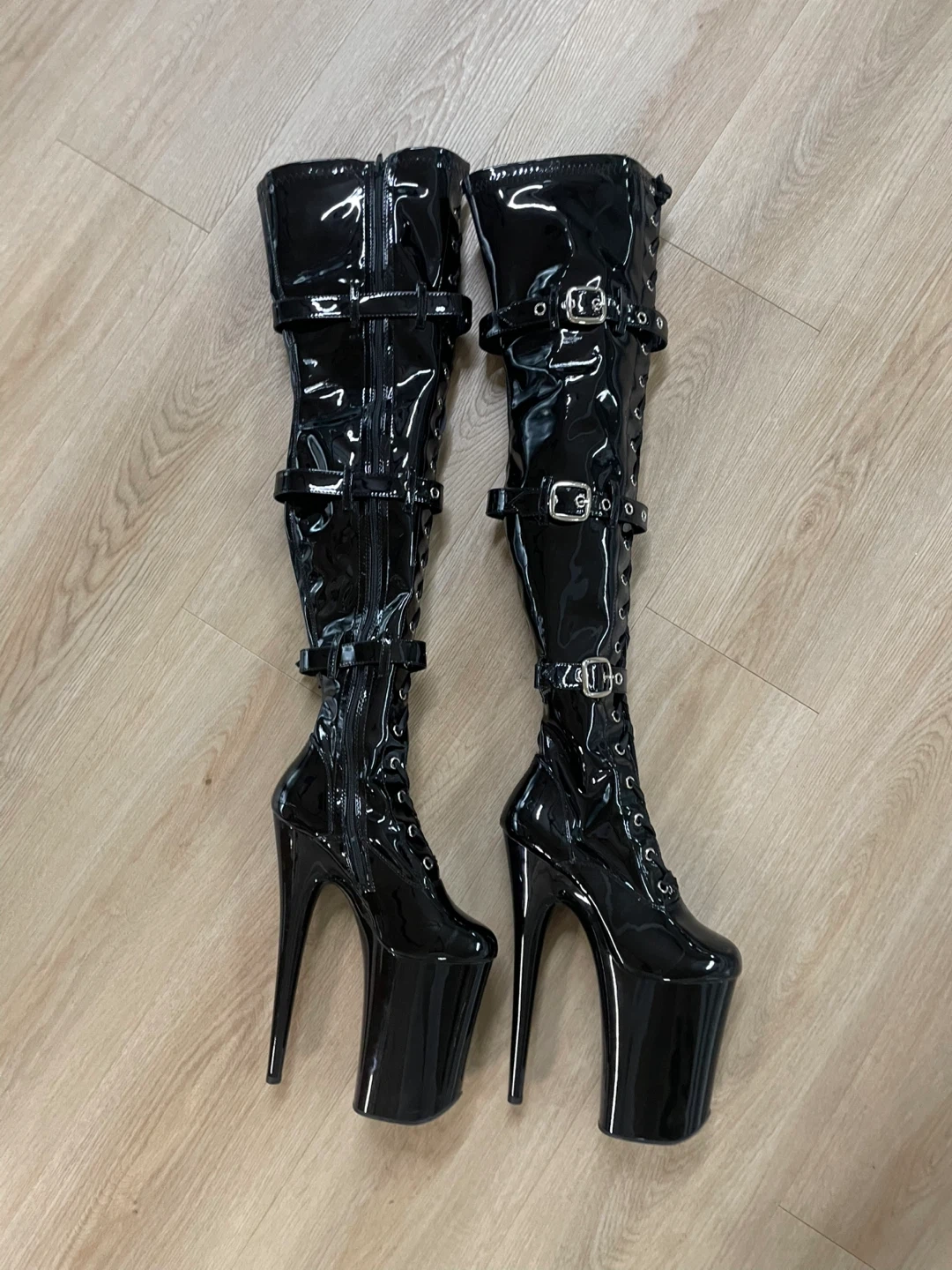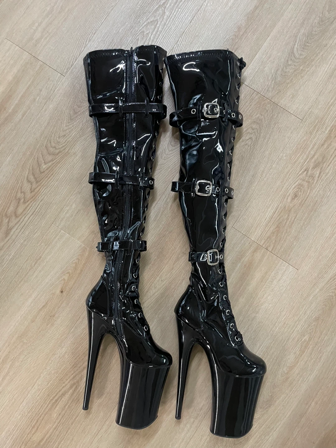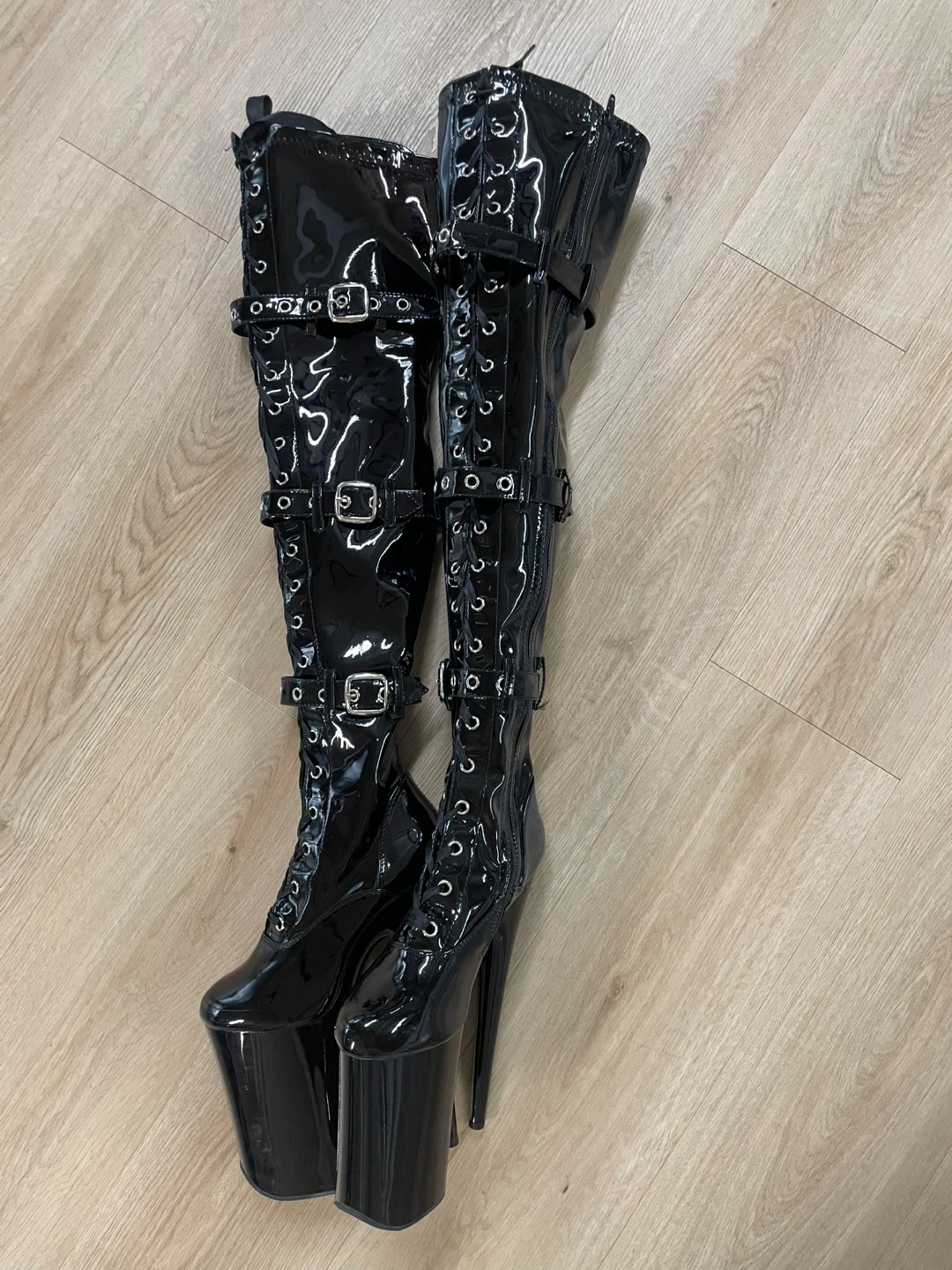 Shiny black patent thigh-high Pleaser brand pole dance boots with platform soles and buckle detailing.