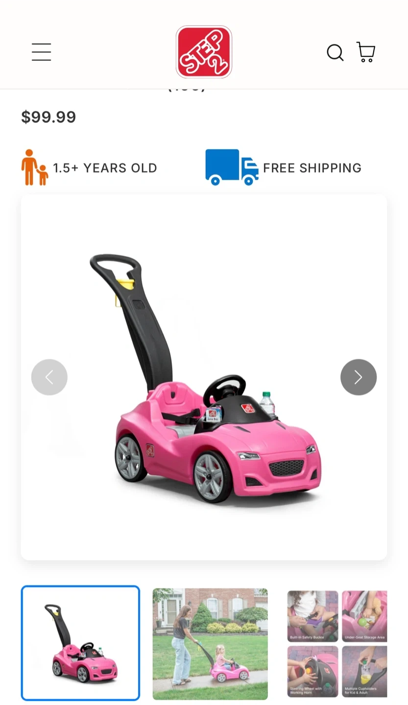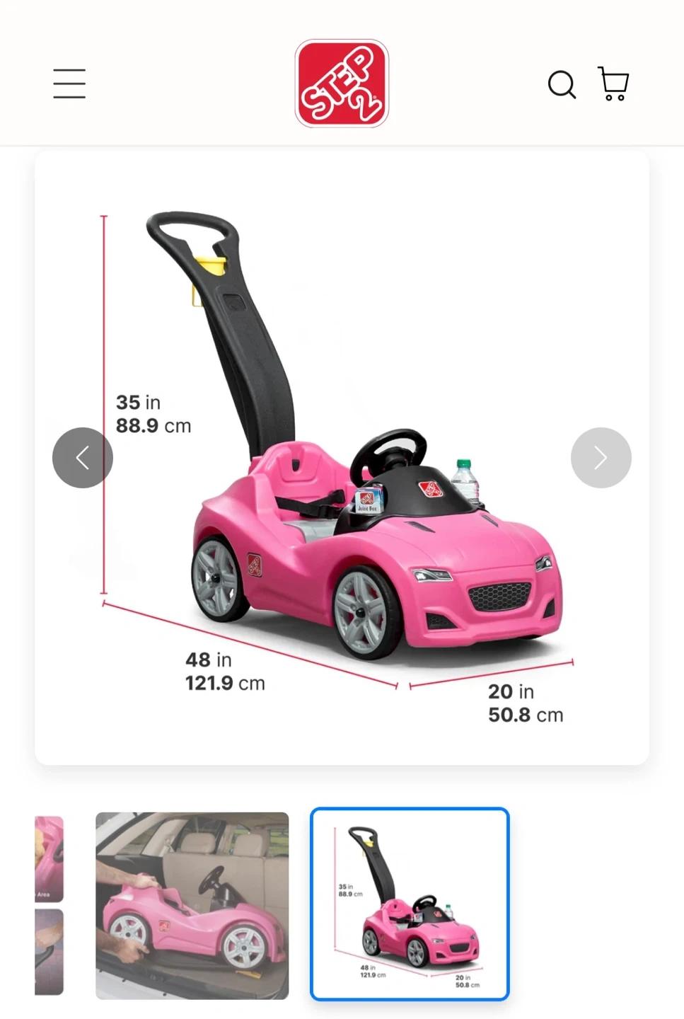 Brand new in a box. This pink Step2 Whisper Ride II push car is designed for kids 1.5 years and older. It's 48 inches long, 20 inches wide, and 35 inches high. Includes a pretend steering wheel with a working horn and a built-in storage compartment. Push handle folds down for easy storage.