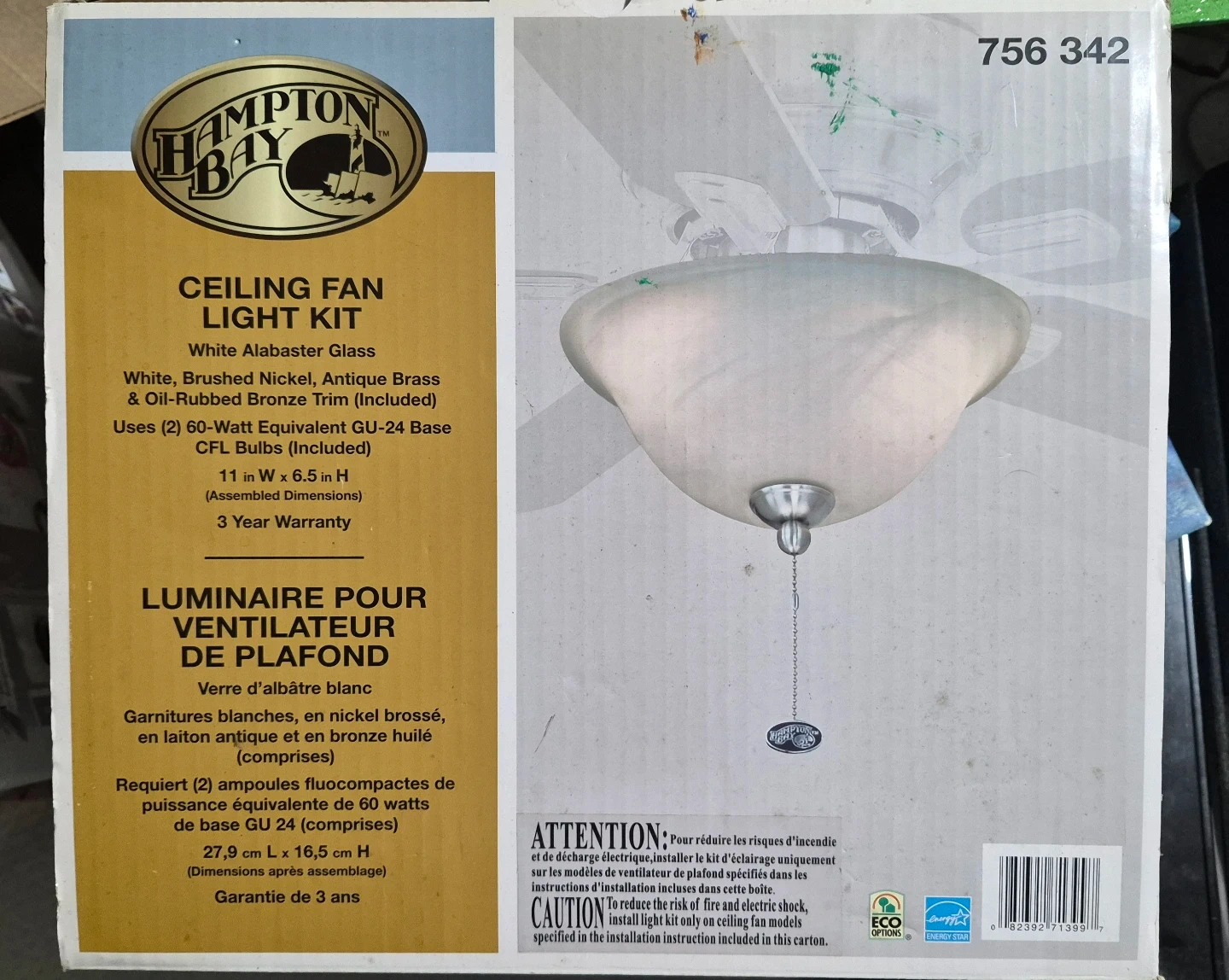 This is a Hampton Bay ceiling fan light kit with white alabaster glass. It features white, brushed nickel, antique brass & oil-rubbed bronze trim. It uses (2) 60-Watt equivalent GU-24 base CFL bulbs, which are included. The assembled dimensions are 11 in W x 6.5 in H, and it comes with a 3-year warranty.