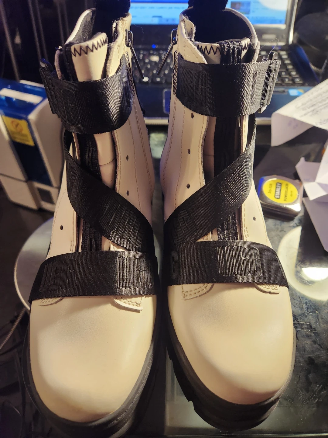 These UGG women's boots are a stylish cream colour. They feature black straps with UGG branding and a front zip closure. The boots have a thick black sole for added comfort and grip.