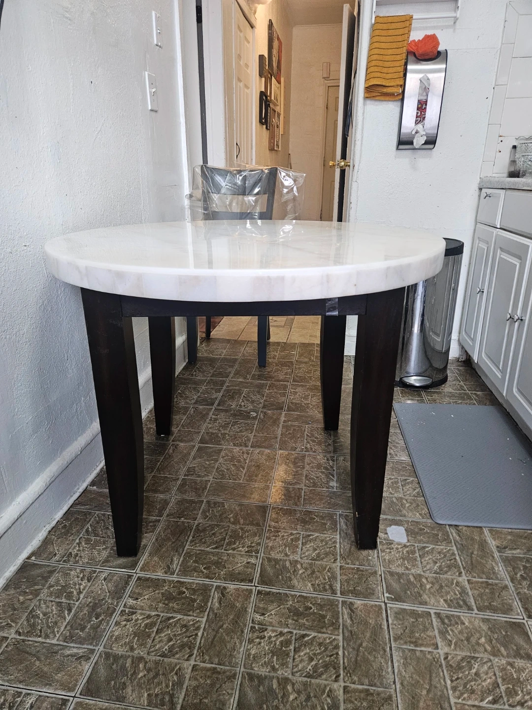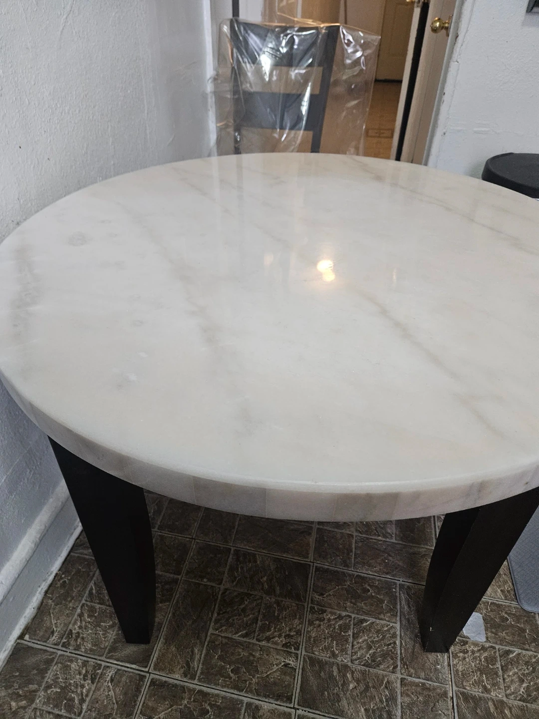 This dining table features a white marble top with subtle veining. It has four dark wood legs. It's a great size for smaller dining areas or kitchens. Provides a sturdy surface for meals.