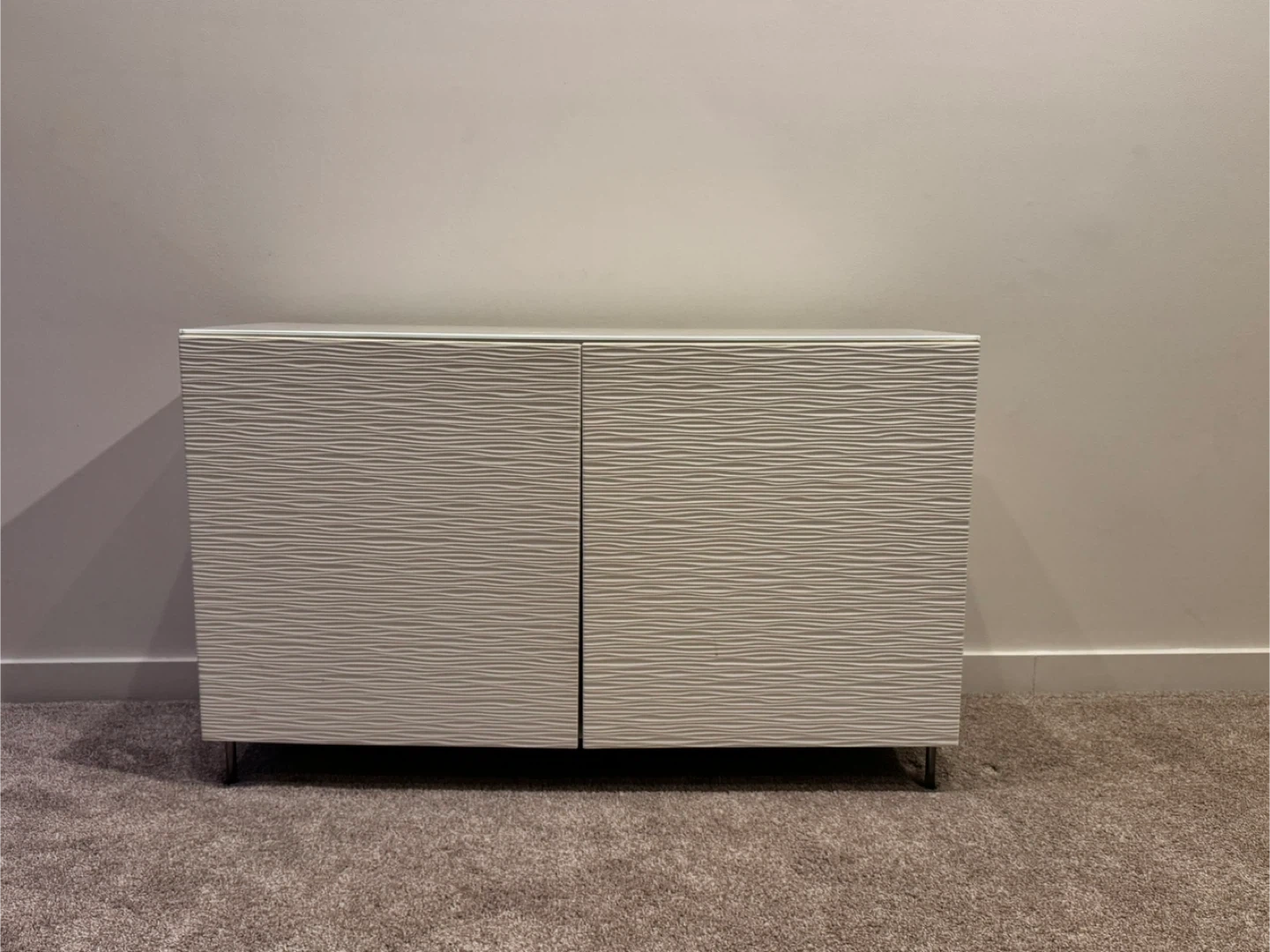 Selling a modern cabinet. It features a textured front and sleek metal legs. Great for adding a touch of elegance to any room. Comes with a glass top and 2 adjustable shelves.