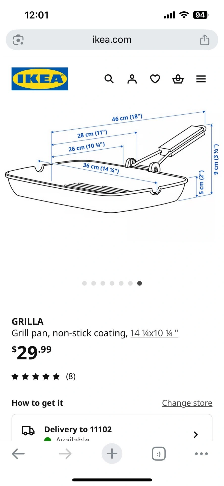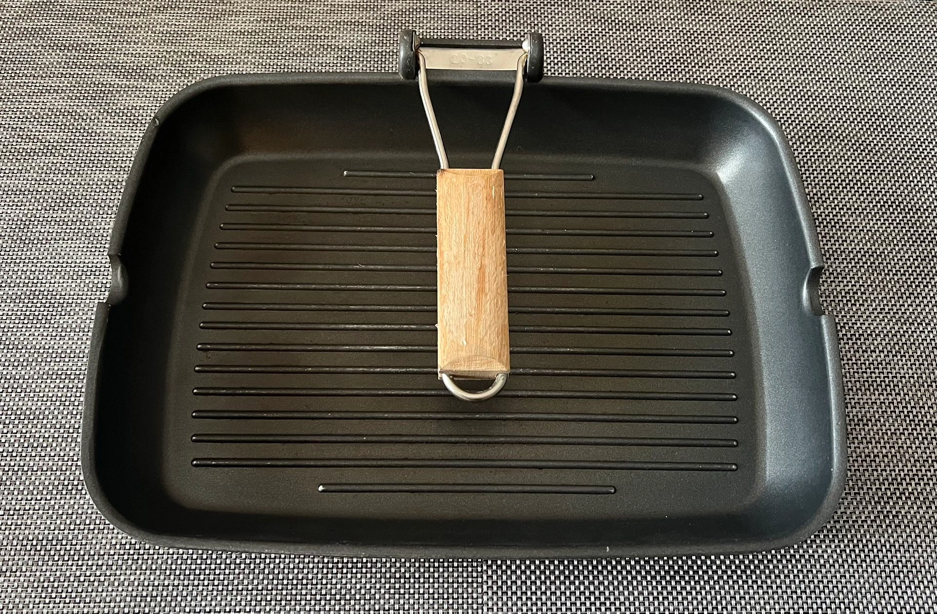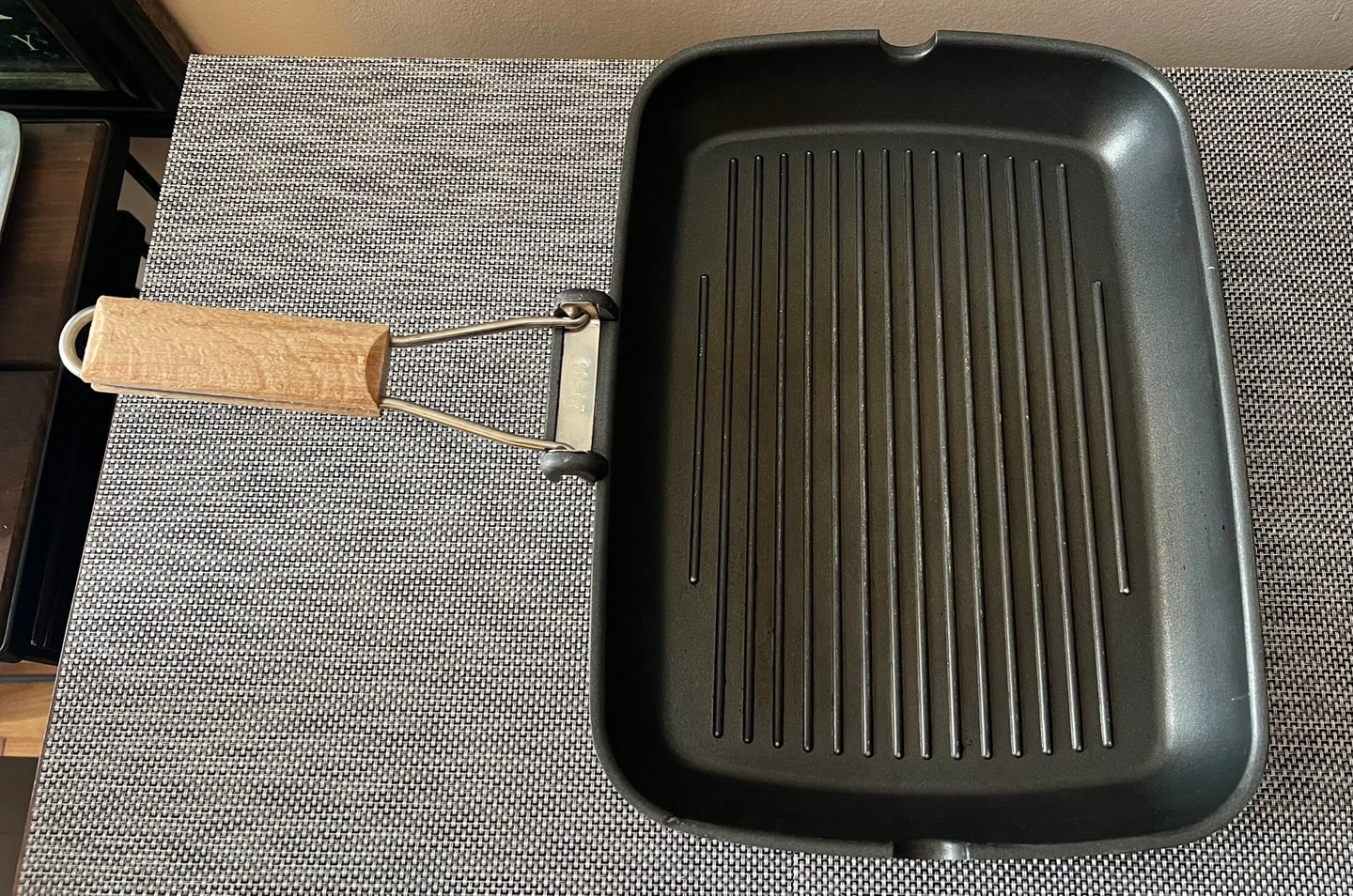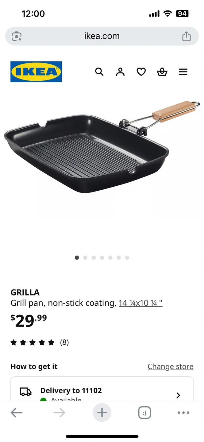 Used IKEA Grilla non-stick grill pan in good condition. Retails for $30+tax. Normal signs of wear from use, but still works great! Consolidating apartments and no longer need it. The sol-gel ceramic non-stick coating reduces the risk of food burning or getting stuck. Made from lightweight aluminum, which spreads heat evenly. Suitable for gas, electric, ceramic glass, and induction cooktops. The wooden handle folds down for storage. Spouts on the sides make it easy to pour out drippings. Handwash only. Dimensions: 14.25” W x 10.25” D x 2” H Pick up only near Astoria Park, Queens NYC 11102. Cash (preferred). Check out my other listings! Features: Non-stick, Easy to clean, Collapsible handle for storage Color: Black Material: Aluminum, Non-stick ceramic coating, wooden handle Brand: IKEA