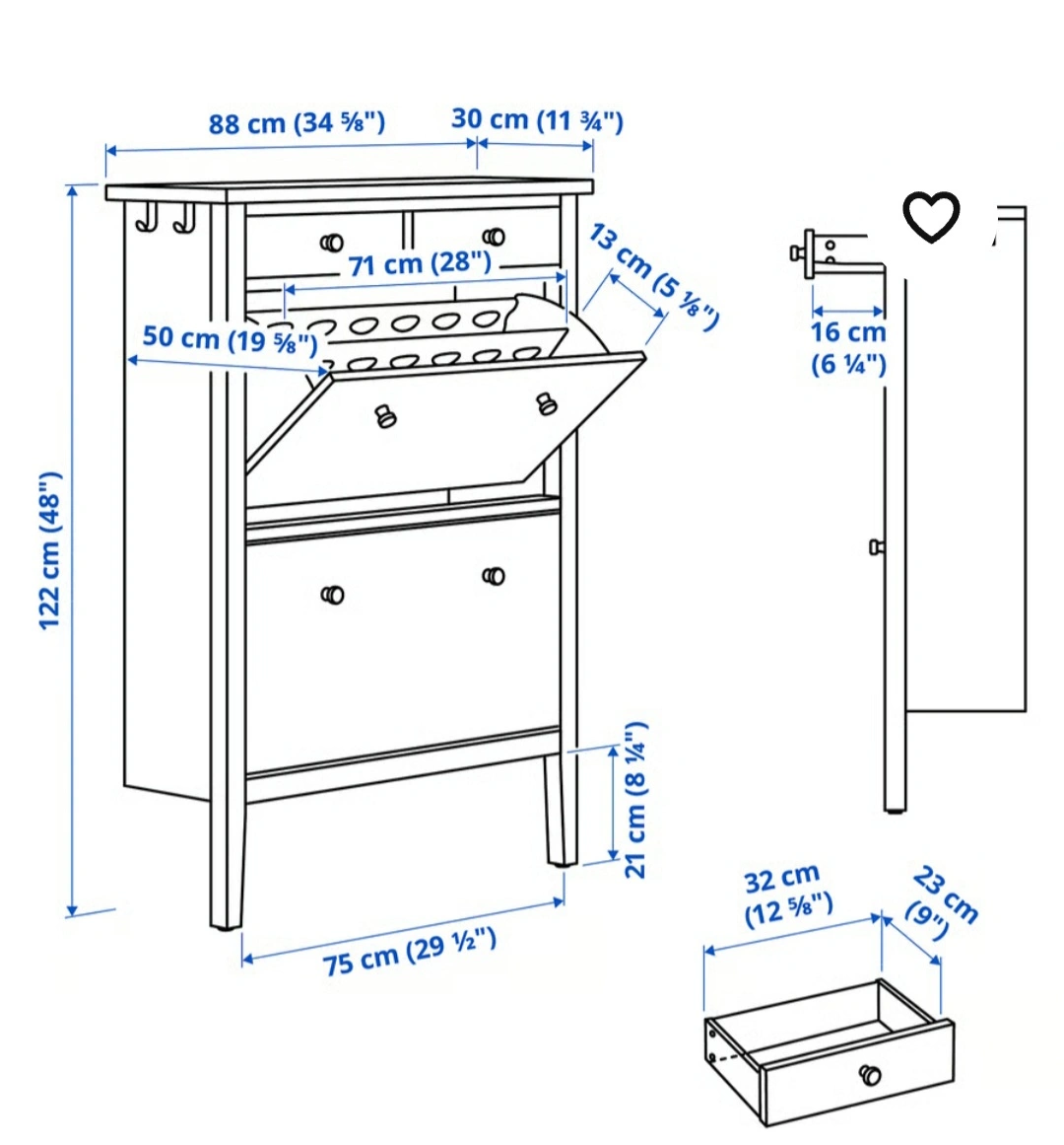 10Selling an IKEA HEMNES shoe cabinet with two compartments. It's in great condition and ready to organize your entryway! The cabinet is white and measures 89x127 cm (35x50")