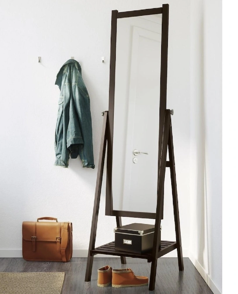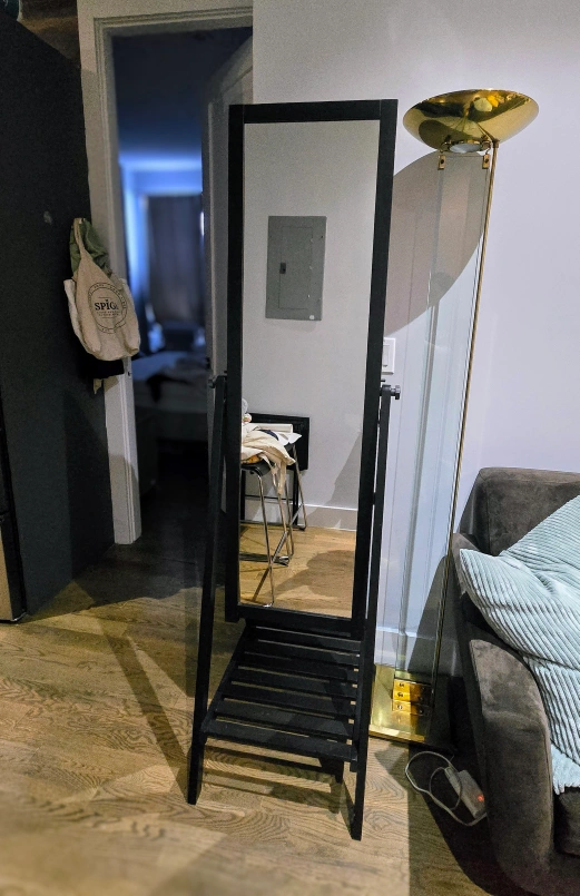 123Selling a gently used standing mirror. It's in great condition and perfect for any room. The mirror has a built-in shelf for extra storage, making it both functional and stylish. Overall Dimensions: Width: 18.5 inches, Height: 71.6 inches, Depth: 23.25 inches Pick-up: East Harlem / DM for pick up