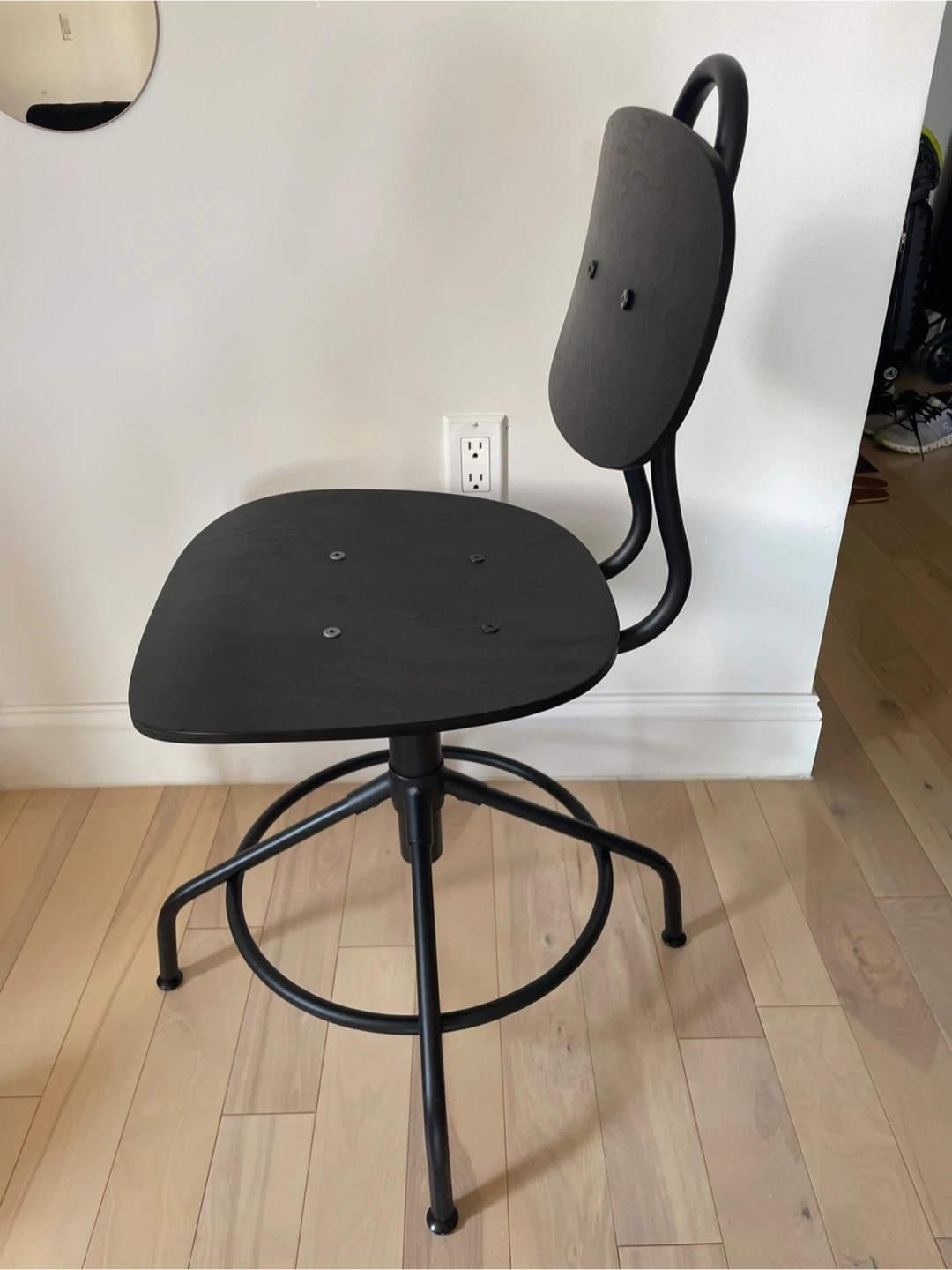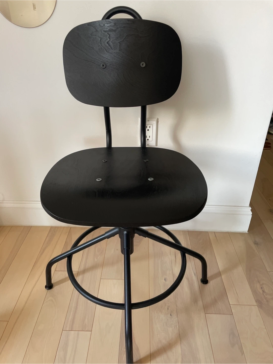 Selling an IKEA Kullaberg swivel chair in black. It's a stylish and comfortable addition to any home office or workspace. The chair features a sturdy metal frame and a comfortable wooden seat and back. Itās in great condition and ready for a new home!