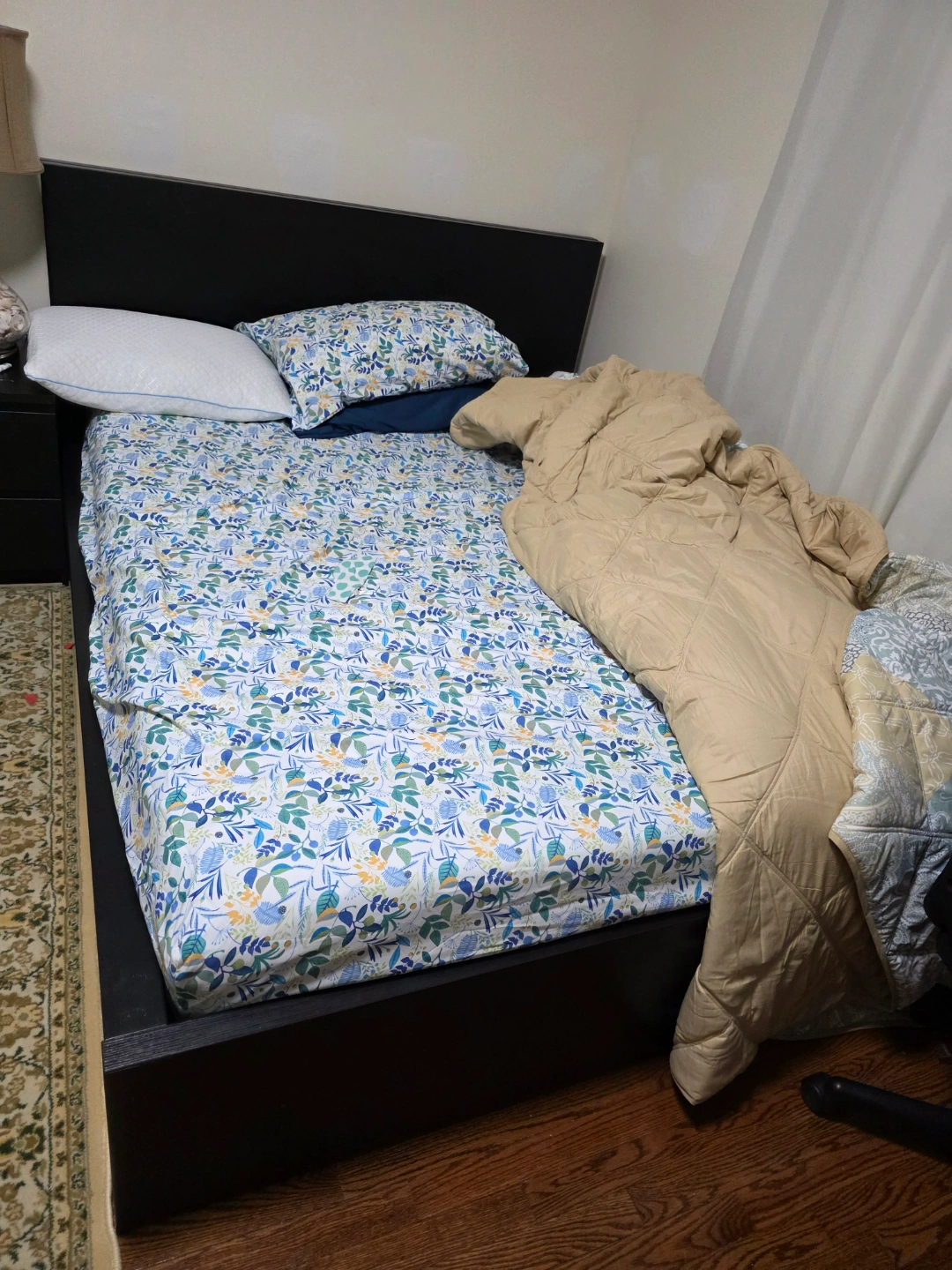 76Like New. Queen size bed frame. Black-brown color. Includes slats. Easy assembly. Ashley Queen Size mattress included. Pillows not included. Assembly available for additional $50/- within 5 miles