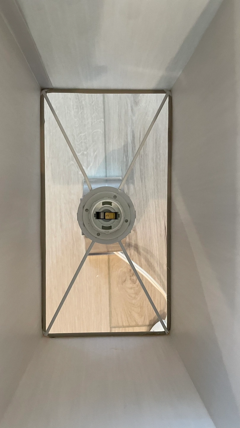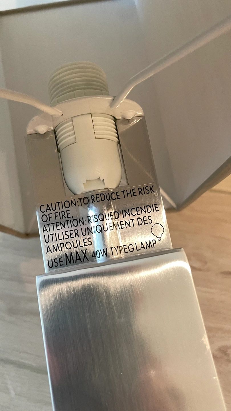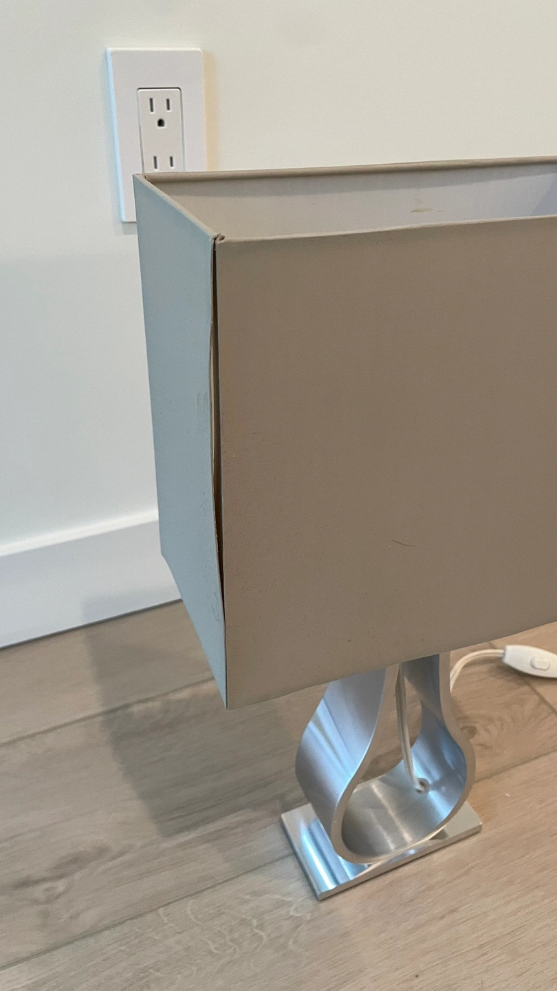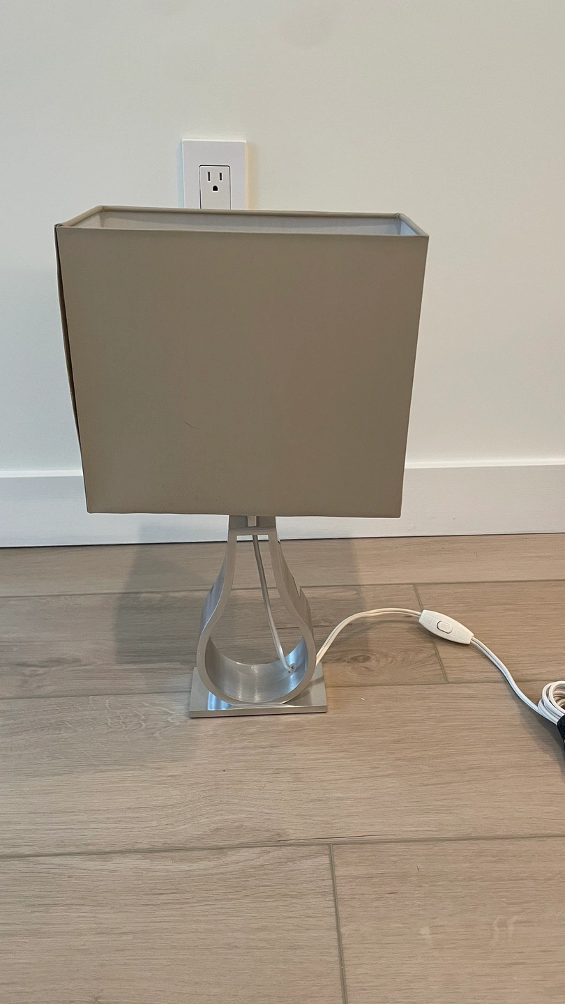 Modern table lamp with a silver base and a grey fabric shade. The shade is rectangular and the base is in the shape of a teardrop. Shade has some damage but can easily be replaced with any IKEA lamp shade. Does not include bulb.