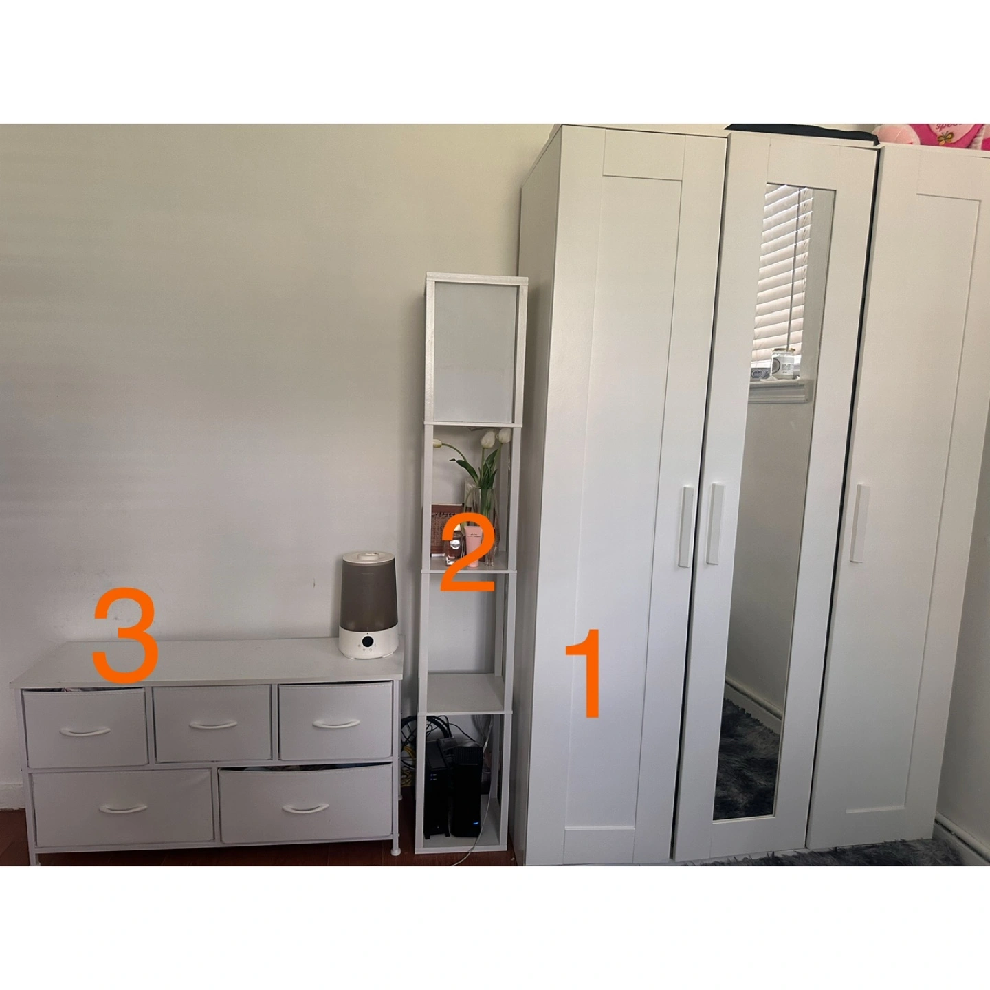 Included in the set: 1️⃣ Large Wardrobe with Mirror 3 doors with hanging space and shelves inside Full-length mirror on the middle door Very spacious and sturdy( new price -$200 just bought one month ago from ikea ) 2️⃣ Tall Shelf / Organizer 4 open shelves for books, plants, or décor Slim, modern design – easy to fit in any corner( new price -$78 form Amazon ) 3️⃣ Drawer Storage Cabinet 5 drawers (lightweight fabric style with solid frame)new price $59 on Amazon bought 2 month ago ) Great for clothes, toys, or general storage ✅ All items are in excellent, like new condition ✅ From a smoke-free, pet-free home