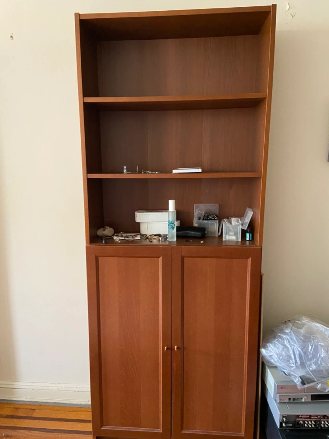 Selling a wooden cabinet. It's in great condition and offers plenty of storage space for books and other items. The warm wood tone would fit in well with most decor styles