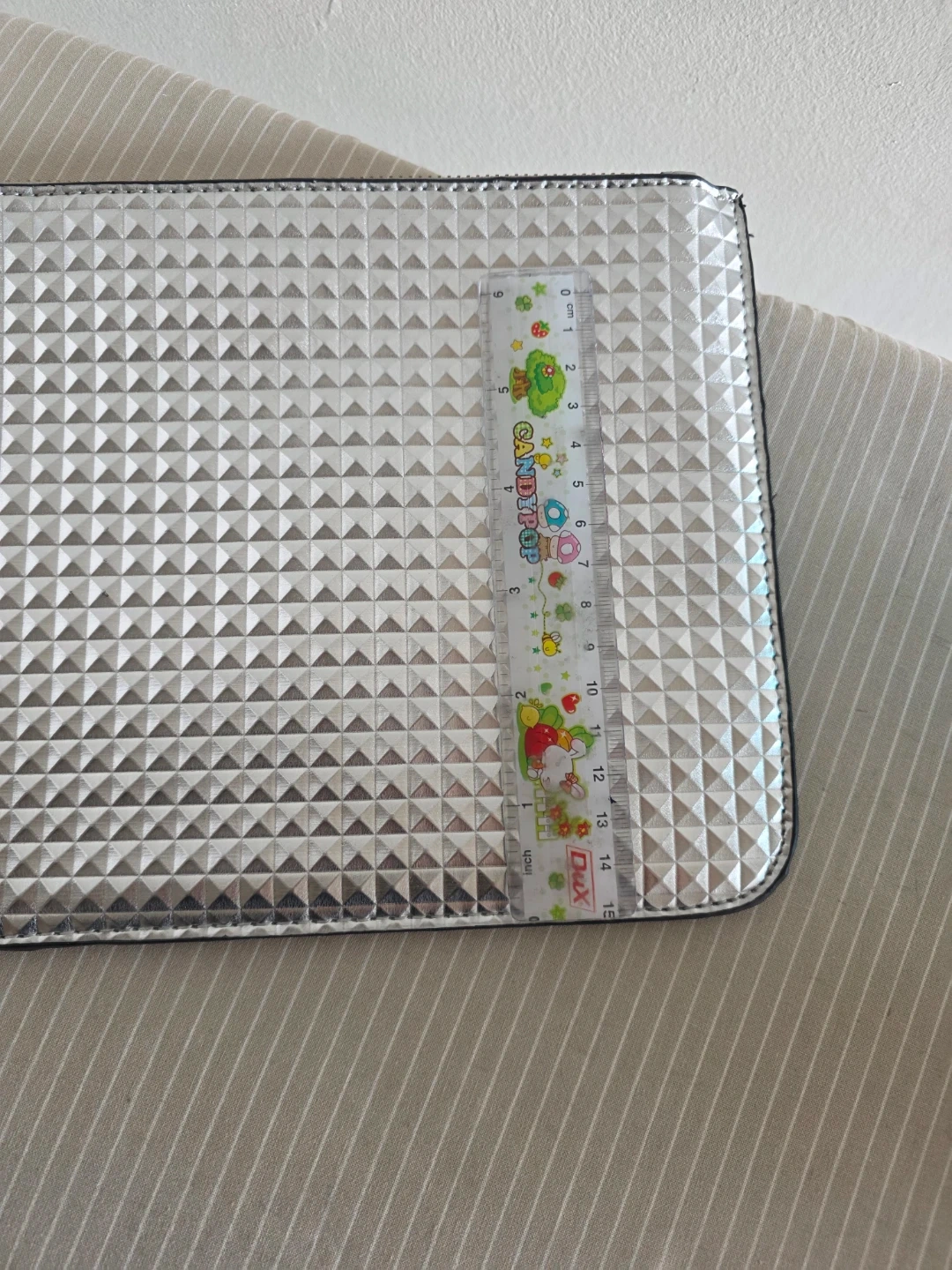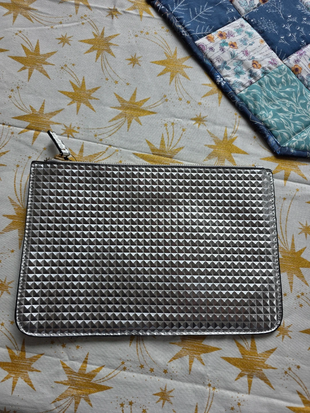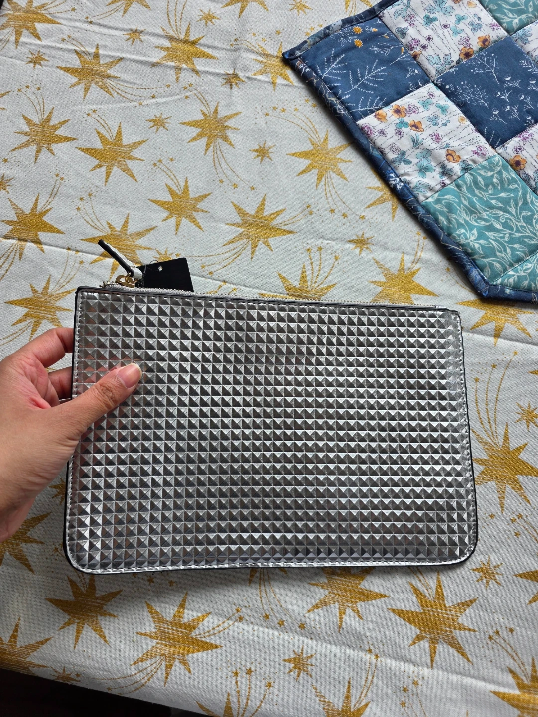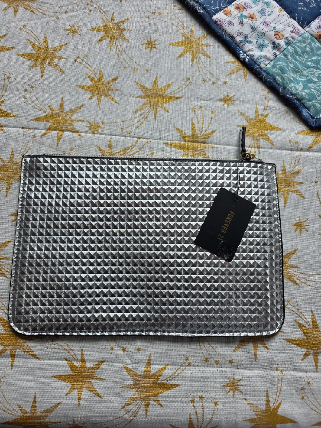 This stylish silver clutch bag from Forever 21 features a unique textured geometric pattern. It's a great size for carrying essentials.
