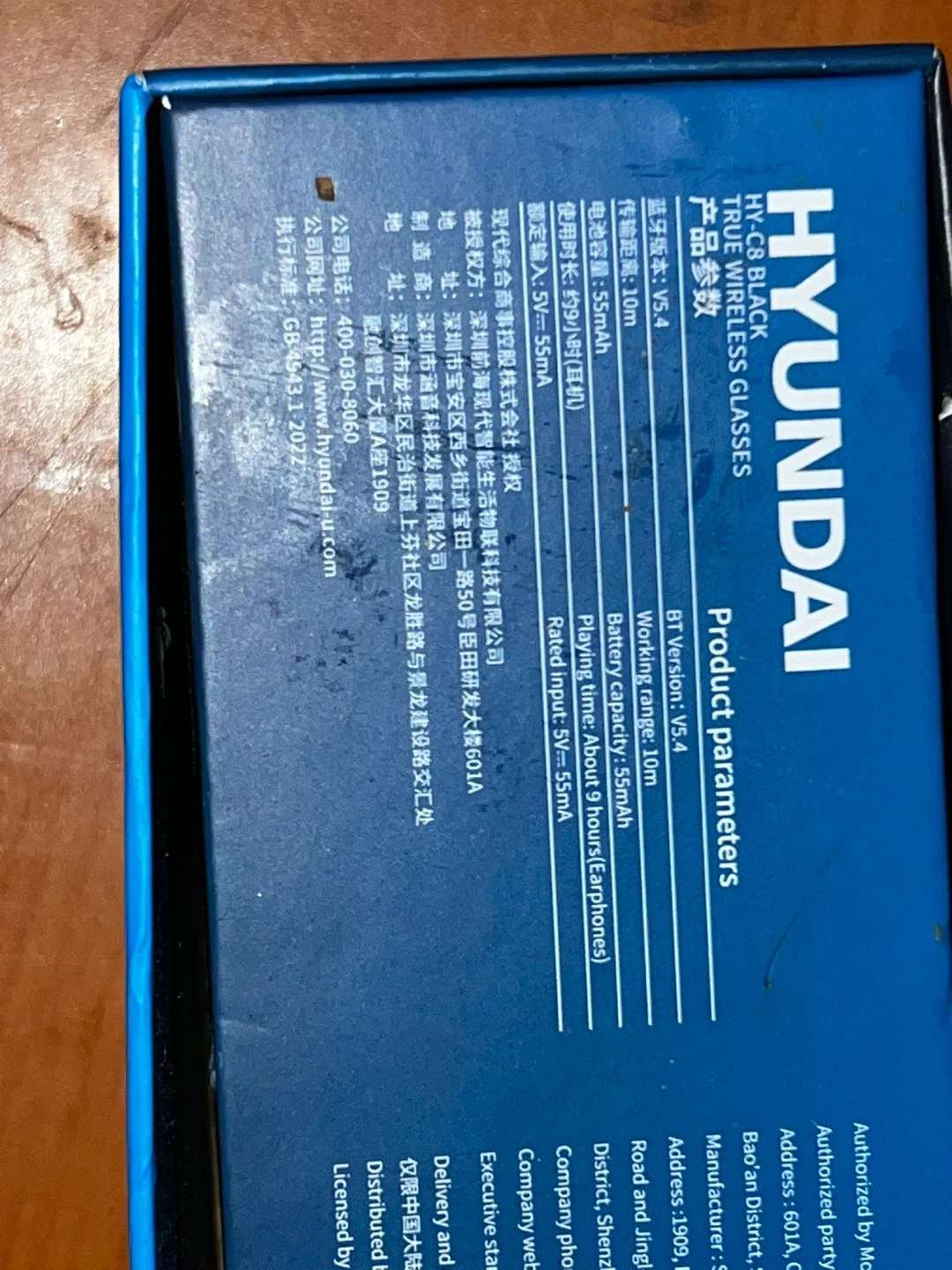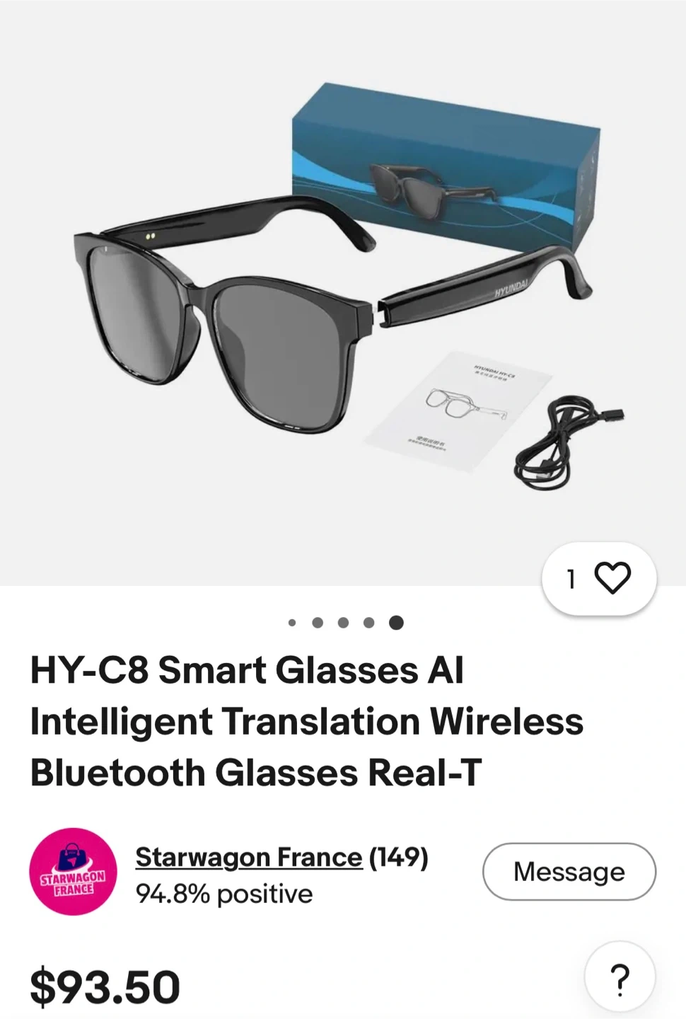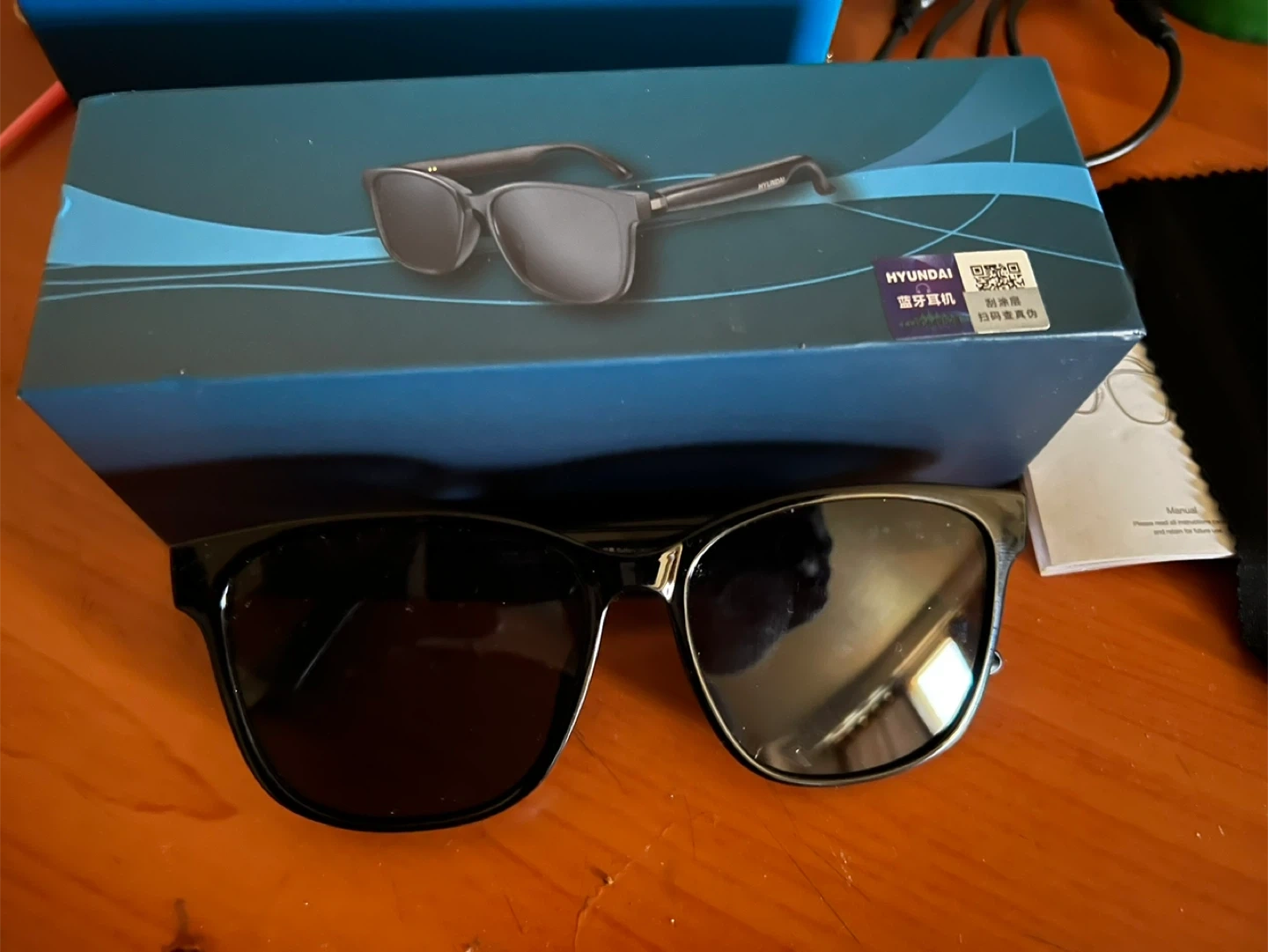 HYUNDAI smart glasses feature AI intelligent translation. They offer wireless Bluetooth connectivity. Includes manual and charging cable.
