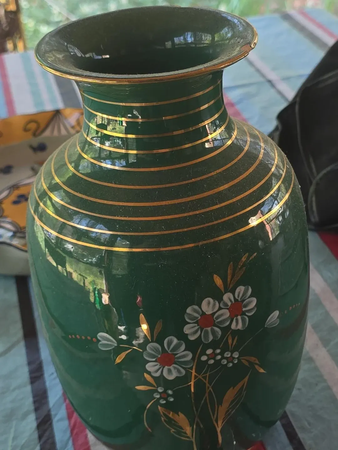 Green Decorative Vase with Gold Stripes and Floral Accents