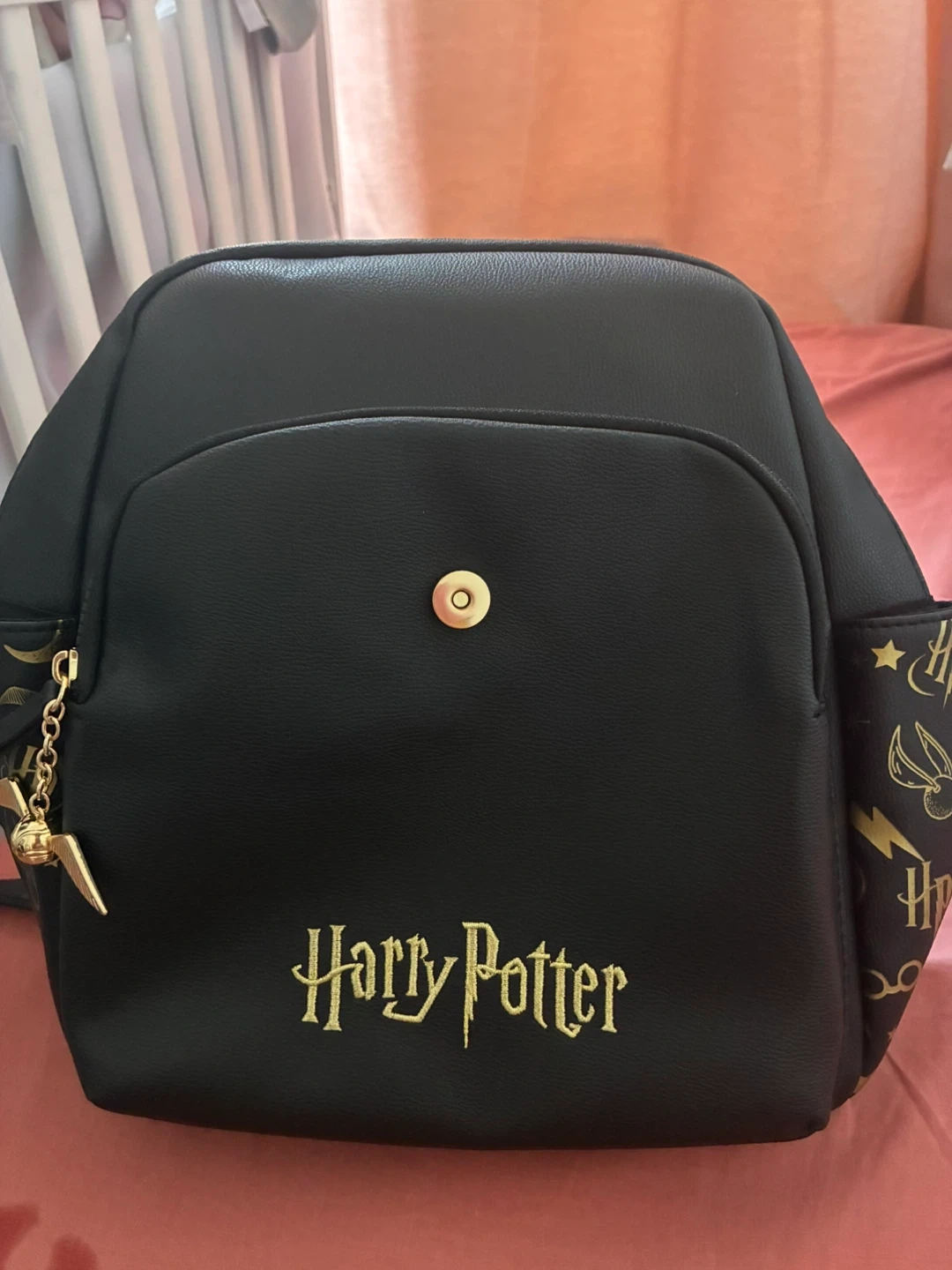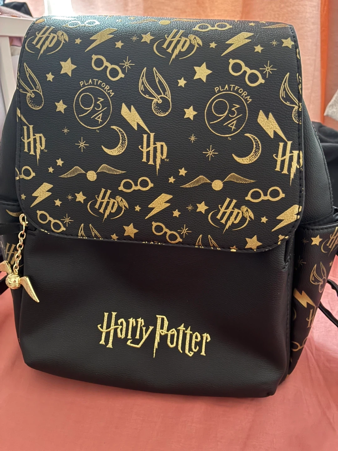 This black backpack features a gold Harry Potter logo on the front and a gold lightning bolt charm. It has a patterned flap with iconic Harry Potter symbols like the "Platform 9 3/4" logo and snitches. It's a stylish accessory for any fan!