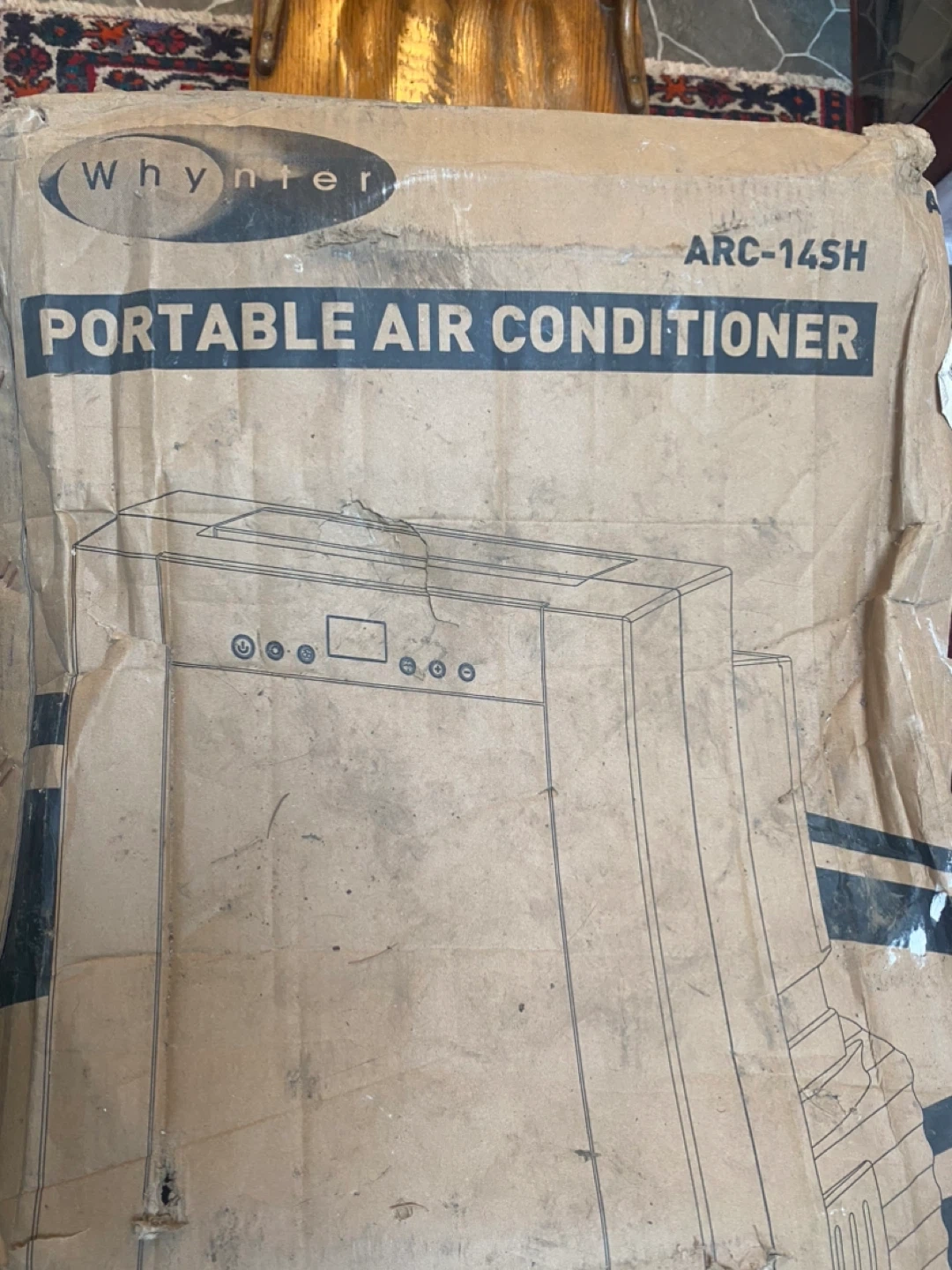 This is a Whynter ARC-14SH portable air conditioner. It's designed for cooling spaces. Great for keeping a room comfortable during warmer weather! The box is not in great shape but it is brand new and unopened. Retails around 1000$