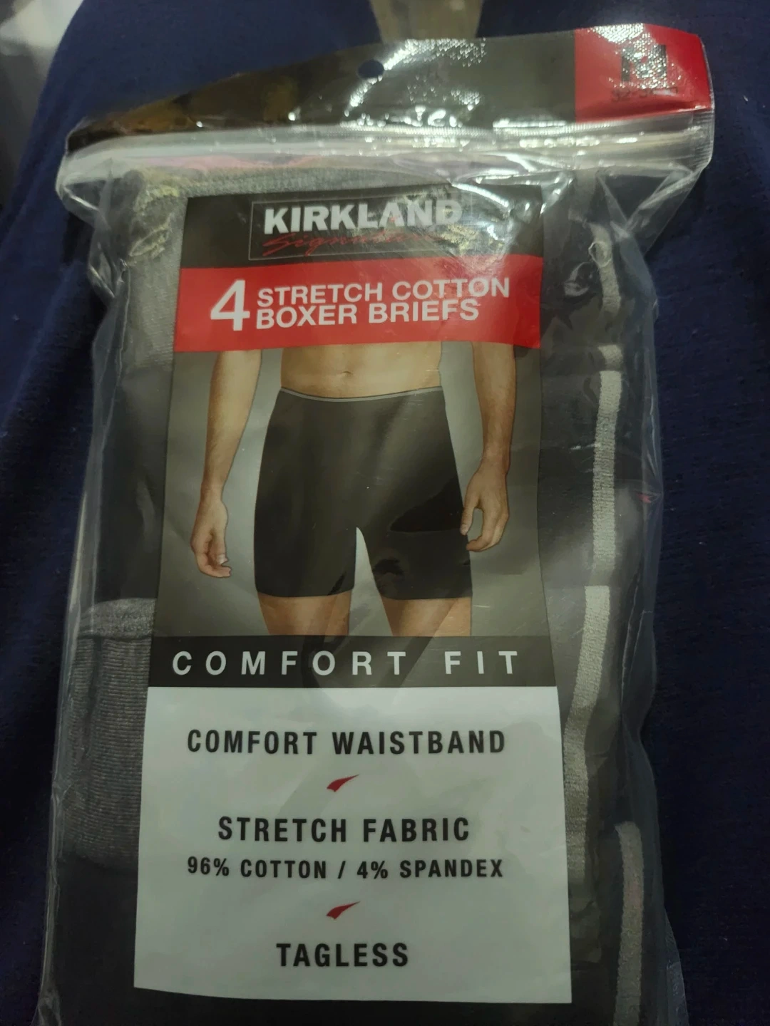 This is a 4-pack of Kirkland Signature men's boxer briefs. They're made with stretch fabric for comfort. The material is 96% cotton and 4% spandex. They are tagless.