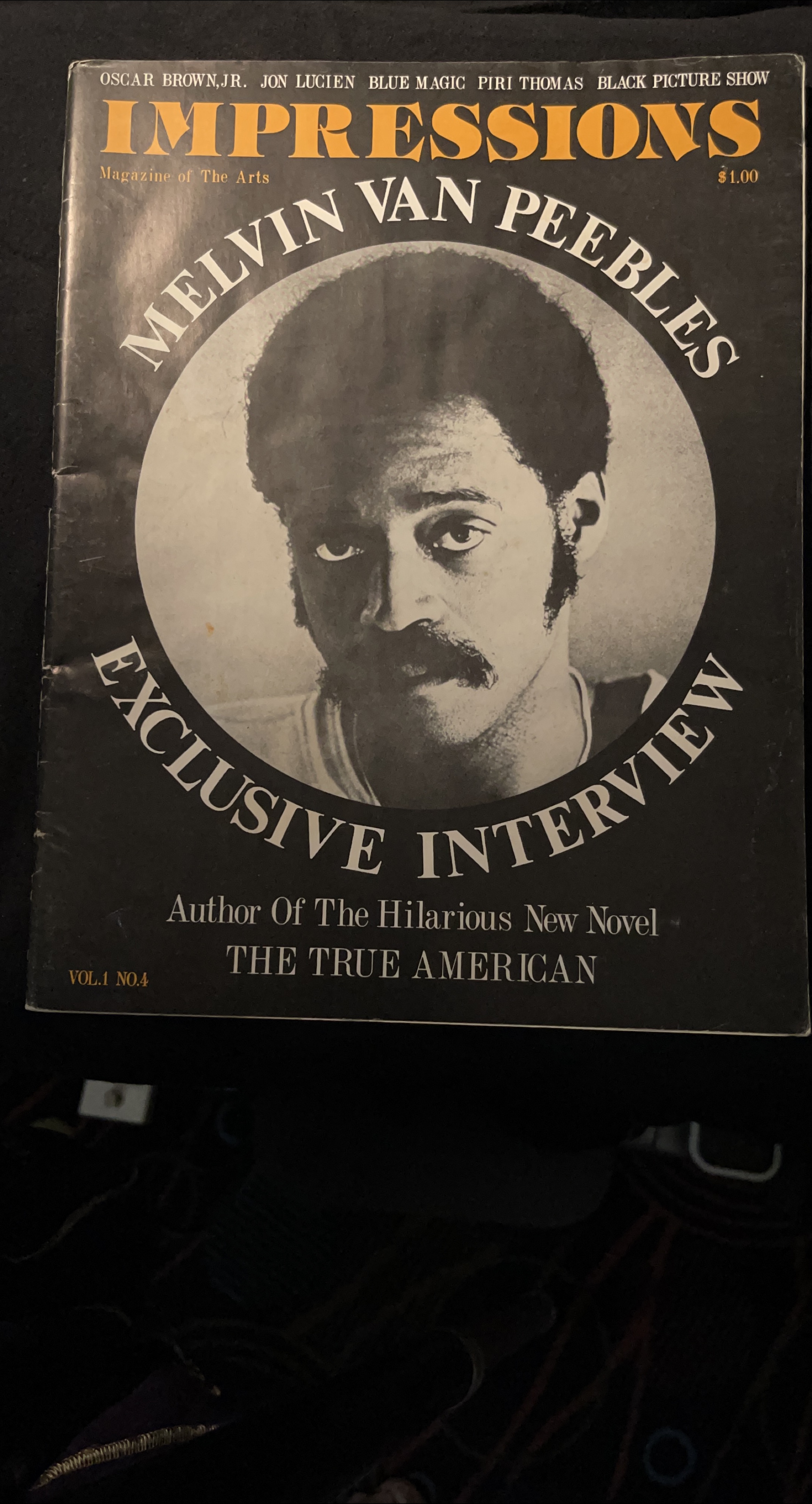 Selling a copy of Impressions Magazine of The Arts, Vol.1 No.4. It features an exclusive interview with Melvin Van Peebles and includes articles by Oscar Brown Jr., Jon Lucien, Blue Magic, Piri Thomas, and Black Picture Show. A great addition to any collection!