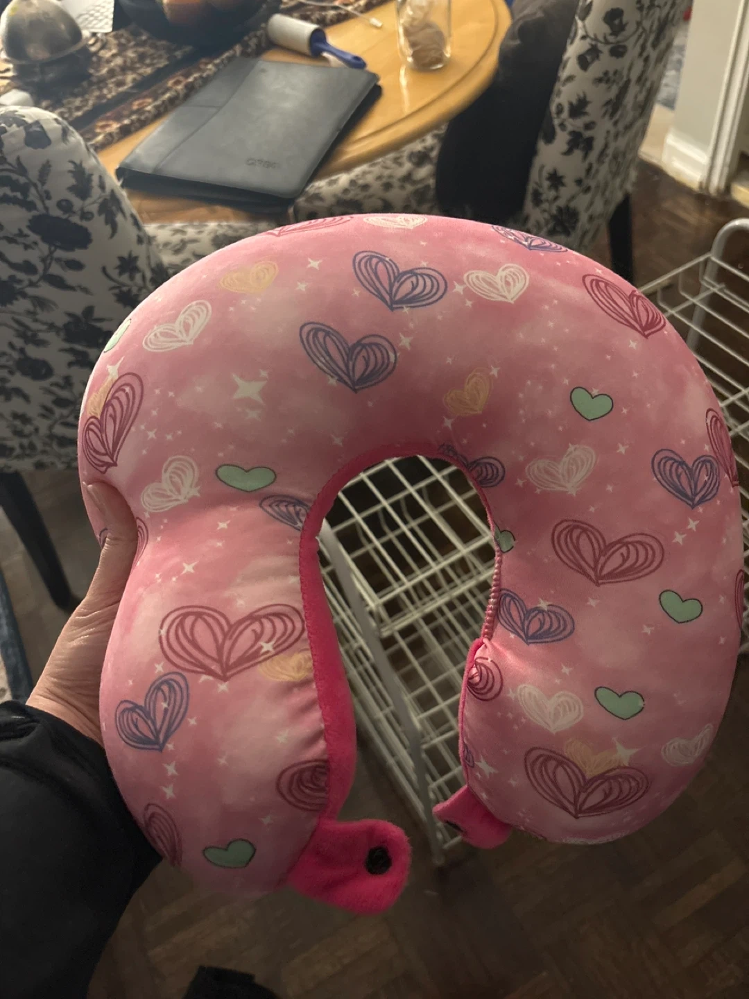 A cute and comfy pink travel neck pillow with a heart pattern! Perfect for long trips or just relaxing at home. It's in great condition and ready for a new adventure