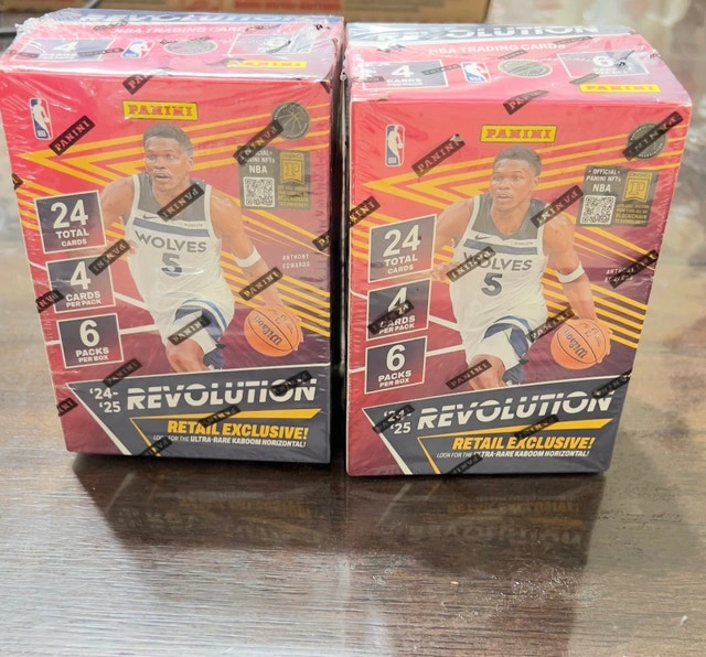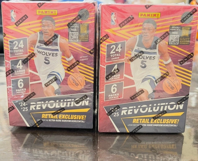 Selling a brand new, sealed 2024-25 Panini Revolution NBA Trading Card Box. Each box has 6 packs with 4 cards per pack, for a total of 24 cards. Unboxing is like a box of chocolates; you never know what you're gonna get! If you're seeing this ad, yes, it's still available. $90 each or 2 for $180. Reasonable offers considered.