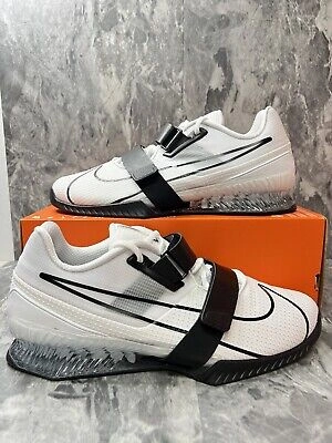 Men's Nike Romaleos 4 weightlifting shoes. White and black colourway. Size 12. Features a Velcro strap closure and a raised heel.