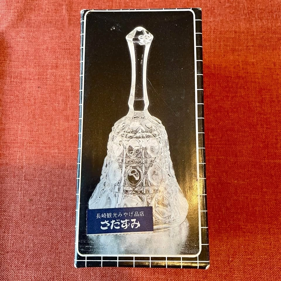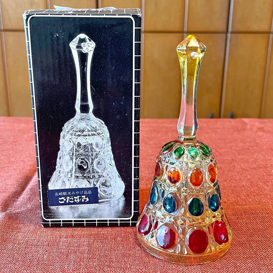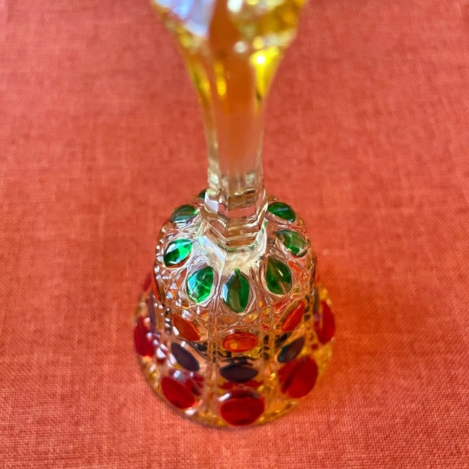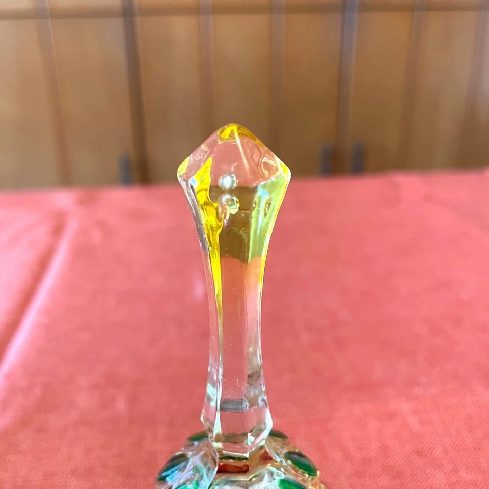 Stunning vintage handbell crafted from high-quality 24% lead crystal glass. The crystal bell body features an intricate cut pattern with vibrant multicolored accents in red, blue, green and orange. The handle has a faceted top and subtle yellow tint. It rings with a clear, pleasant tone when gently rung.