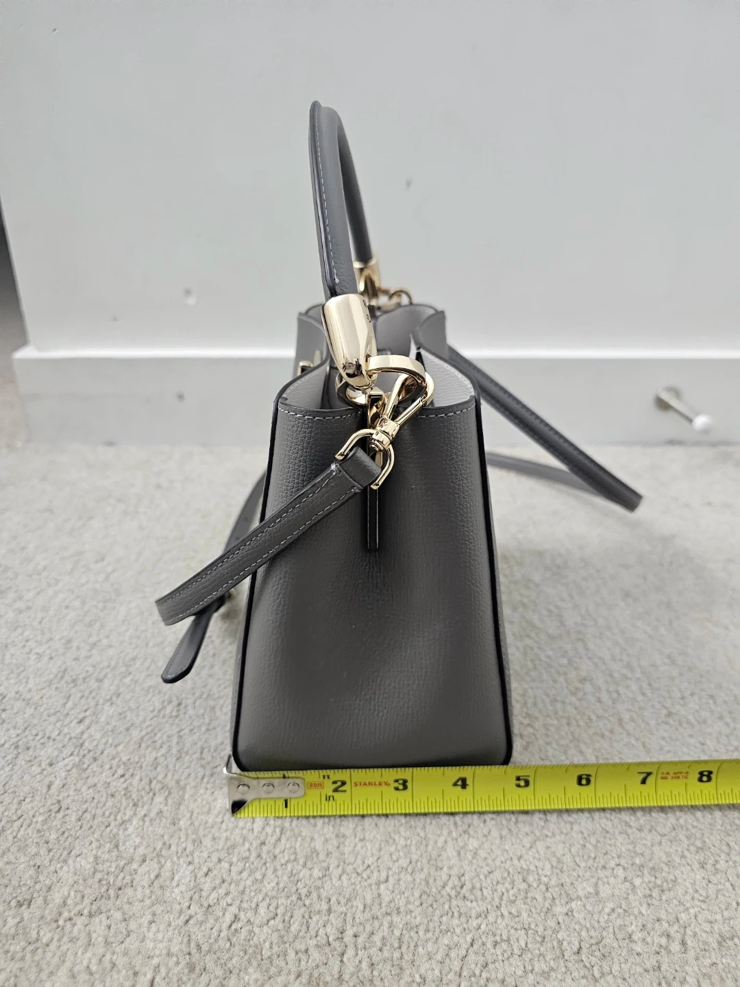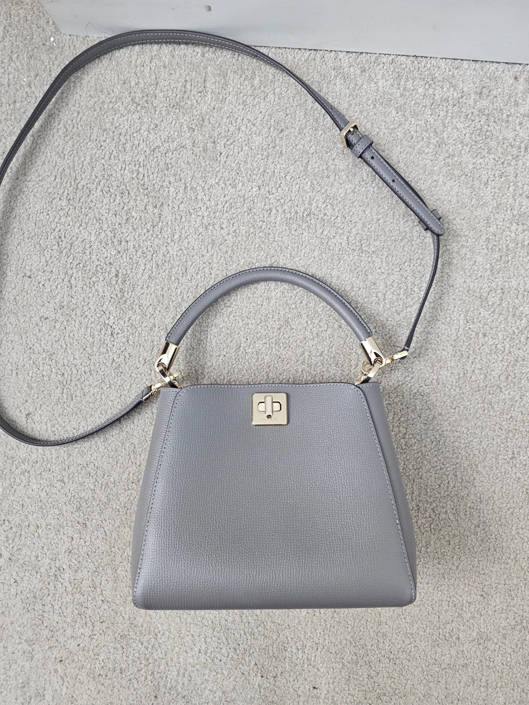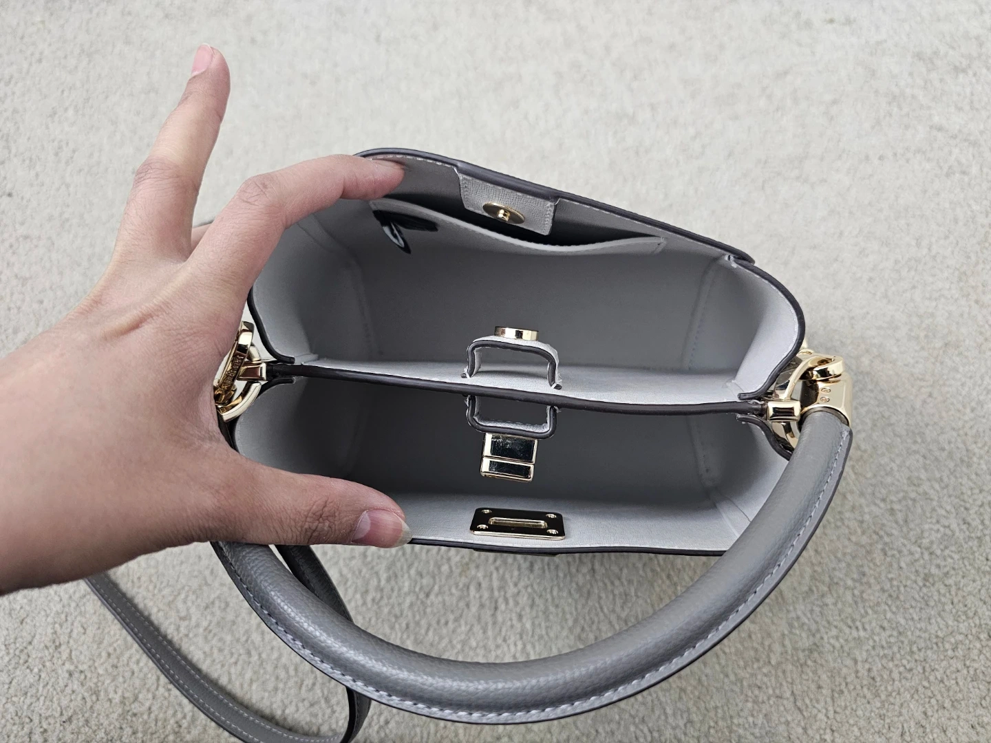 This is a stylish grey leather handbag. It features a top handle and a detachable shoulder strap for versatile carrying. The interior has a divider for organization.