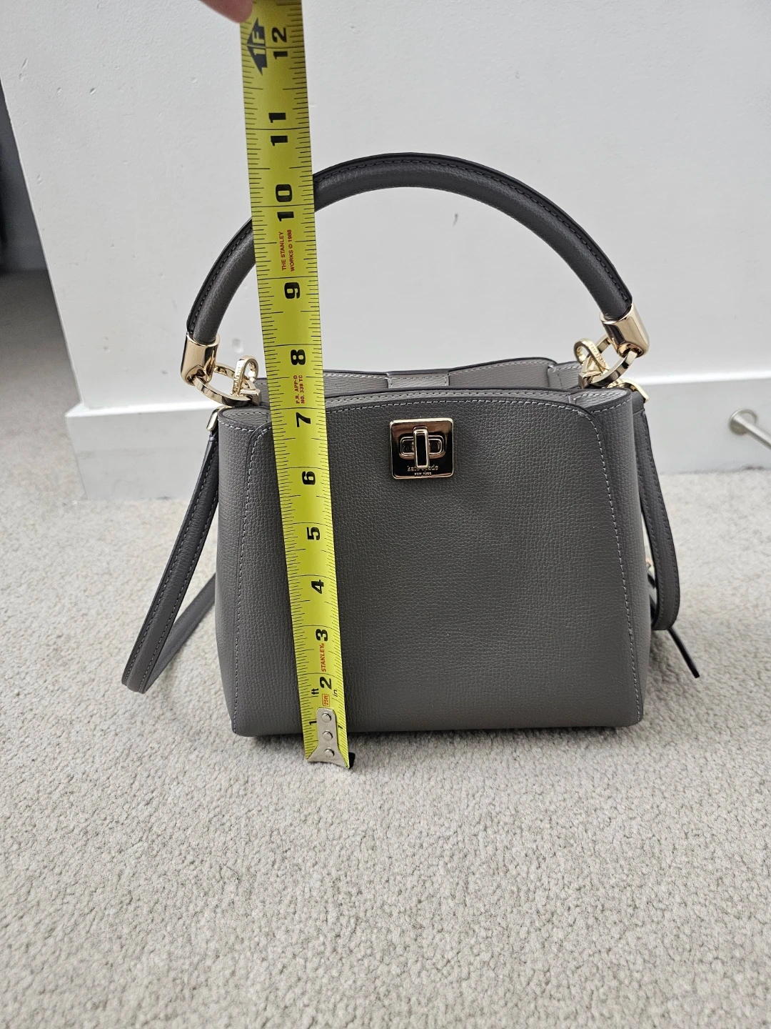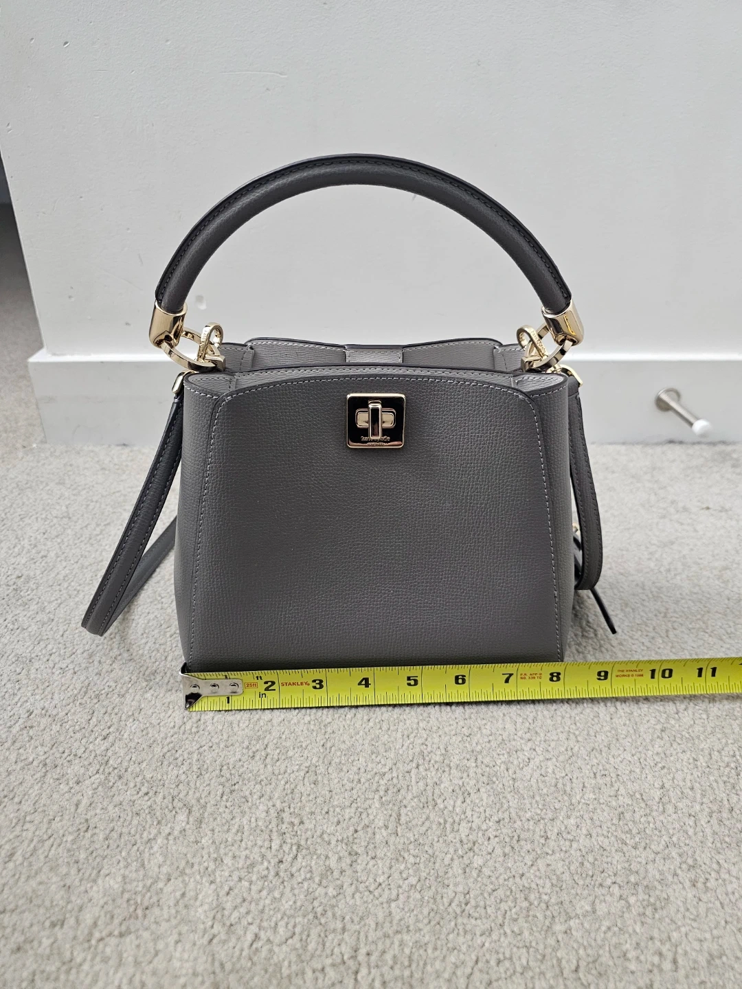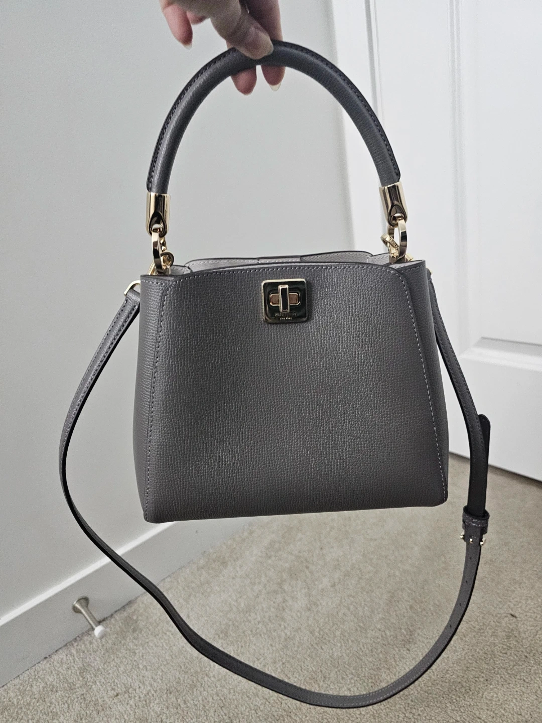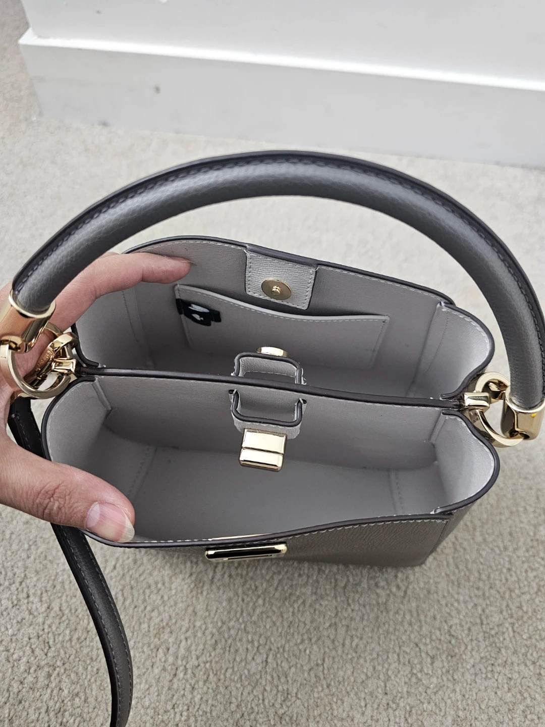 This is a stylish grey leather handbag. It features a top handle and a detachable shoulder strap for versatile carrying. The interior has a divider for organization.