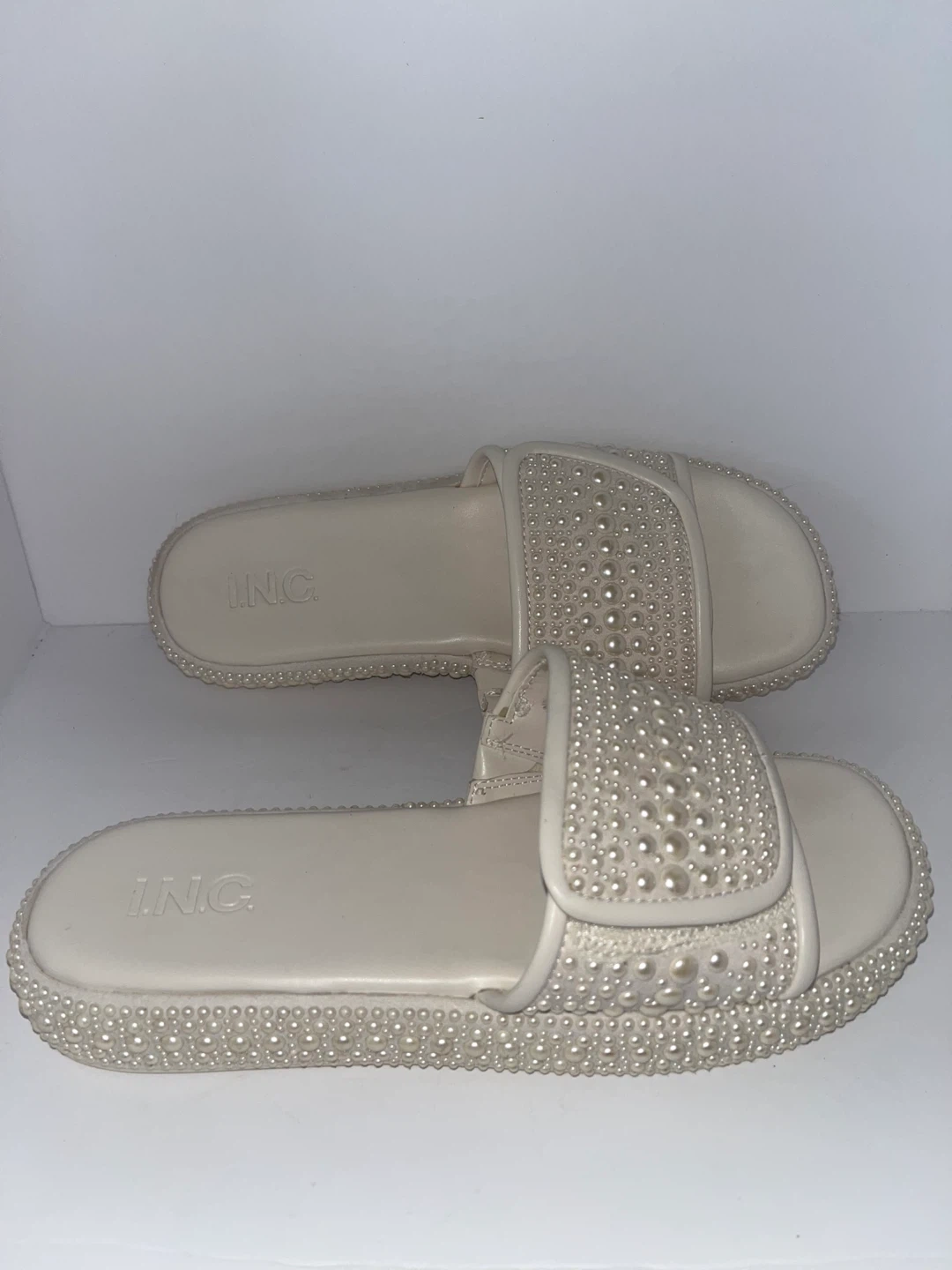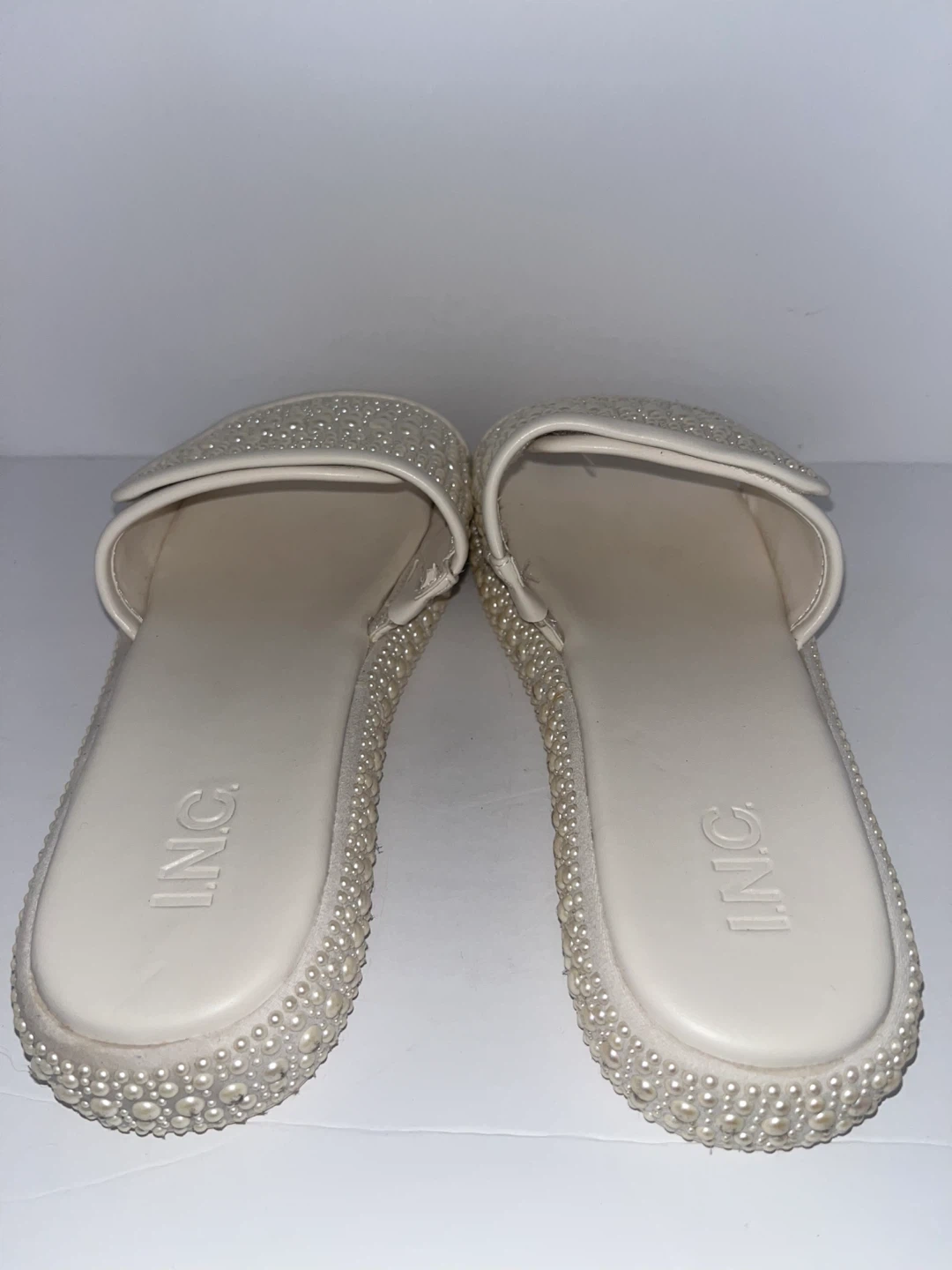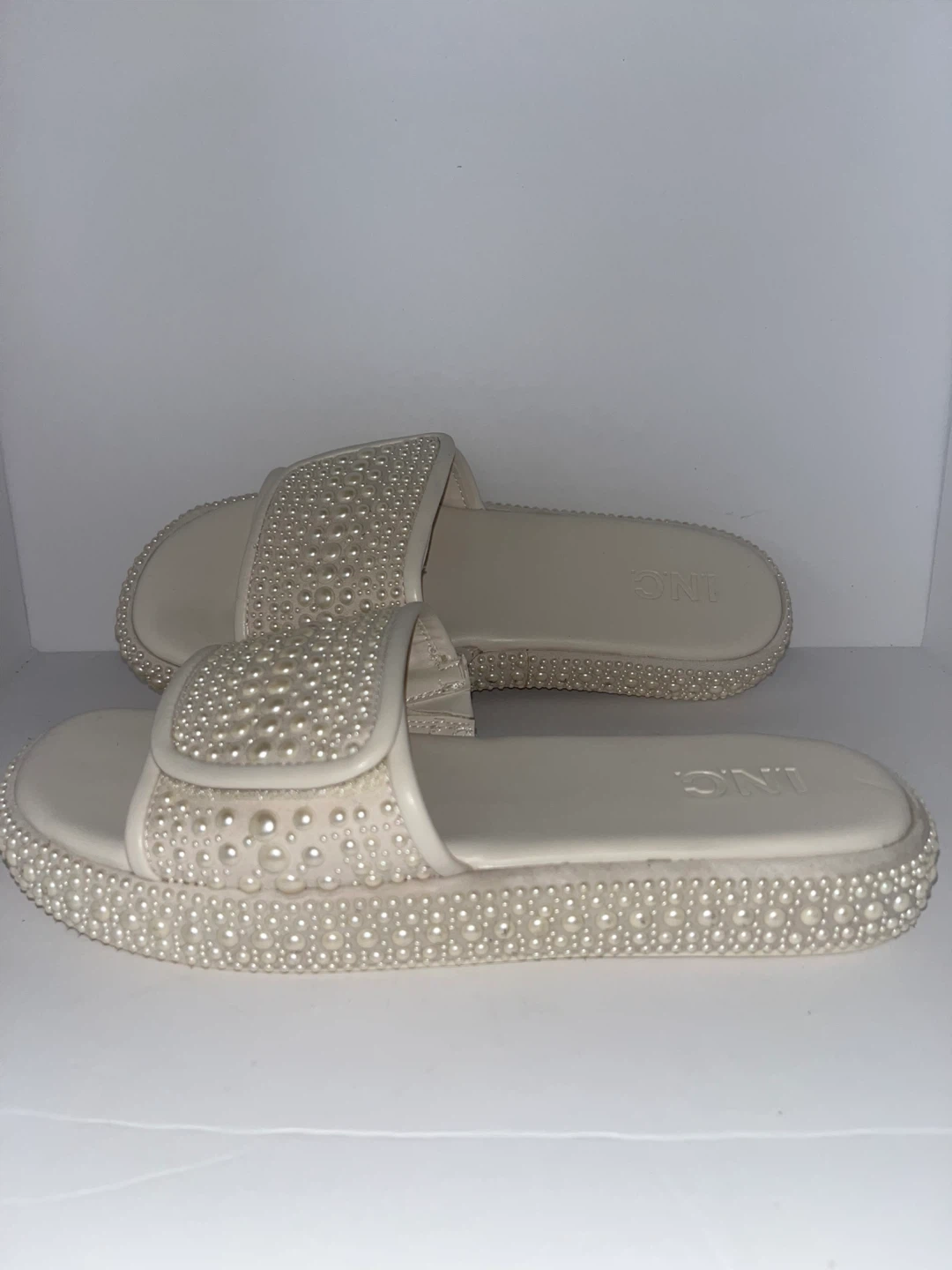 15These INC slide sandals are perfect for adding a touch of elegance to your casual outfits! They feature pearl embellishments that give them a unique and stylish look. They are in great condition and ready for a new home!
