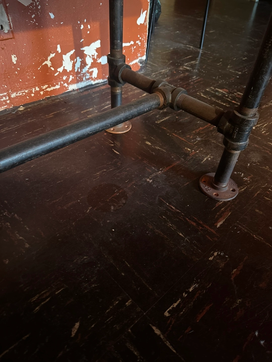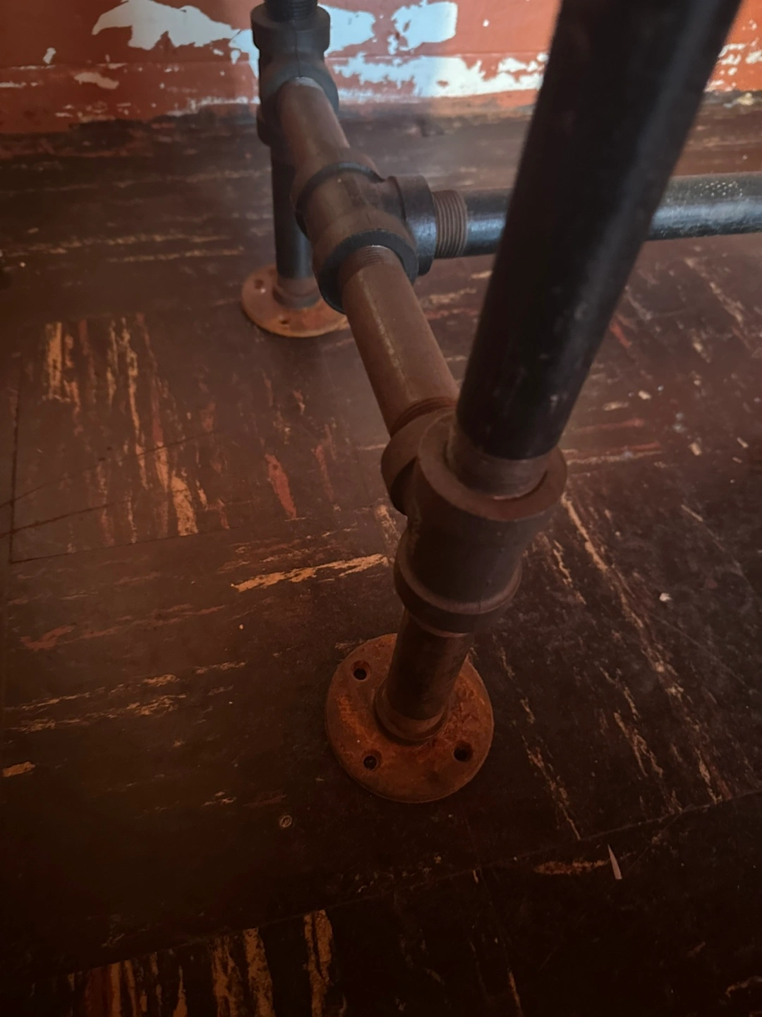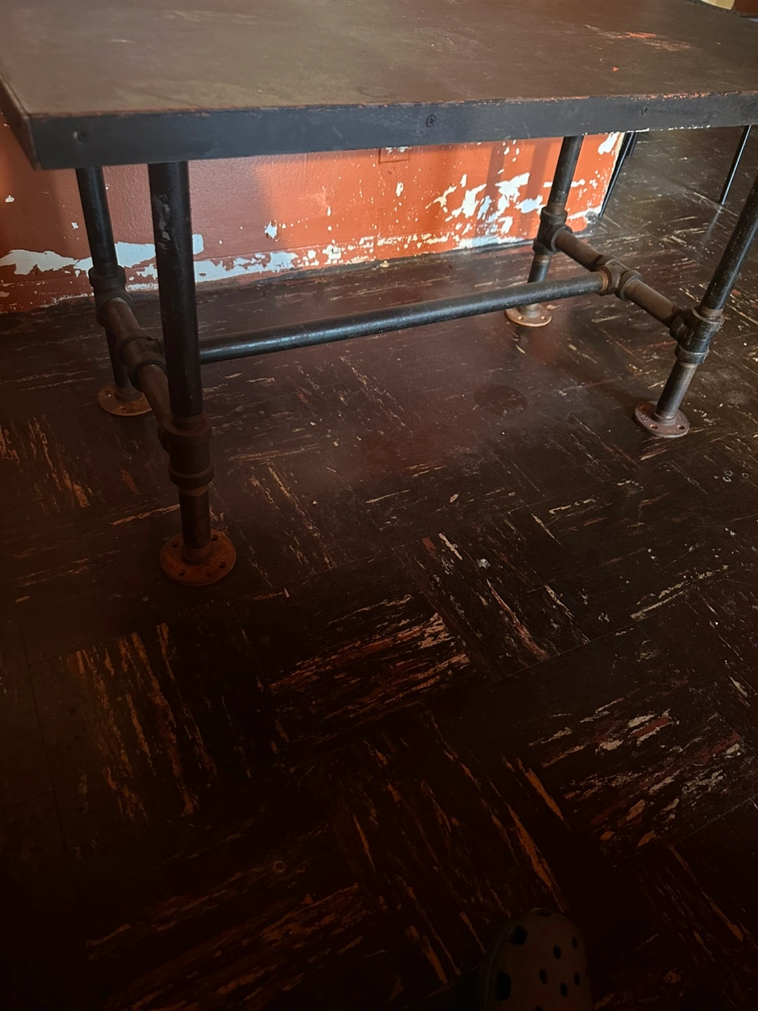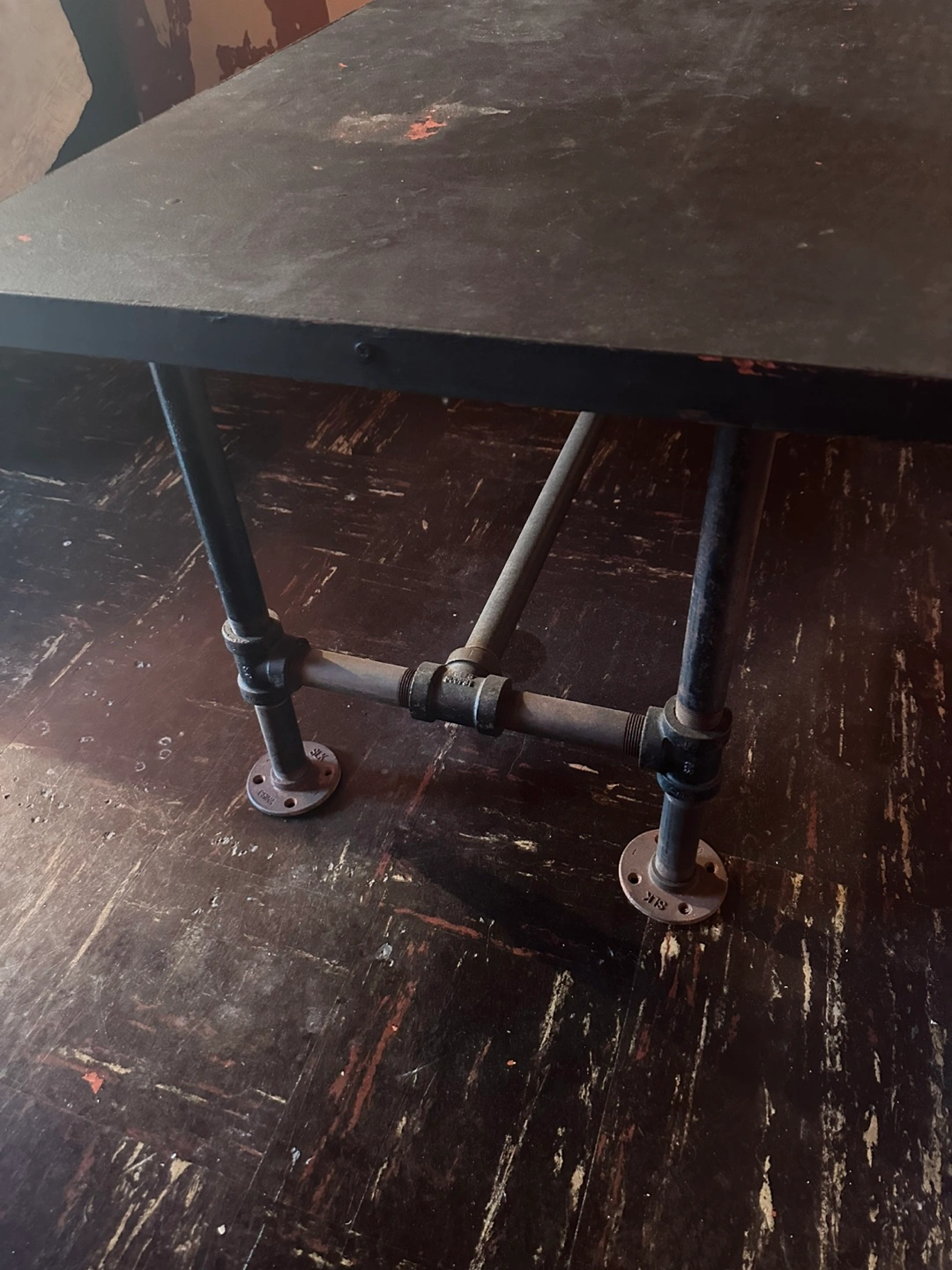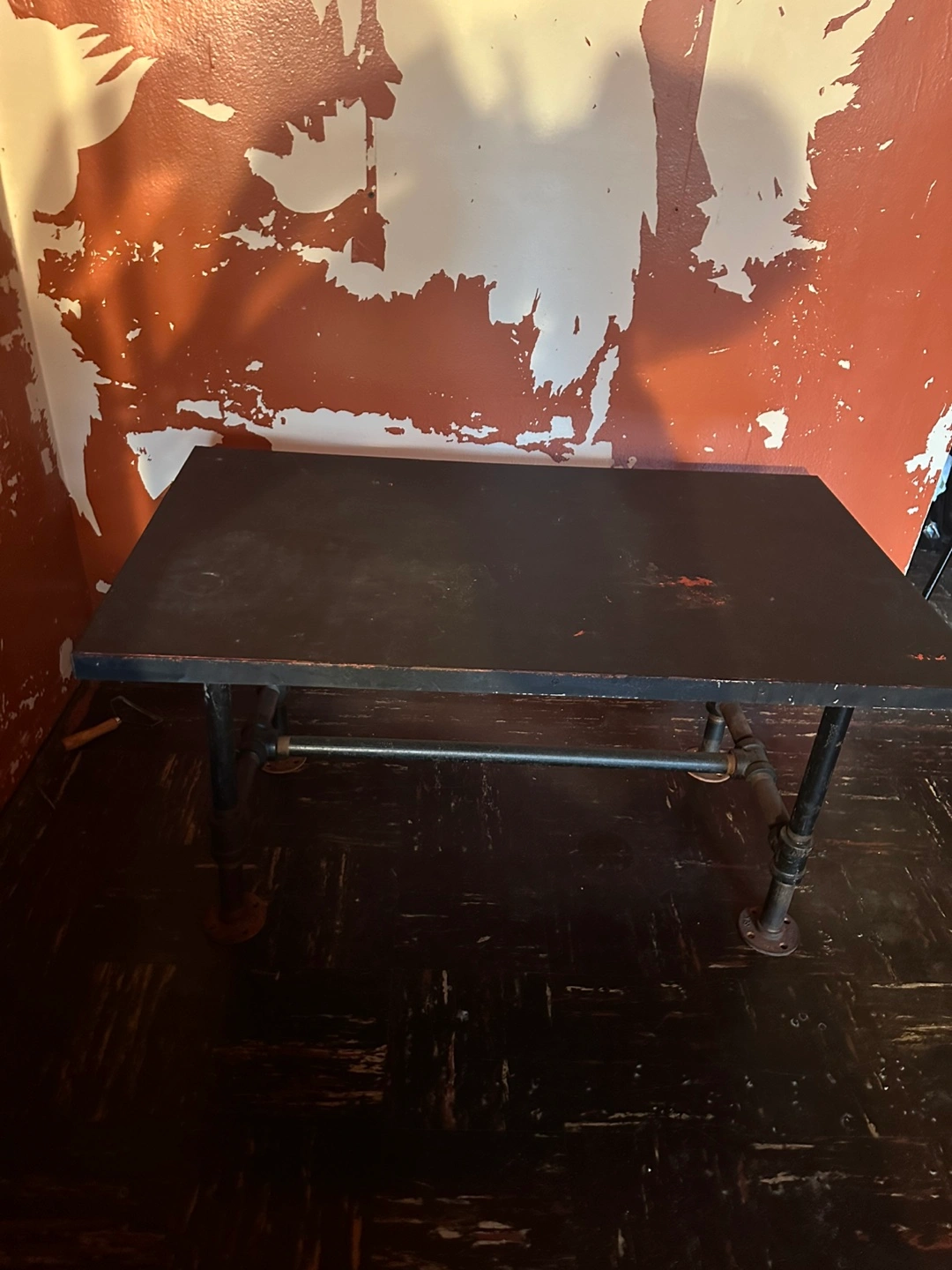 Black metal pipe legs. Dark brown rectangular top. Simple design. Good for industrial or rustic decor. Can be used however.. coffee table , decor, living room.. First come first serve ! 💪🏾