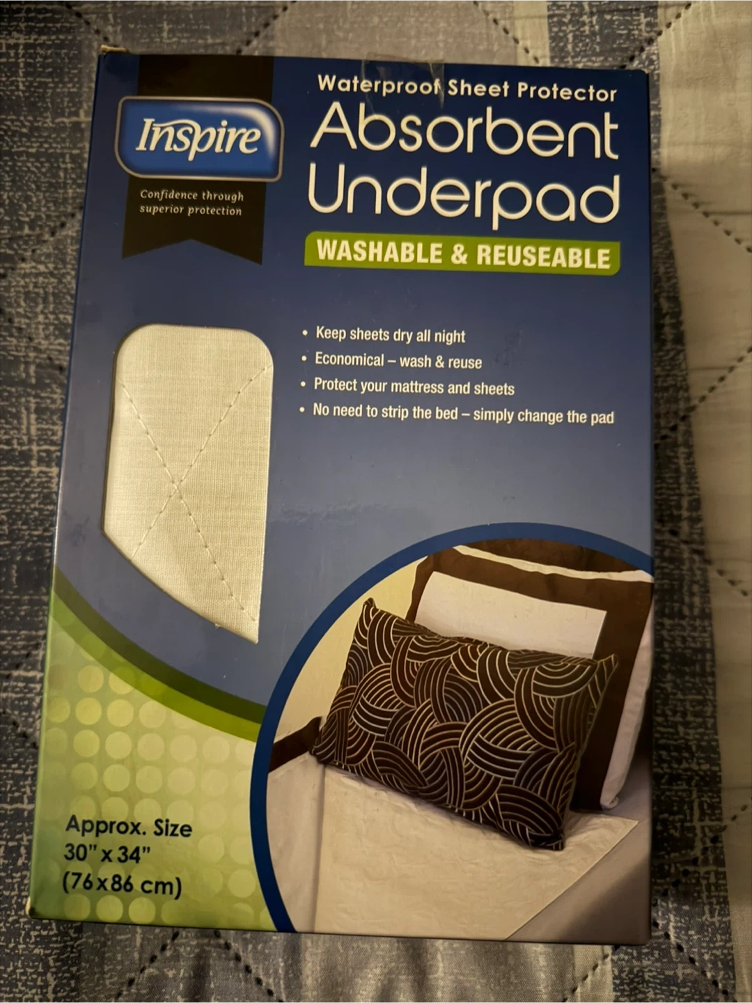 10Selling an Inspire Absorbent Underpad. It's a waterproof sheet protector, washable and reusable. Approximate size is 30" x 34" (76x86 cm). It helps keep sheets dry all night, economical to wash and reuse, protects your mattress and sheets, and you don't need to strip the bed - simply change the pad!