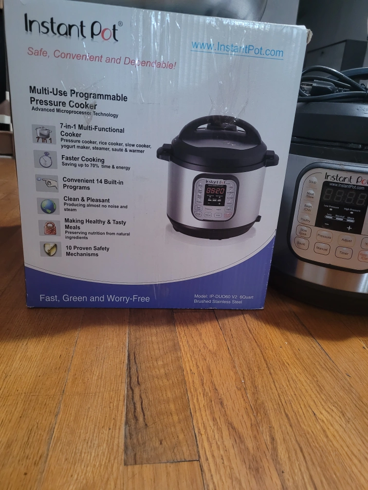 Selling an Instant Pot DUO60 V2 6-Quart. It's in great condition and comes with the box. This is a multi-use programmable pressure cooker with 7-in-1 functionality, including pressure cooker, rice cooker, slow cooker, yogurt maker, steamer, and sauté pan. It features 14 built-in programs and 10 proven safety mechanisms.