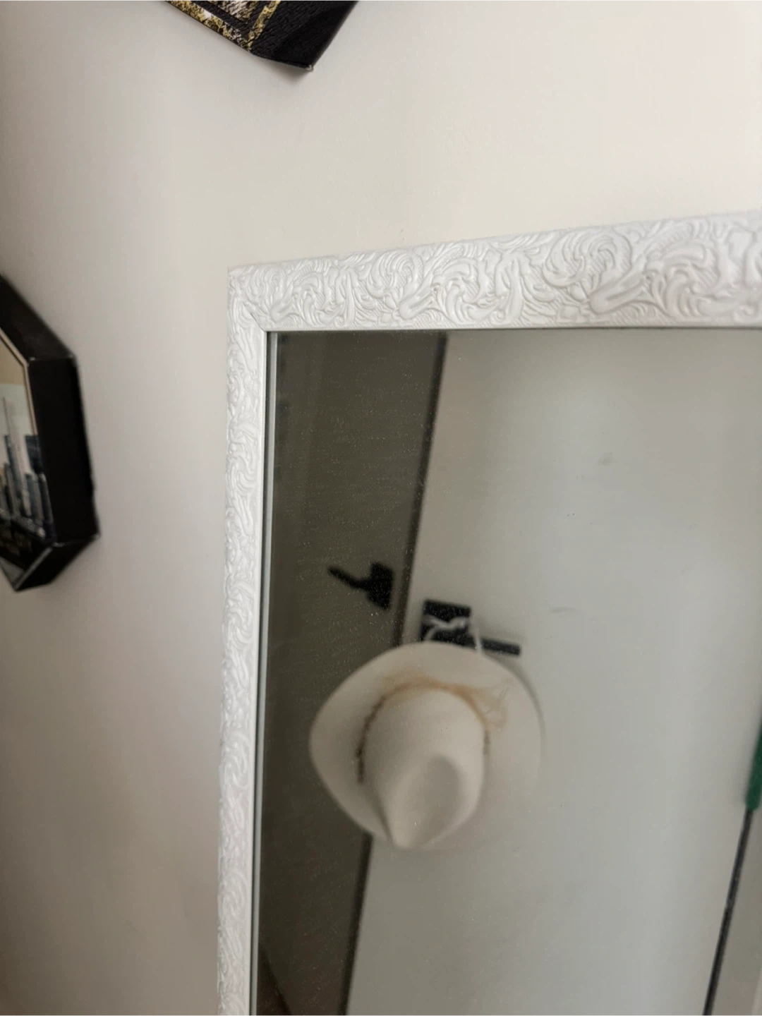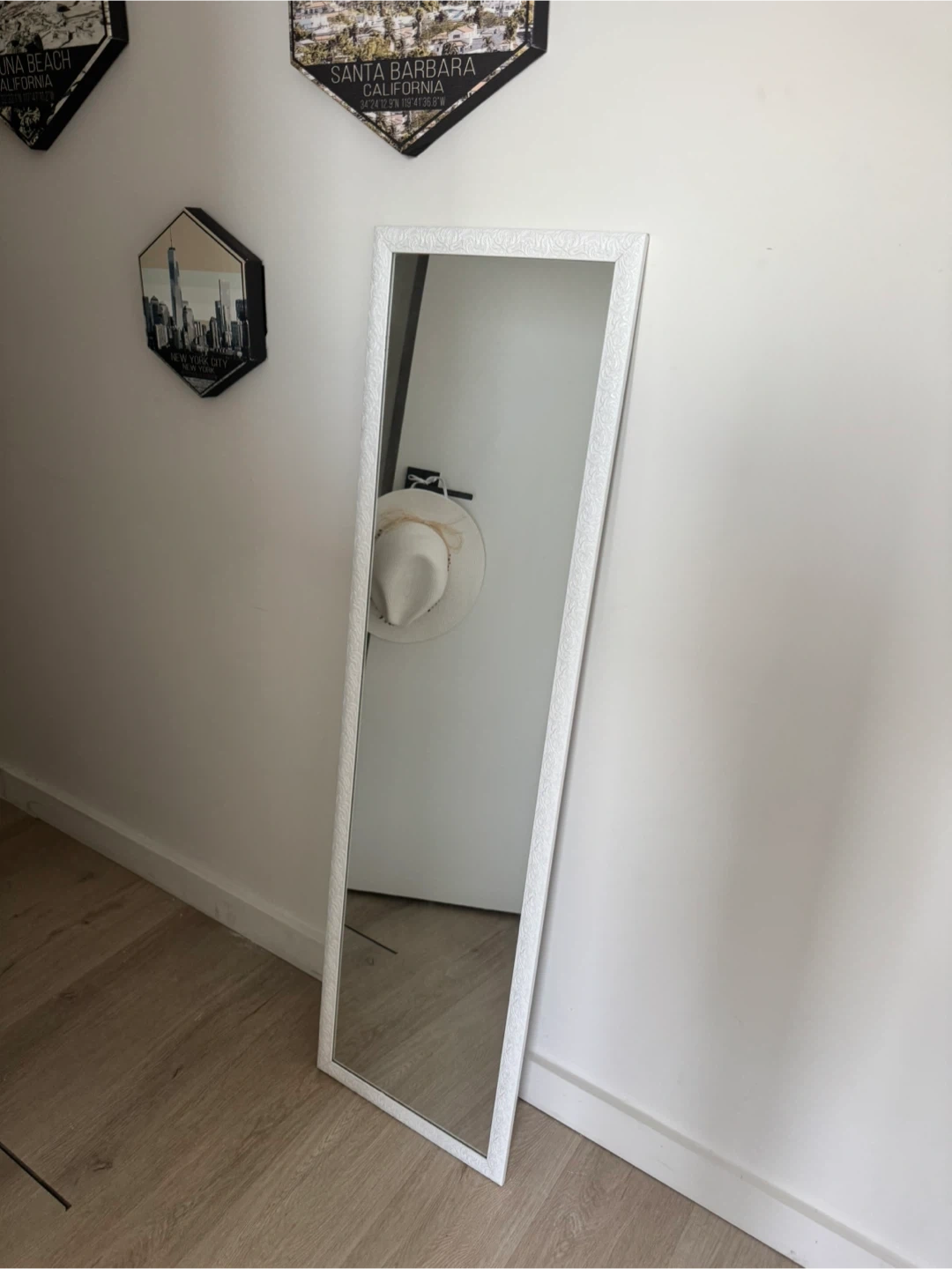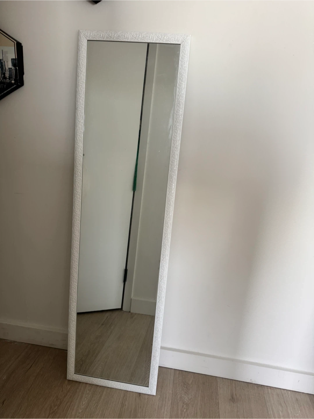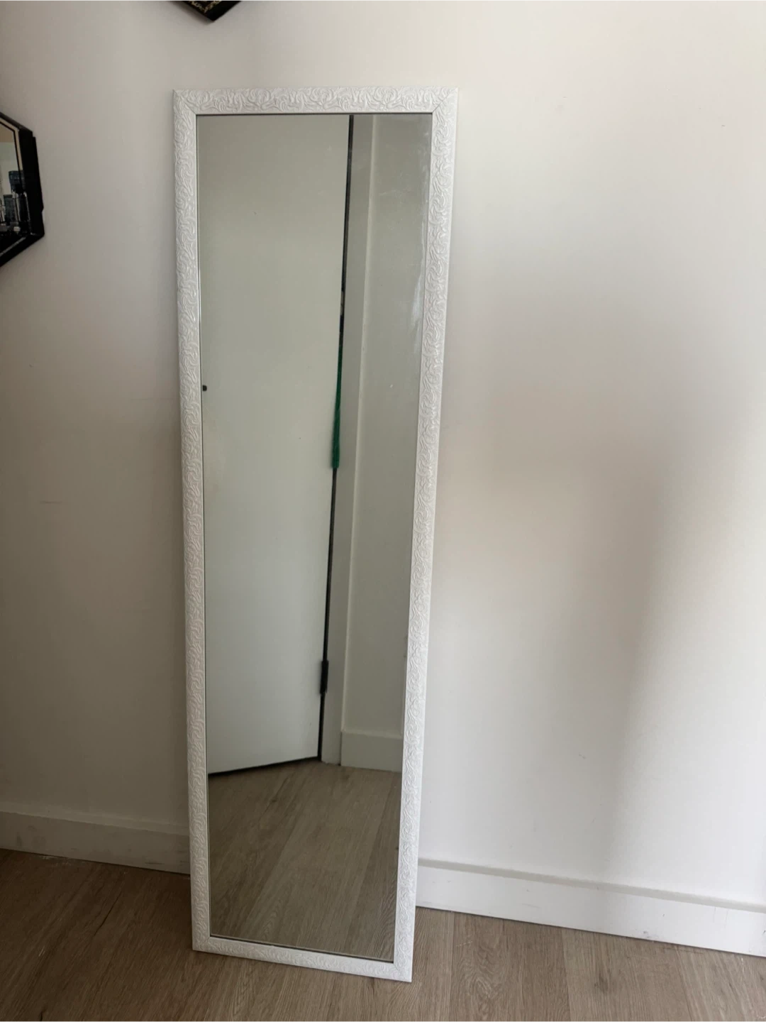 Selling a full-length mirror with a white frame. It's in great condition and ready to brighten up any room! The frame has a subtle, decorative pattern that adds a touch of elegance