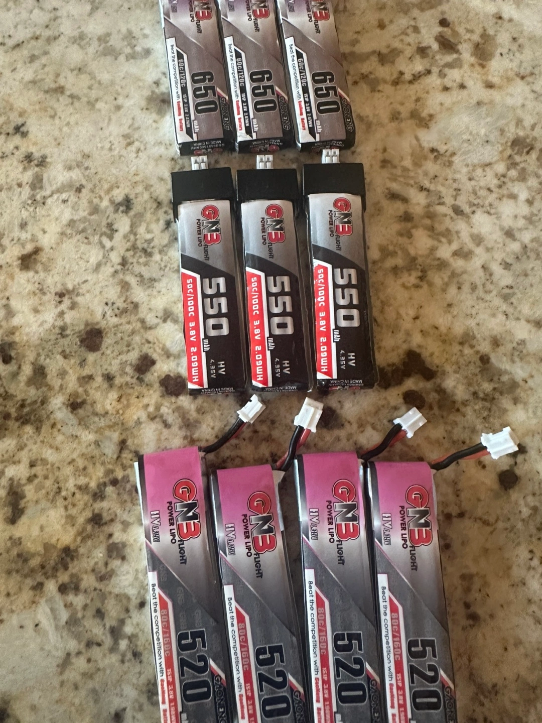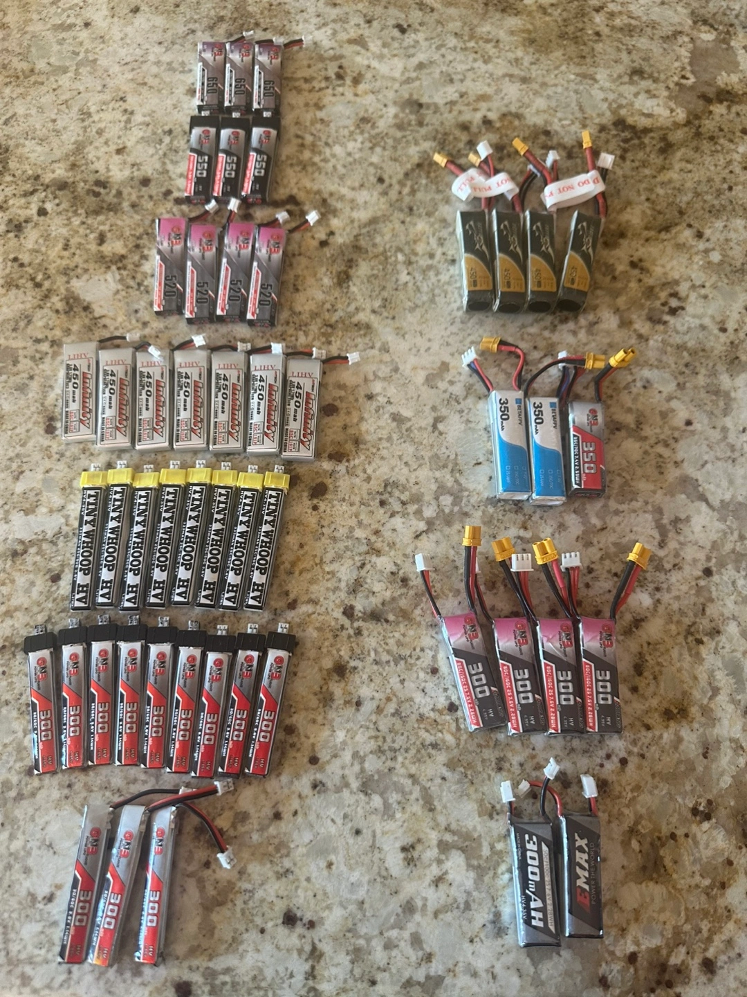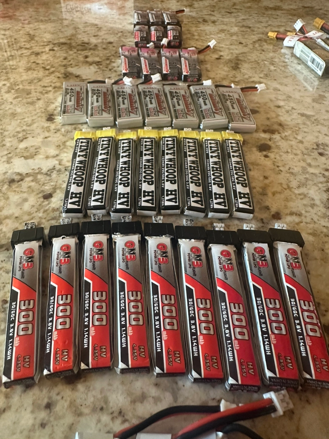 I have a selection of drone batteries for sale. Brands include GNB, Tattu, Emax, and Tiny Whoop. First come first serve. Different sizes available, including 300mAh, 350mAh, and 450mAh. Great for anyone into FPV drones or RC aircraft. Let’s make a deal
