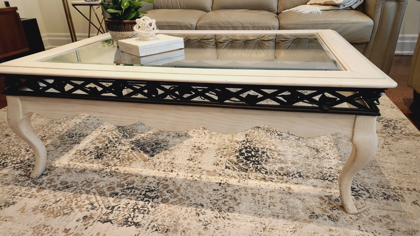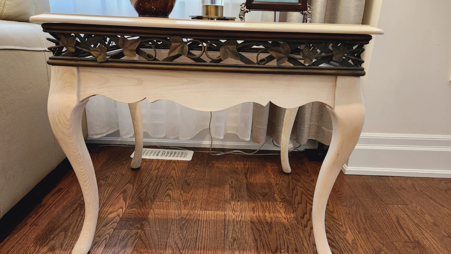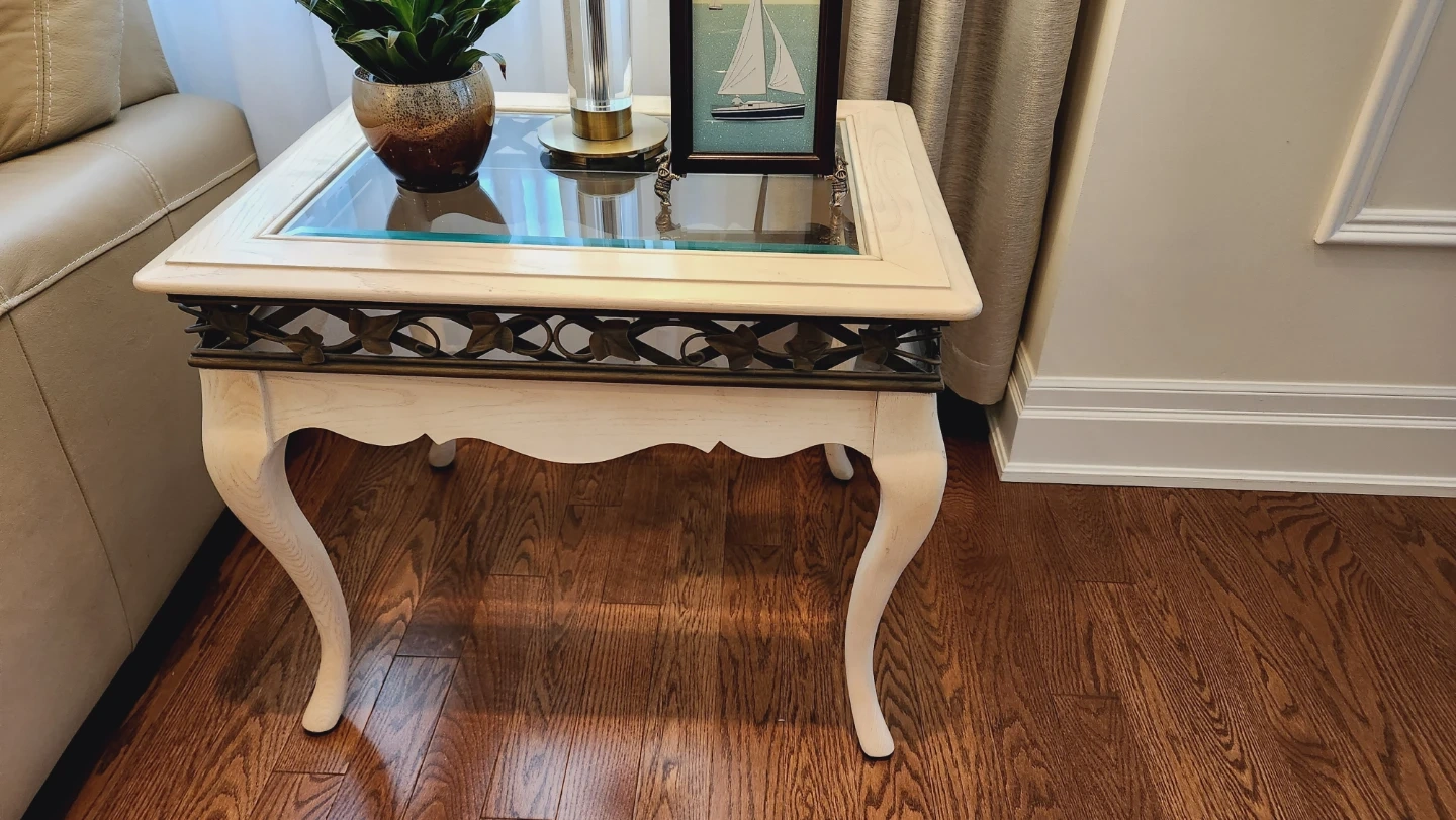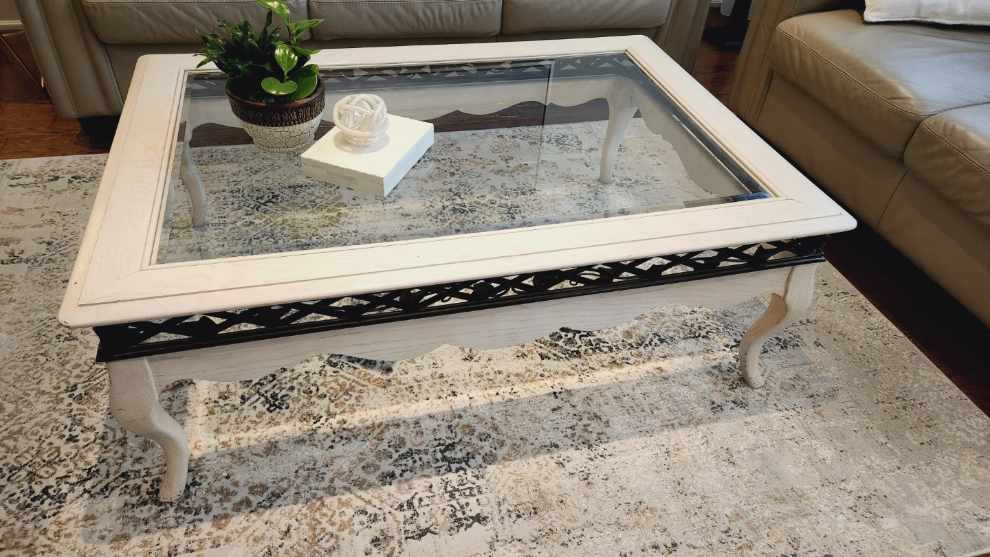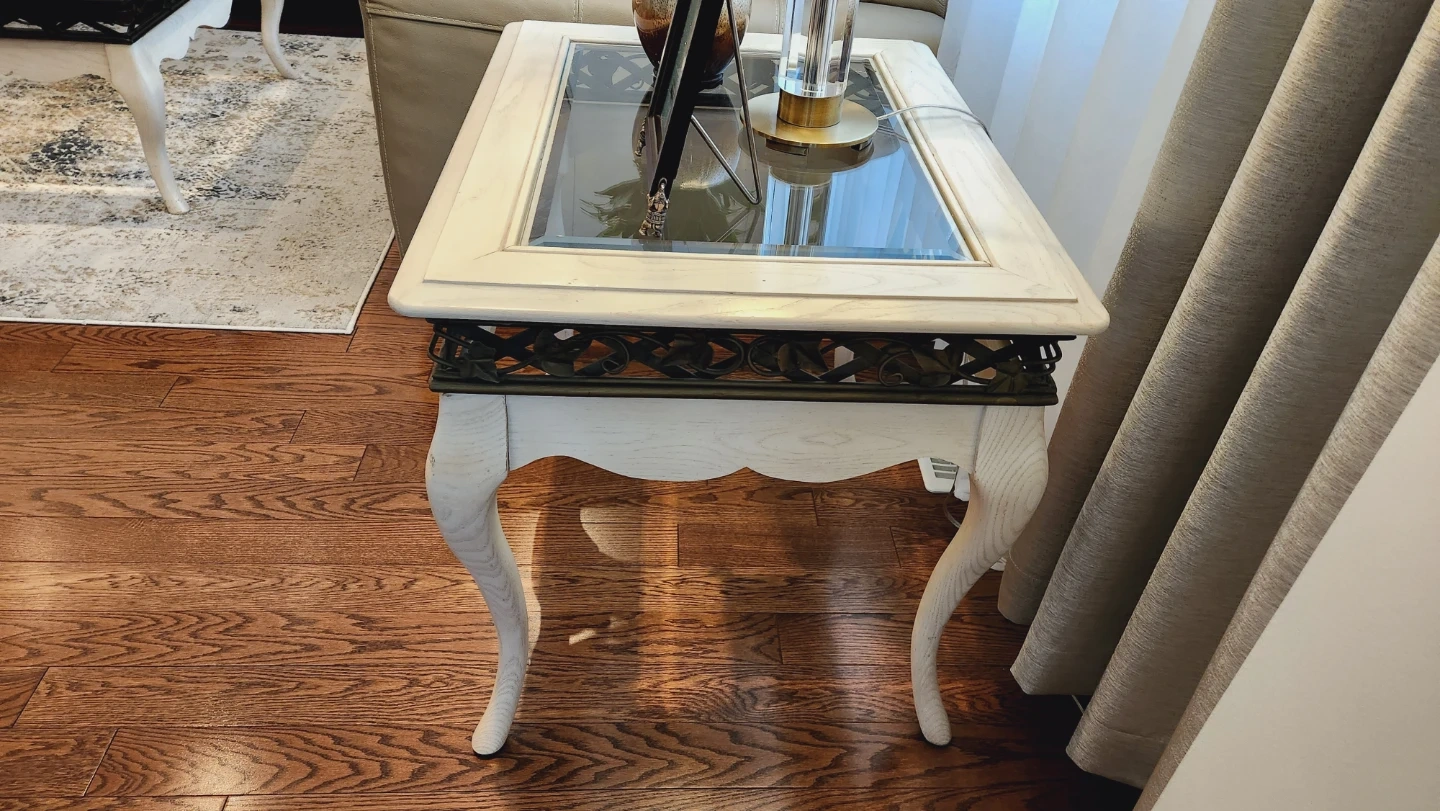 Selling a lovely glass top coffee table and matching end table set. The tables feature a unique design with decorative metal accents and elegantly curved legs. The light colour and glass top make them a great fit for any living room or sitting area
