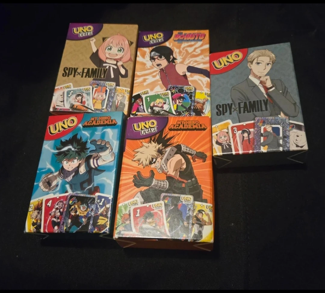 Grab this fun UNO Flip! card game bundle featuring popular anime series like Spy x Family, Boruto, and My Hero Academia. These decks are perfect for game nights and anime fans alike. Each game is a new adventure with exciting twists!