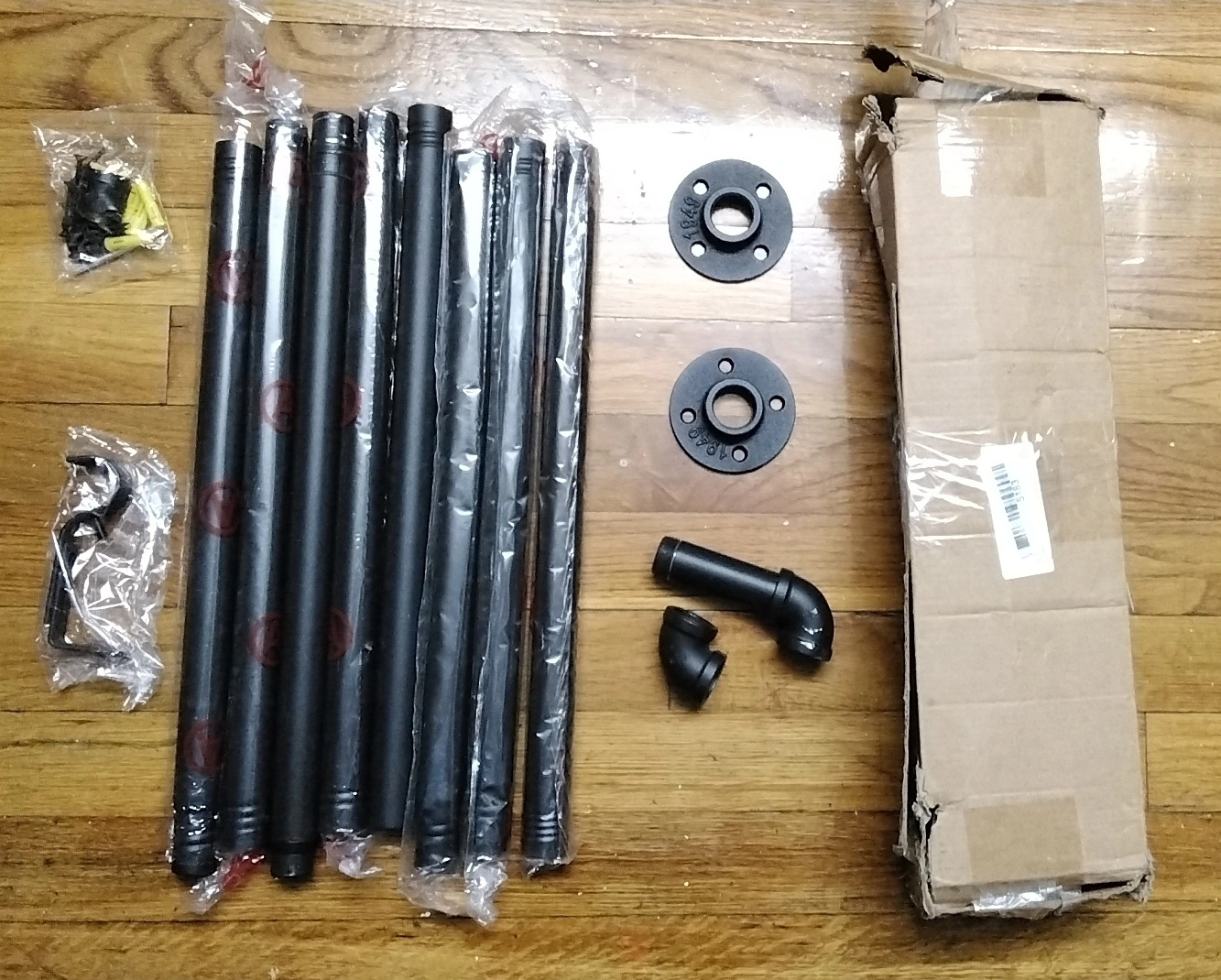 Unused shelf hardware kit. Includes pipes, pipe fittings, flanges, and hardware. Building your own shelf can be a satisfying and mindful project.