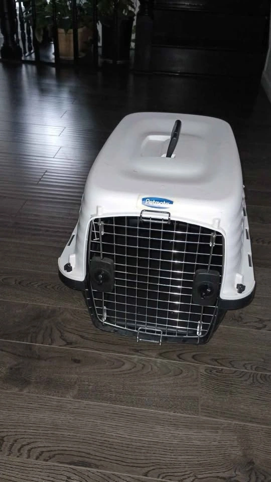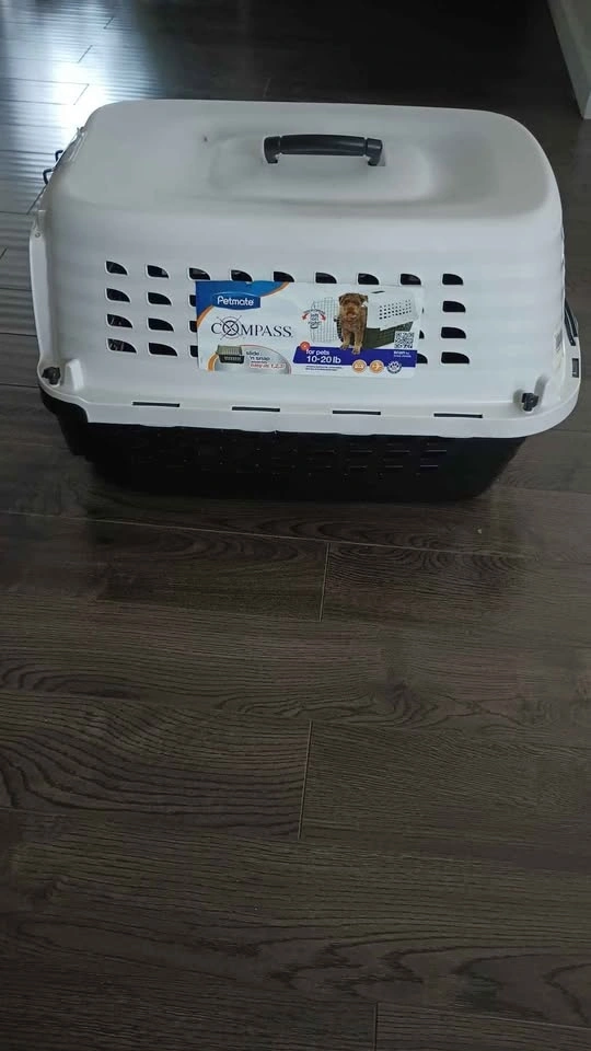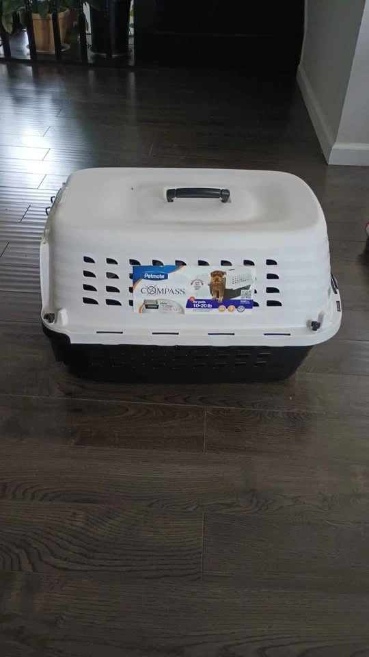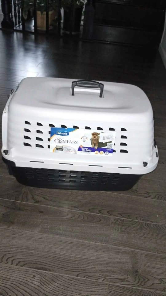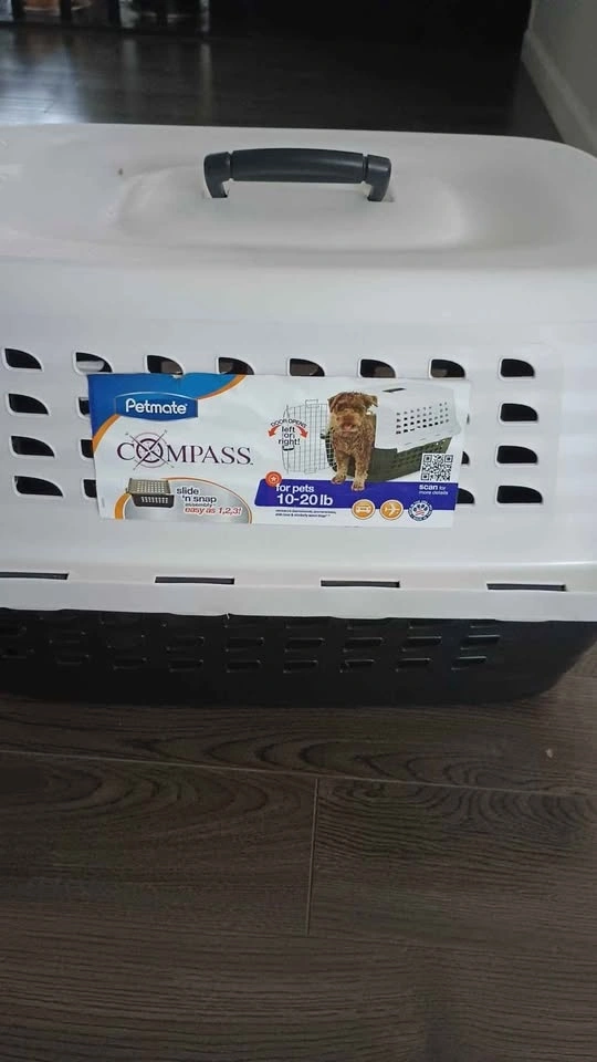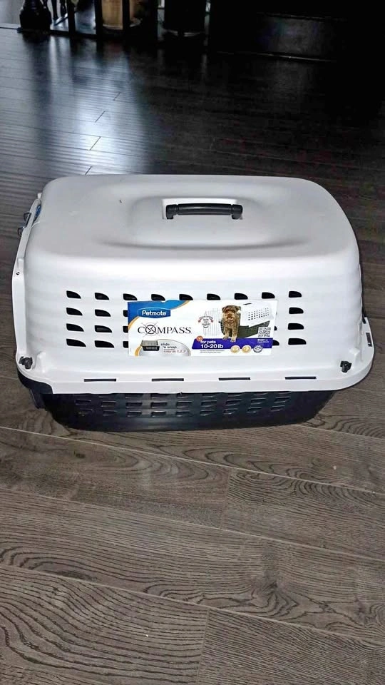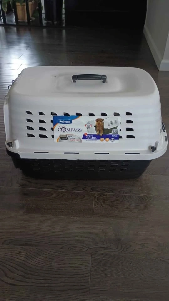 Petmate Compass pet carrier, designed for dogs or cats weighing between 10 and 20 pounds. Features a two-way opening door and twist latches.