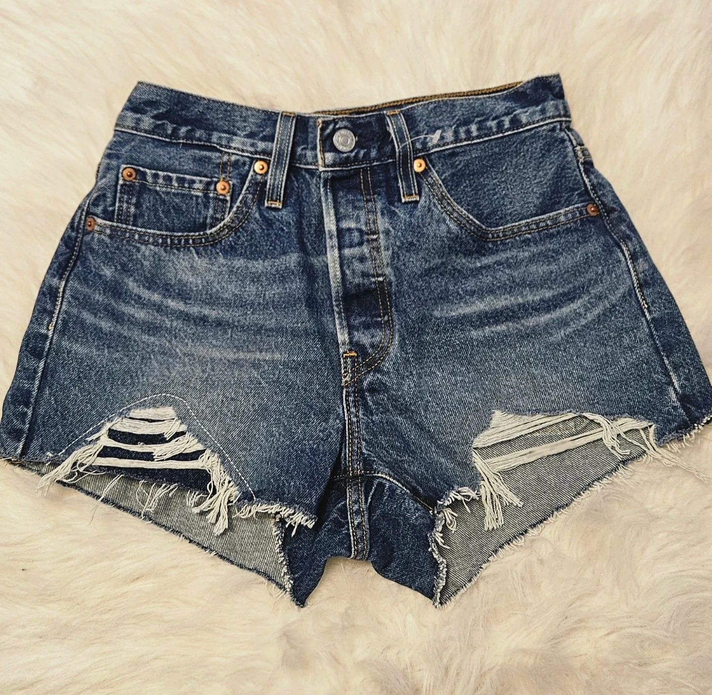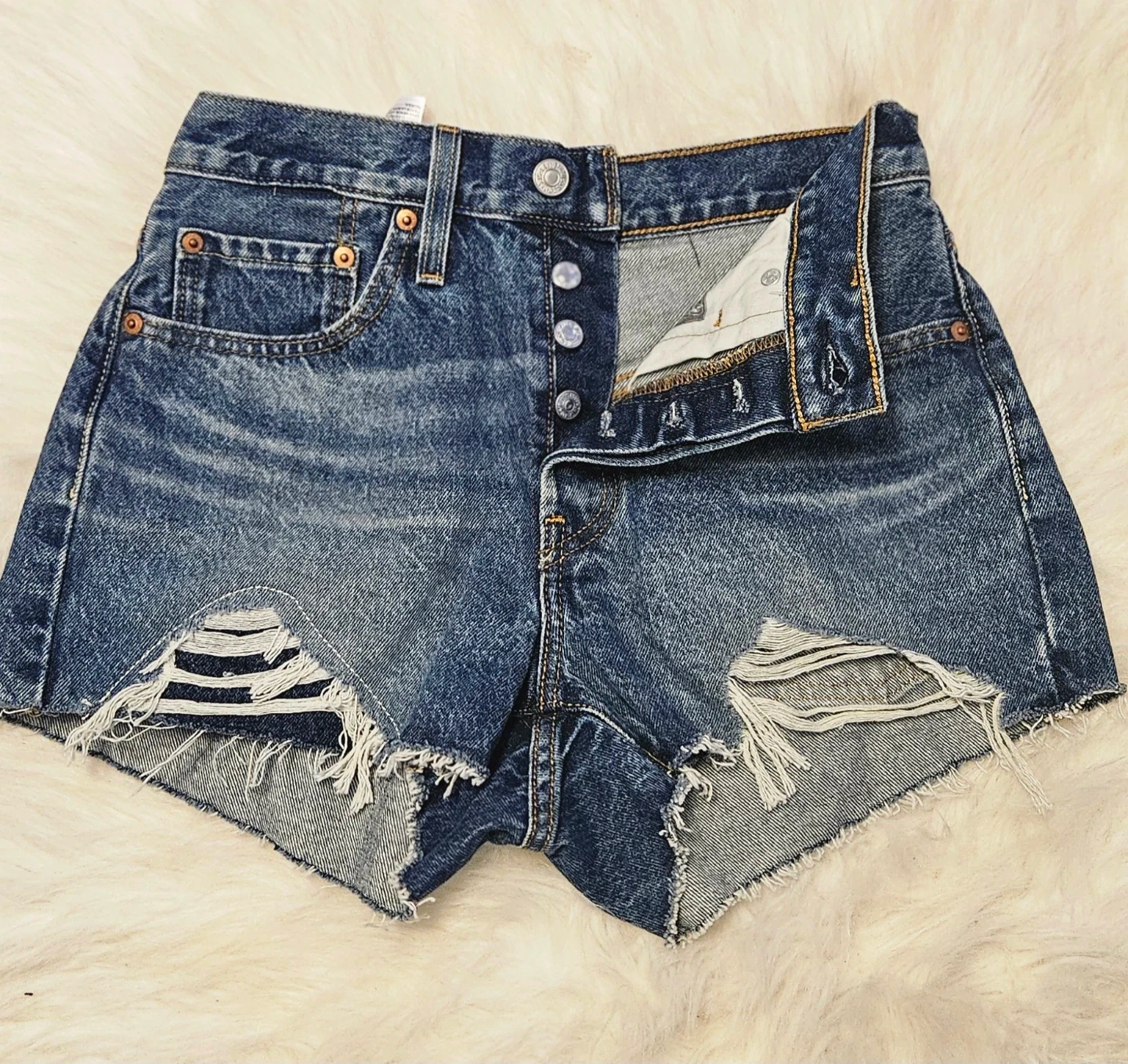 These are distressed Levi's 501 denim shorts in a classic blue wash. They feature a button-fly closure and frayed hem. These shorts are perfect for casual wear on warmer days!