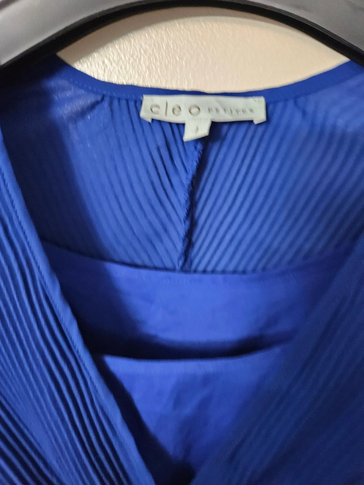 This is a lovely blue dress from Cleo Petites. It's a size small and features a beautiful pleated design. It would be a great addition to your wardrobe!