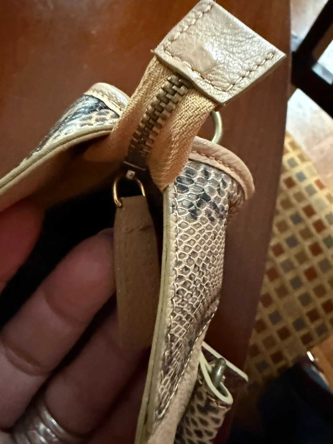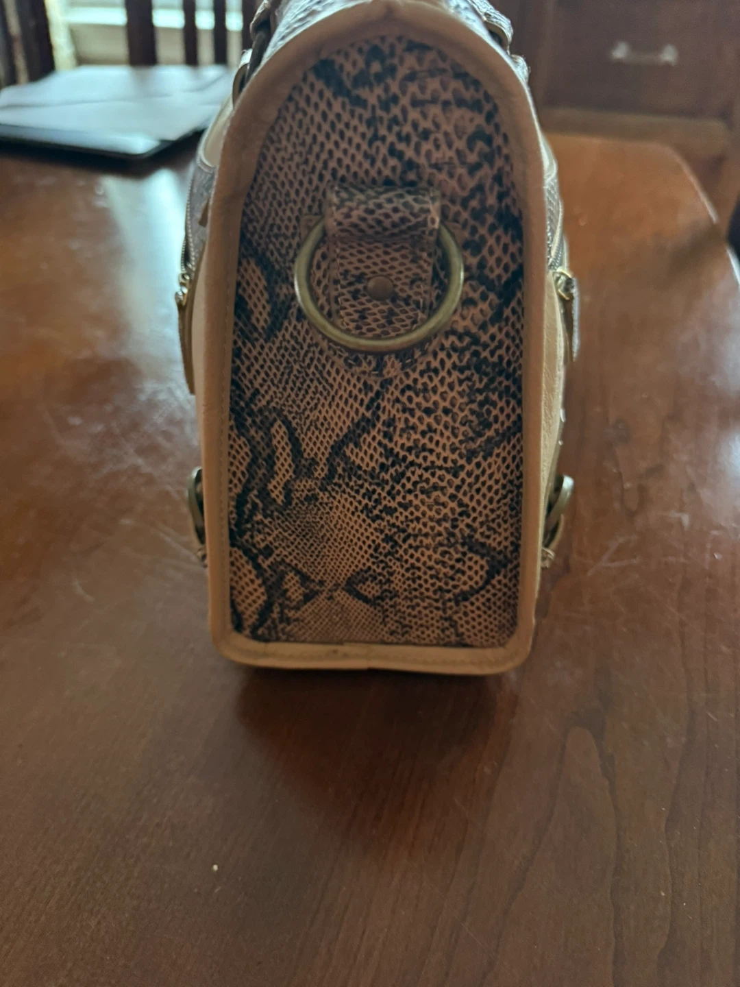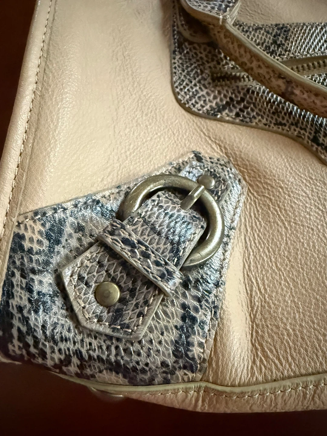 Stylish satchel bag in a neutral beige color. Features genuine leather with contrasting snakeskin patterned accents on the front and sides. It has a zip top closure and decorative buckle details.