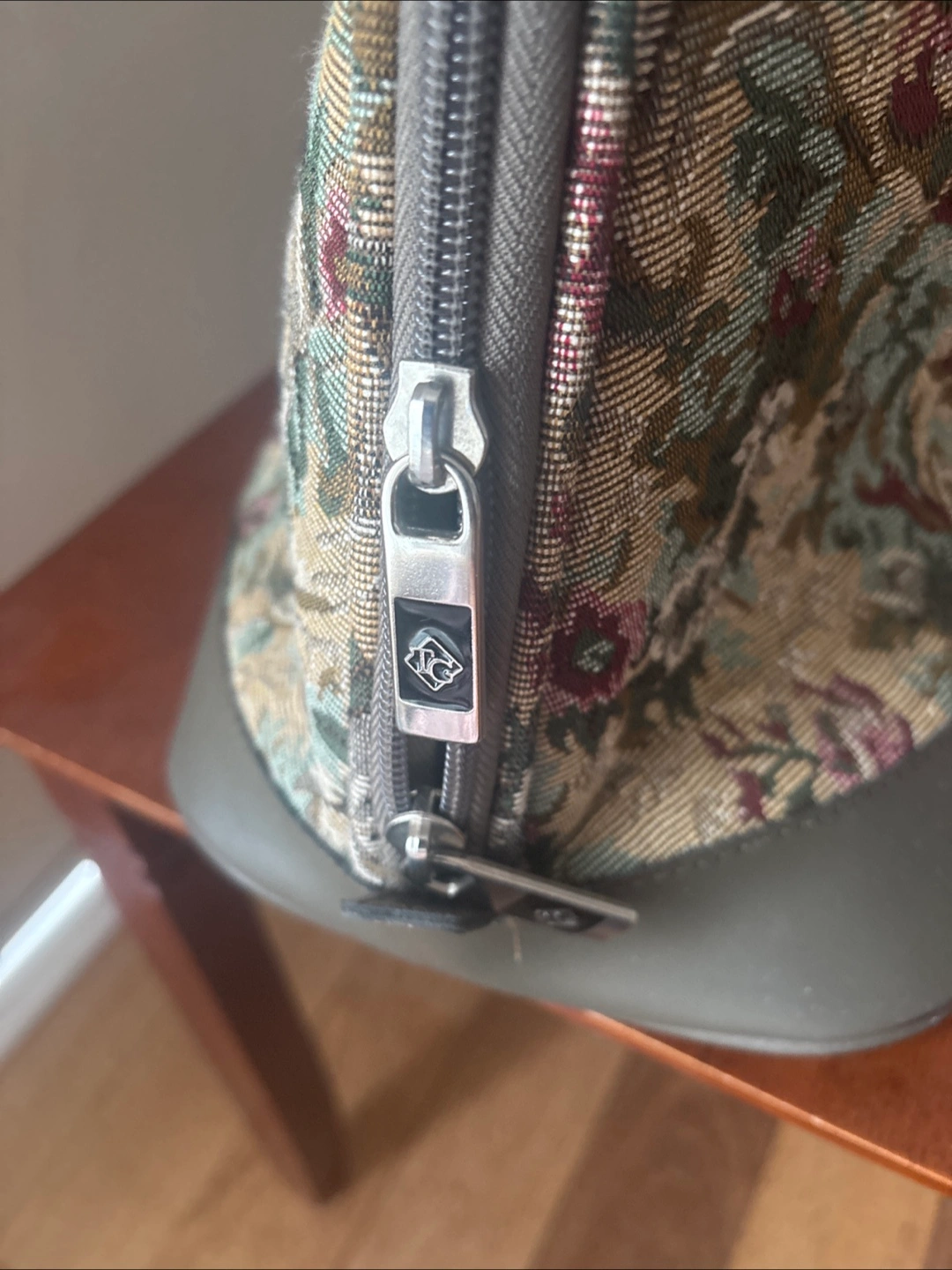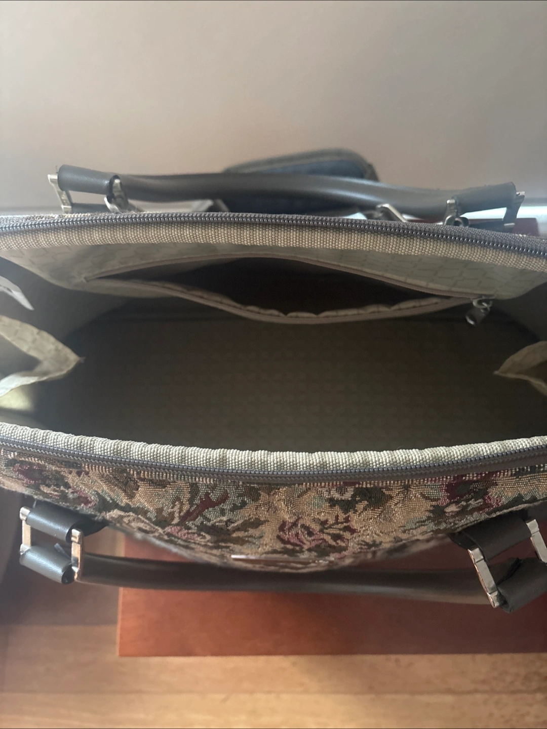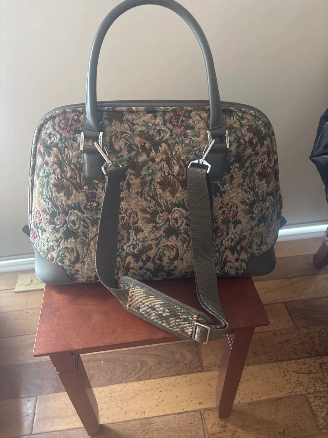 A floral patterned large bag with handles. Has a shoulder strap, with a top 2 zippers.It is a great choice for a weekend trip, bringing all your essentials.
